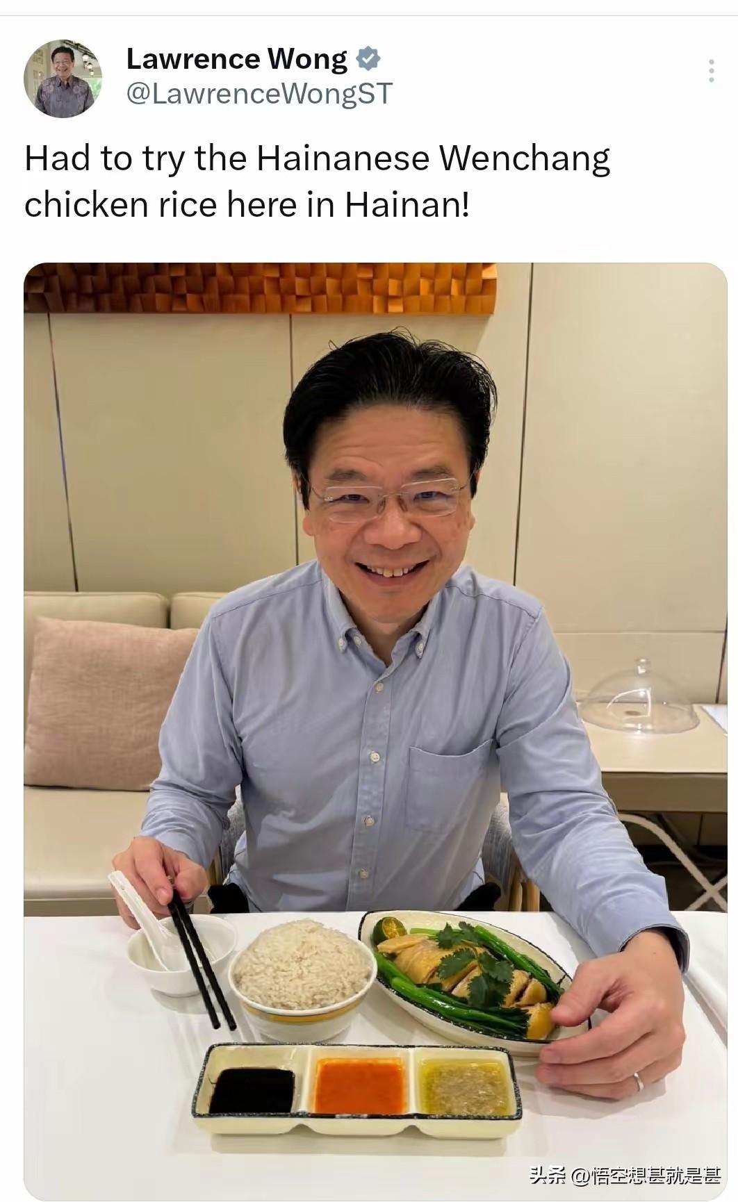 3月26日,新加坡总理黄循财通过自己的社交媒体发了一张在海南用餐照片,并配文说:“来了海南,必须得尝尝海南的文昌鸡饭。” 黄总理说话很实在,更是客观,其实我们的文化更是民族的瑰宝,希望可以在贵国国内得到顺其自然的传承和发展!(个人观点,不喜勿喷,谢谢!)