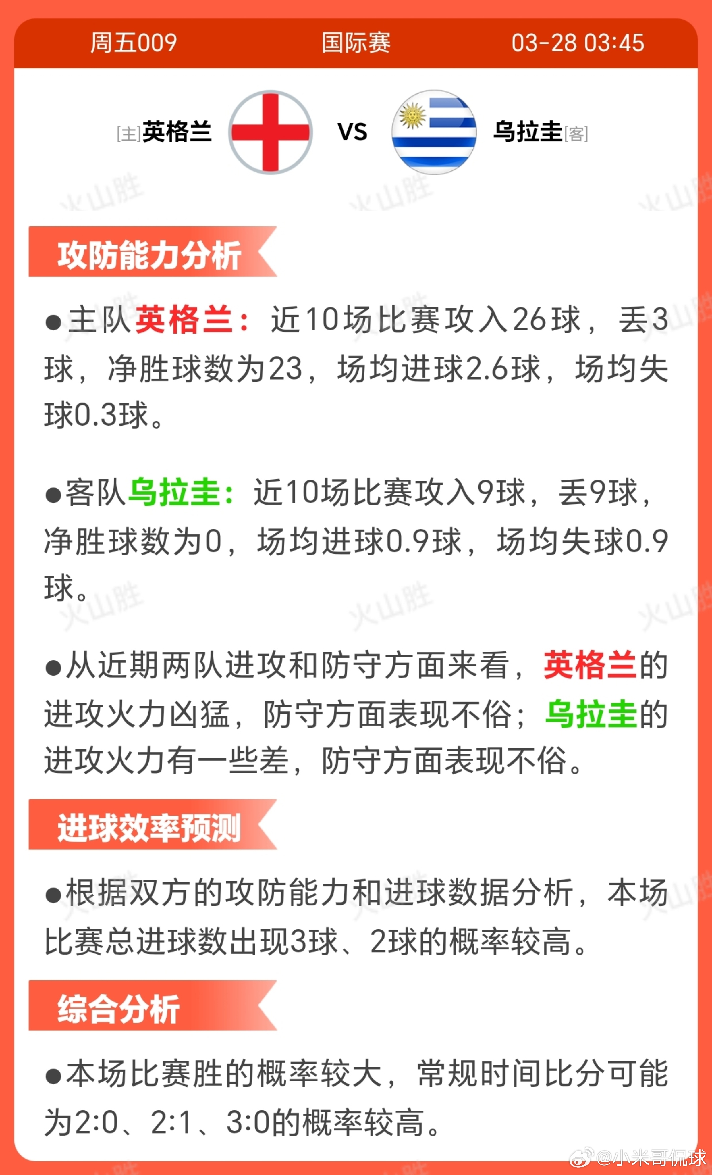 英格兰VS乌拉圭英格兰近期状态极为强劲,近十场比赛取得九场胜利,仅一负,显示出高度稳定性和上升势头,对士气的提振显著。 对比乌拉圭的表现波动,英格兰的稳健战绩为其带来心理优势,但作为主队需应对主场观众高期待的压力,尤其在对赛往绩中与乌拉圭近两次交锋各胜一场,此平衡可能增加比赛中的专注需求,避免因松懈而失分。 足球 乌拉圭近十场比赛胜负平局交织,战绩起伏不定,状态稳定性弱于对手英格兰。 对赛往绩中,近两次交锋各取一胜,显示乌拉圭具备抗衡实力,这可能为其带来心理支撑,缓解对强敌的畏惧。 然而当前波动表现加大了心理压力,需在比赛中证明自我,防止状态不佳导致关键失误。足球预测