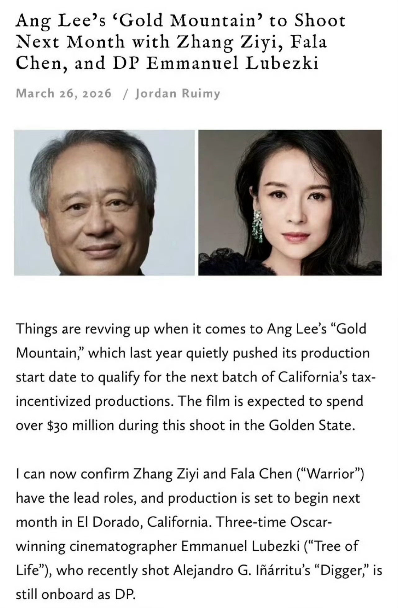 李安执导,章子怡和陈法拉主演的新片《金山》即将在美国加州开机。这将是继《卧虎藏龙》后,李安导演与章子怡时隔26年的再次合作。