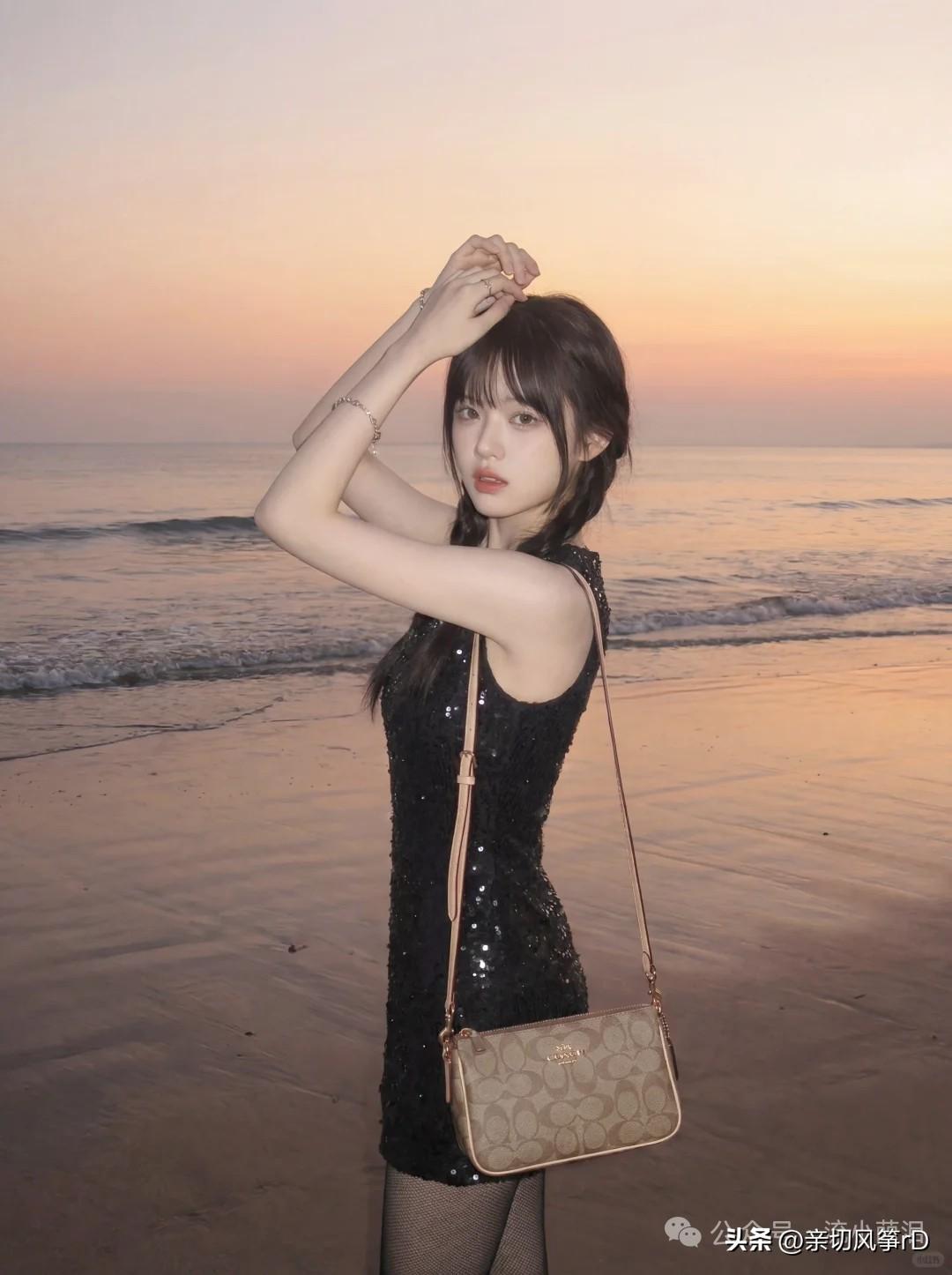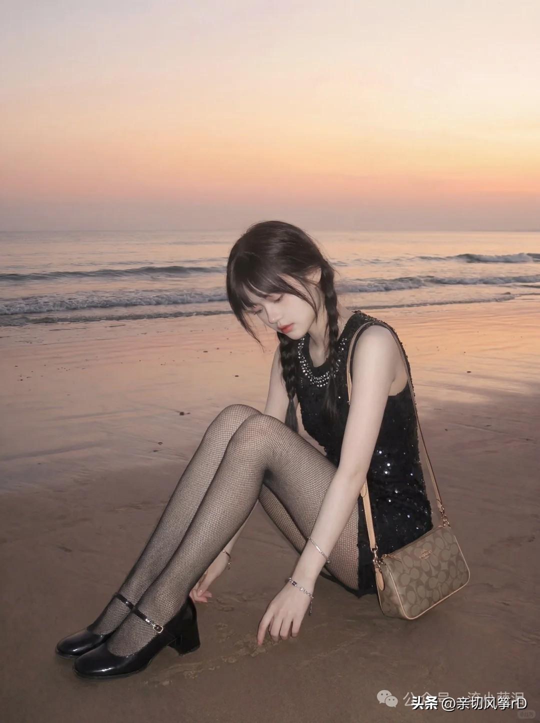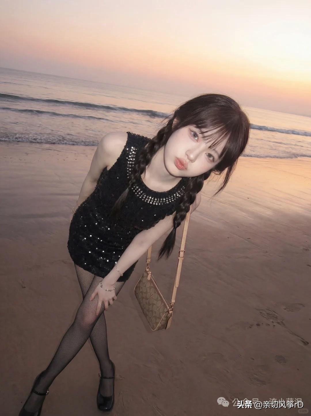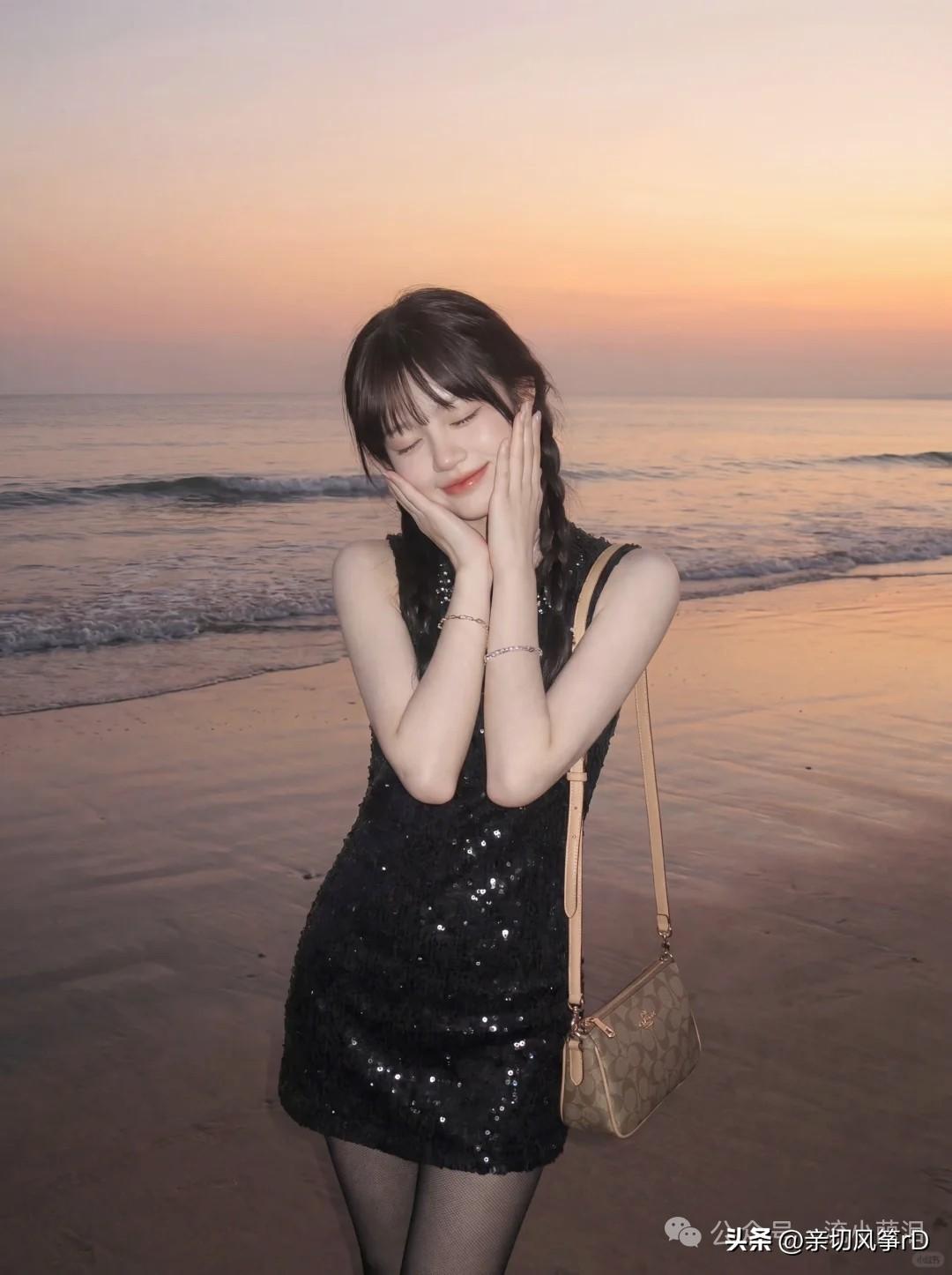 海边漫步,优雅黑裙,闪耀日落