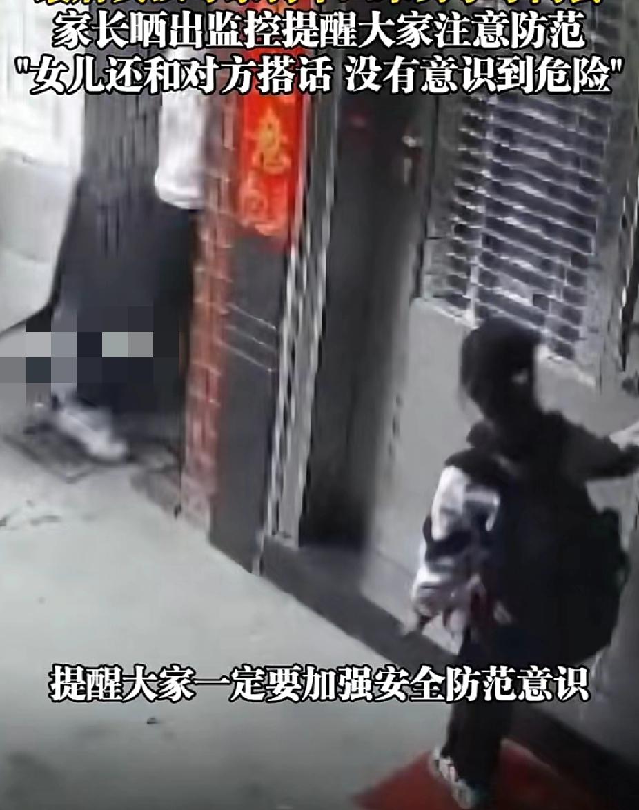 后怕!男子从学校一路尾随女孩到家门口,不断招手言语诱骗女孩跟自己走!女孩母亲回来男子慌忙逃走! (信息来源:中安在线) 2026年3月26日下午,广东汕头一女孩放学回家,被一名穿白色卫衣的男子一路尾随到家门口。 女孩自始至终并没有察觉到任何异样,以为帽子只是恰巧与自己同路。没想到女孩到家后按门铃等家人开门的时候,男子竟然不断朝女孩招手示意女孩跟着自己走。 女孩正犹犹豫豫不知道该不该跟着男子离开时,女孩的母亲骑着车子到了家门口,母亲赶紧招呼女儿。男子见状便离开了! 女孩妈妈赶紧询问女儿怎么回事,女孩支支吾吾也没说出来什么,但女孩妈妈总觉得事情不对。查看家中的监控视频才发现,男子行为异常,似乎是一路跟着女儿到了家门口,还试图让女孩跟着自己走,期间女儿还和男子说了话,对方多次言语诱骗女孩跟自己走! 女孩妈妈越想越后怕,她不敢想如果自己没有及时回家发现,女儿是不是就跟着陌生男子离开了。更可怕的是,单纯的女孩自始至终都没有意识到危险! 于是妈妈将视频发到网上,提醒大家,一定要给孩子做好安全教育,不和陌生人说话,不吃陌生人的东西,更不要和陌生人离开!令人后怕的事件
