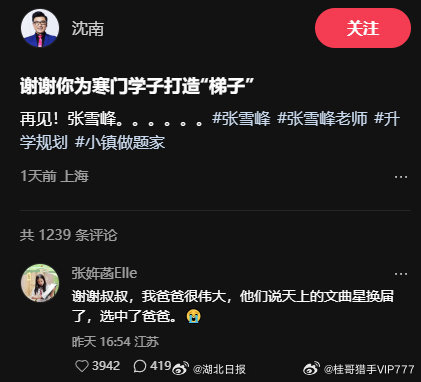 张雪峰女儿发文回复:谢谢叔叔,我爸爸很伟大,他们说天上的文曲星换届了,选中了爸爸😭引网友泪目。