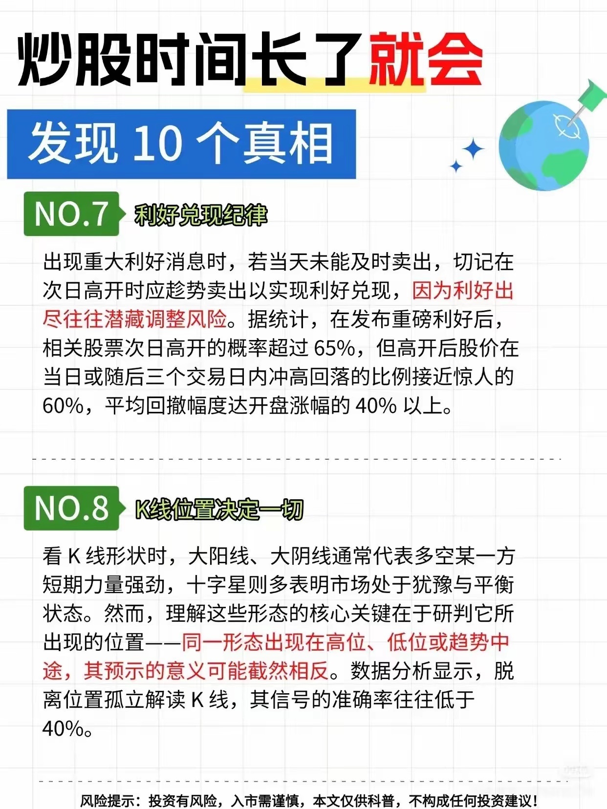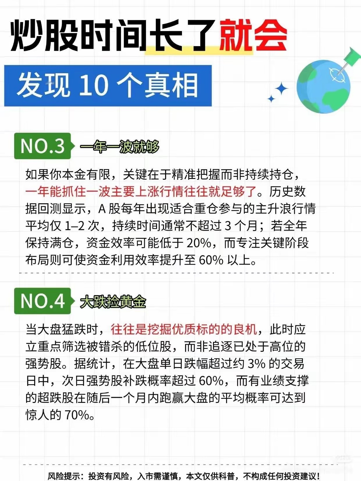 炒股时间长了,会发现的多个个真相!且看图解!炒股时间长了,还真能发现不少真相。就说第一个,长期投资基本立于不败之地。股神巴菲特就说过“从长期来看,股市终将传来好消息”。20世纪美国历经两次世界大战、大萧条等众多危机,道琼斯工业平均指数仍从66点涨到11497点。后来又克服金融危机、疫情等挑战,截至某周四收盘,道指报34912点,离历史高点只差2%。而且不用等百年,从1926年的历史数据看,投资者也能获得正回报。这说明长期投资能穿越各种困境,是在股市积累财富的好办法,别总想着短期暴富,那风险可太大了。