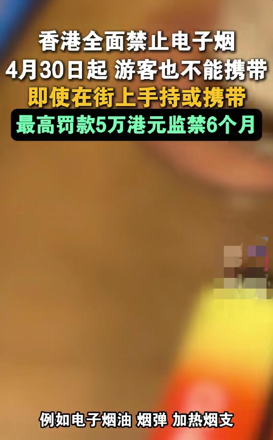 注意!再过一个月,香港将全面禁止电子烟,游客也不能带!违例者罚3000港元起,最高罚5万及监禁6个月 再过约一个月,香港控烟新规将正式落地。自2026年4月30日起,香港将全面禁止在公众地方管有电子烟、加热烟、草本烟及其配件等“另类吸烟产品”,访港旅客亦严禁携带此类产品入境。违例者将面临定额罚款3000港元;若管有数量较多或涉及商业用途,最高可被罚款5万港元及监禁6个月。 核心禁令:从“禁吸”到“禁管有”,形成完整闭关 此次新规的关键,是将管控范围从过去的“禁止吸食”升级为全面禁止公众管有,构建起“禁售卖、禁吸食、禁管有”的闭环。 - 禁止公众管有:4月30日后,在街道、公园、车站、商场等任何公众场所,持有电子烟烟弹、烟油、加热烟支、草本烟及相关配件,即属违法。 - 携带即违法:游客入境时,无论是否自用,只要携带上述产品,都将被认定违例,海关会直接没收并处罚。 - 使用视同管有:在公众地方吸食,或携带已启动的电子烟,执法时会直接推定为“管有”,按违例处理。 罚款与刑罚:不同情形,不同后果 违例后果分三个层级,需特别注意: 1. 普通违例:非商业用途、管有数量未达标准,定额罚款3000港元(约合人民币2652元)。 2. 严重违例:管有数量较多,或用于商业用途,最高罚款5万港元,并处监禁6个月。 3. 游客特别提醒:无豁免通道,无论国籍与身份,均按同一标准执法,切勿心存侥幸。 政策背景:为何全面升级? 香港早自2022年便禁止另类吸烟产品的进口、售卖及商业管有。此次修订,是为填补“公众持有”的监管漏洞,进一步降低二手烟危害,保障市民与游客健康。特区政府已部署卫生署控烟酒办公室加强巡查,确保新规落地执行。 出行提醒:游客必看 1. 提前清理:计划赴港前,务必清理行李中所有电子烟及配件,避免入境受阻。 2. 不借不买:在港期间,不借用、不购买电子烟,也勿替他人携带,以免卷入“商业管有”嫌疑。 3. 遵守禁烟区:香港原有禁烟区(如幼儿中心、学校、医院周边3米范围)仍有效,4月30日后所有公众区域全面禁管禁吸。 4. 替代方案:可在香港指定吸烟区使用传统香烟(可免税携带不超过19支,超量需申报补税),或提前规划戒烟。 法律依据:触犯《吸烟(公众卫生)条例》 本次新规源自《2025年控烟法例(修订)条例草案》,相关条文明确:任何人不得在公众地方管有指明另类吸烟产品,违者须承担相应法律责任。含尼古丁的另类吸烟产品属第1部毒药,非法管有属严重违法行为。 最后提醒:别让侥幸变损失 香港执法严格,巡查密集,3000港元定额罚款与监禁记录,会给行程与个人信用带来长期影响。赴港游客请务必提前做好准备,严格遵守新规,共同维护香港的公共健康环境。香港治安处罚 香港吸烟罚款 电子烟量刑 香港吸烟区
