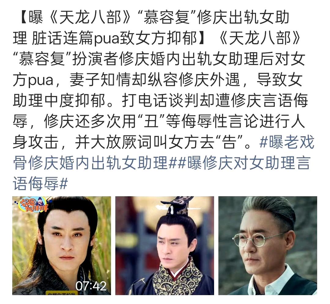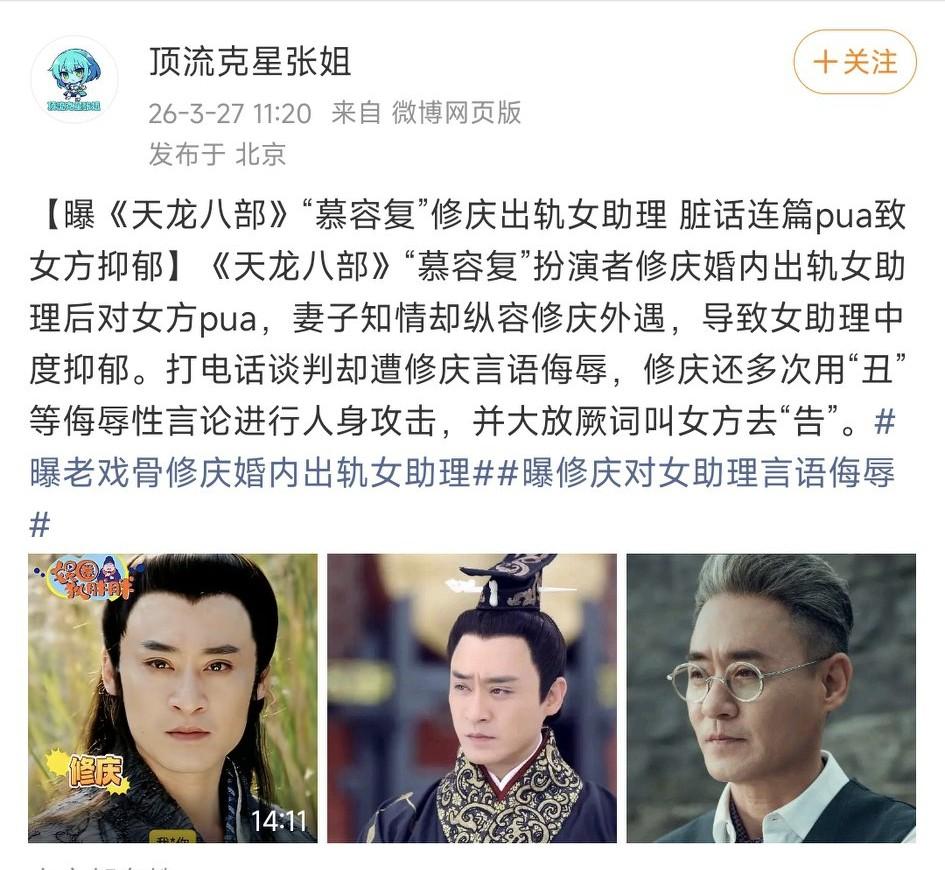 又一老戏骨彻底塌房!修庆出轨录音曝光,狂骂女方还称老婆全家支持 内娱老戏骨的滤镜,真是说碎就碎! 56岁修庆出轨女助理的录音曝光,全程脏话连篇,一点底线都没有。最毁三观的是,他对婚内出轨毫无愧疚,还放话老婆全程知情,全家都支持,早就咨询好律师,要反告女方敲诈、把人送进监狱。 修庆靠97版《天龙八部》慕容复成了经典配角,当年和刘亦菲拍戏,主动避开亲密戏,全网都夸他绅士前辈。谁能想到,镜头前的儒雅君子,私下竟这么龌龊。 录音里,他把女方往死里贬低,骂长相丑、说人家是“地摊货”,还狂言“你能见我,都是烧香积德”。更恶心的是,还拿刘亦菲开低俗玩笑,当年的绅士人设直接碎成渣。 他不仅不认错,还得意炫耀自己不止一个出轨对象,向来都是女方倒贴,他一分钱不花。还公然威胁女方,这分明是要复刻吴秀波的操作! 当年吴秀波把出轨女友送进监狱,彻底身败名裂,成了人人喊打的对象。如今修庆有样学样,还笃定就算曝光,自己顶多落个生活不检点的名声,毫发无伤。 他自诩“天之骄子、人中龙凤”,高傲到连老婆见他都得预约,完全不把旁人放在眼里。被他长期PUA的女助理,更是因此患上中度抑郁,谈判时还被他疯狂言语侮辱,受尽委屈。 录音一曝光,网友直接炸锅,荧幕上的老戏骨滤镜,彻底碎得捡不起来。 这些年,不少老戏骨仗着有经典角色吃老本,肆意突破道德底线,总觉得有滤镜护体、不怕塌房。 可演技再好,遮不住人品低劣;荧幕再儒雅,盖不住私下龌龊。艺德永远是演员的立身之本,没了底线,迟早被观众彻底抛弃。