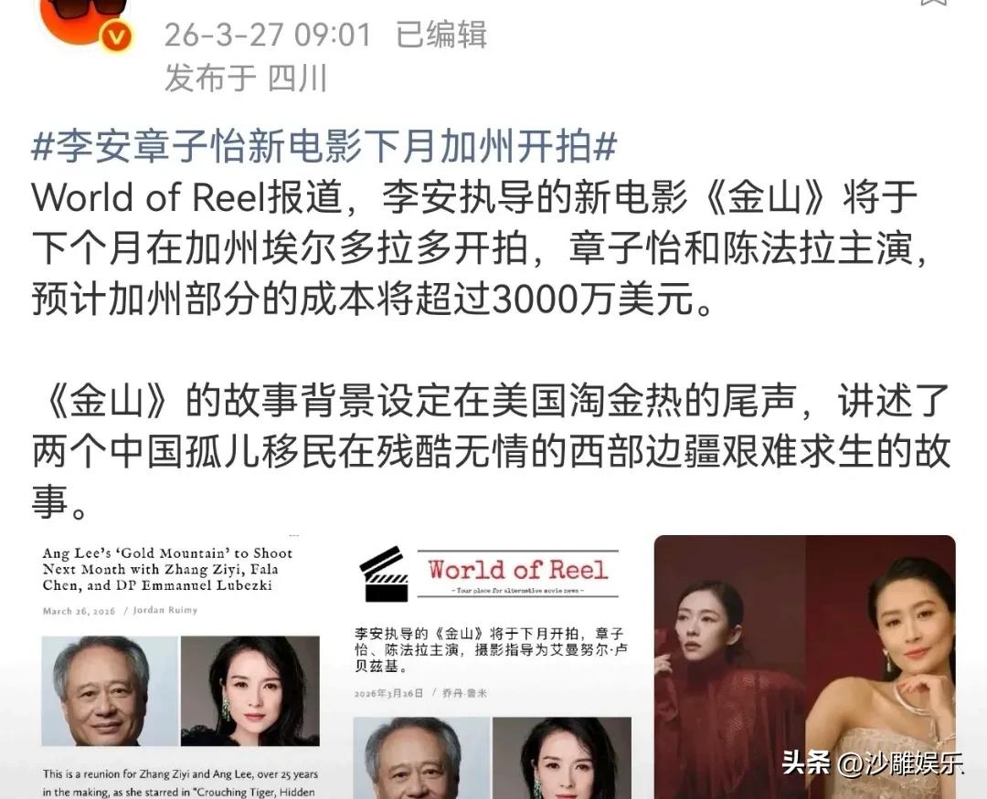 李安章子怡,冲上热搜! 3月27日一早,娱乐圈就炸出一颗重磅炸弹——李安和章子怡,这两个名字时隔25年再次绑在一起冲上热搜! 据外媒World of Reel爆料,李安搁置了李小龙传记片后全力冲刺的新片《金山》,下个月就要在加州埃尔多拉多开机了 。消息一出,影迷圈直接沸腾——这可是《卧虎藏龙》之后,两人的首次电影合作啊! 先来看看这部《金山》的配置,我只能用四个字形容:顶到天花板。 导演李安,不用多介绍,两座奥斯卡最佳导演奖杯在手。主演章子怡+陈法拉,一个国际影后,一个近年西进势头正猛的实力派 。摄影指导请来了三届奥斯卡得主艾曼努尔·卢贝兹基,《鸟人》《荒野猎人》那些神级镜头都出自他手 。编剧则是《柏青哥》的郑汉率 。 光是加州拍摄部分,预算就砸下超3000万美元 。这配置,说不是冲着颁奖季去的,谁信? 影片改编自华裔作家张辰极的小说《金山的成色》,故事设定在美国淘金热尾声的蛮荒西部 。两个无依无靠的中国孤儿移民,在枪火与黄沙里摸爬滚打,既要对抗残酷的自然,又要在白人主导的社会里挣一口活路。 这个题材,太李安了。从《断背山》的边缘人,到《少年派》的海上孤魂,他总能把小人物的挣扎拍出史诗感。 而对章子怡来说,这是她时隔25年再回李安麾下。从当年《卧虎藏龙》里那个桀骜不驯的玉娇龙,到如今要演一个在西部荒漠求生的移民女性,角色跨度之大,光是想想就让人期待 。 说实话,看到这个消息,我的第一反应是:李安终于回来了。 自从《双子杀手》之后,李安沉寂了六年。期间李小龙传记片一波三折,一度让人以为这位华语顶级导演要淡出江湖了。没想到他憋了个大的。 而且,这次选章子怡,太对了。 要知道,当年拍《卧虎藏龙》时,李安对章子怡的要求极其严苛,甚至一边拍一边还在试镜别的演员,让章子怡每天活在随时可能被换掉的恐惧中 。这种高压下磨出来的玉娇龙,成了经典。 25年过去,章子怡早已不是那个战战兢兢的新人。她拿遍了国内外影后,也经历过事业起伏。如今再回李安麾下,两人都到了更从容的阶段。这种默契,是时间沉淀出来的。 再加上陈法拉这个变量——从TVB花旦到好莱坞新星,她的成长轨迹本身就是一部华裔演员的奋斗史。两个不同代际的华裔女演员在西部荒漠相遇,这种化学反应,太值得期待了。 唯一要担心的可能是:3000万美元的预算,对李安这种级别的导演来说其实不算宽裕。但话说回来,李安最擅长的就是在有限的条件下拍出无限的可能。当年《卧虎藏龙》不也是这么过来的吗? 总之,这部《金山》,我已经提前锁定了。4月开机,年底应该能看到粗剪版。到时候,咱们电影院见分晓!