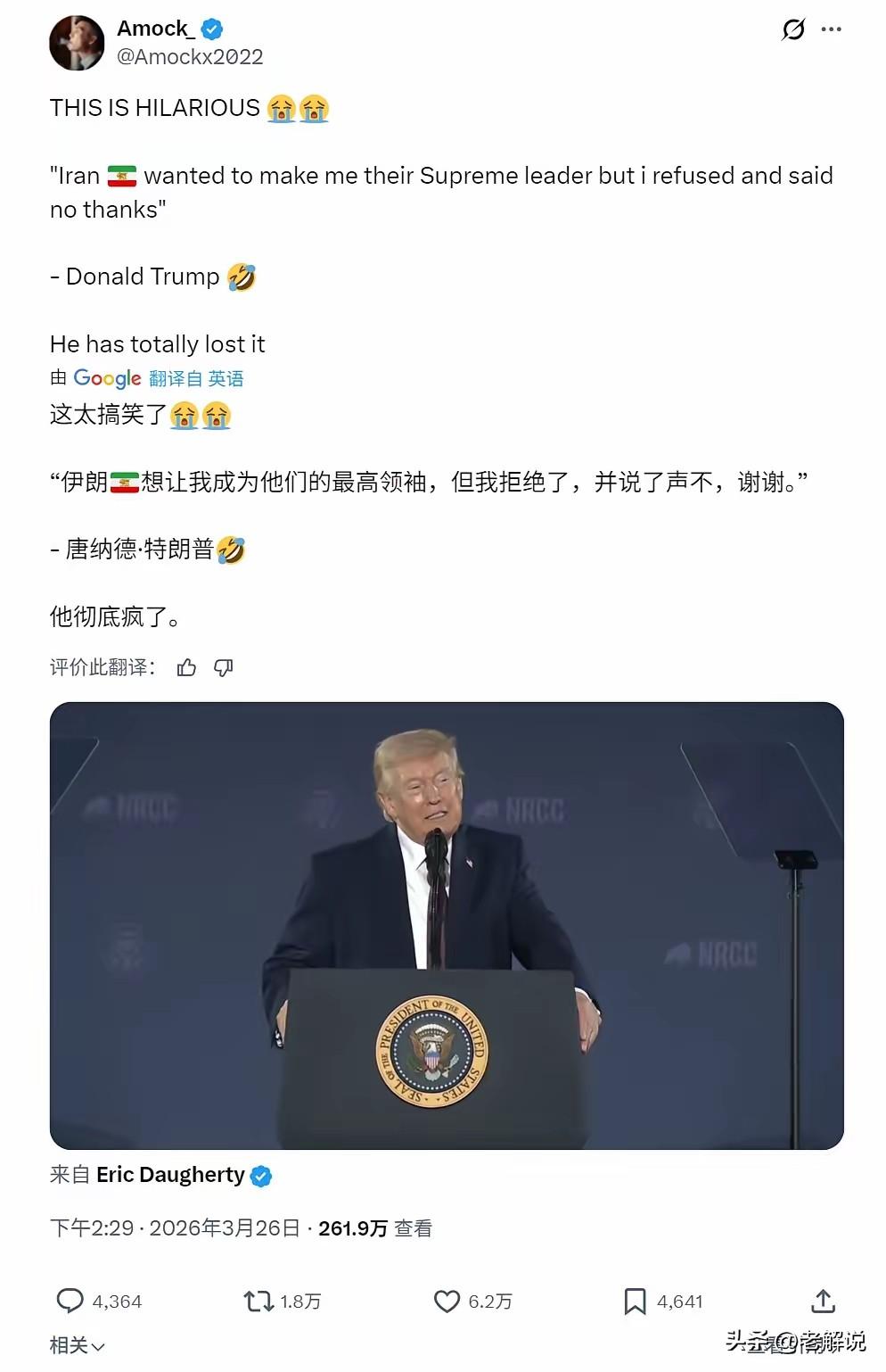 又发疯了!特朗普:伊朗想让我当他们的最高领袖,但被我拒绝了。 3月25日,特朗普又在演讲中贡献了“名场面”,他在台上讲话时眉飞色舞地爆料: “伊朗人想让我当最高领袖,但我拒绝了,我说‘不了谢谢’。” 听到这句话,我的第一反应是:这到底是政治演讲还是单口喜剧?他大概忘了,就在他说这话的同一天,伊朗法尔斯通讯社发布了一段AI短片,画面里一枚导弹在印第安人、巴勒斯坦人以及被炸学生的注视下,精准炸毁了自由女神像——而自由女神像在片中被幻化成了羊头恶魔“巴风特”。这,就是伊朗给特朗普的“回应”。 特朗普在台上讲得眉飞色舞,可现实是,美国在伊朗的这仗打得并不轻松。他说美国“赢得太彻底了”,但外界看到的是,霍尔木兹海峡至今仍对美国和以色列关闭,超过350艘船困在海峡两头,进不去也出不来。 他说伊朗“迫切希望达成协议”,可伊朗外交部反复否认有任何直接或间接谈判,外长阿拉格齐直言,这场战争是“以色列把美国推向冲突”。 特朗普的这套话术,其实是有套路的。 前一天,他刚“揭秘”伊朗送了一份“价值连城的厚礼”——10艘油轮通过霍尔木兹海峡,其中8艘挂着巴基斯坦国旗。他兴奋地说,这是伊朗为了谈判送上的“大礼”,证明自己“找对了人”。 但伊朗那边直接泼冷水:获准通行的船只都是跟伊朗事先协调好的,不存在什么“送礼”,更不是什么谈判的“诚意”,这就是赤裸裸的政治作秀。 有意思的是,特朗普一边说自己在跟伊朗“谈判”,一边又说伊朗领导人“不敢承认谈判,因为他们怕被自己人干掉,也怕被美国干掉”。 这话的逻辑我属实没太看懂——你一边在跟人家谈,一边说人家怕你,那这谈的到底是什么?更魔幻的是,他还说如果达成协议,“或许将由他和下一任伊朗最高领袖联合控制”伊朗的石油运输。这哪是在谈停战,分明是在给自己加戏。 回头看他那句“拒绝当伊朗最高领袖”,其实是个精心设计的“政治梗”。翻译过来就是:哥现在已经是美国总统了,伊朗那个位置,我根本看不上。 这话是讲给国内选民听的,潜台词是“我在他们眼里这么牛,你们还不支持我?”但问题在于,美国的选民未必吃这套,反倒是伊朗那边用AI短片狠狠“回敬”了一把。 同一天,有报道说美国正悄悄通过巴基斯坦转交一份15点停战计划,试图找条“退路”。伊朗根本不理,革命卫队直接宣布发起第81波攻势,打击了以色列70多处目标。 现在最急的反而是以色列,内塔尼亚胡下令48小时内尽可能多地摧毁伊朗军工设施——因为他怕,怕特朗普随时可能突然宣布停战,自己就被“卖”了。 从“拒绝当最高领袖”到“伊朗送大礼”,从“赢得太彻底”到悄悄找退路,特朗普最近关于伊朗的发言,就像一出在战火中上演的政治脱口秀。 台上的他越眉飞色舞,台下的现实就越打脸。打仗打的是真刀真枪,不是社交媒体上的段子。美国人有没有被逗笑我不知道,但伊朗人的AI短片,已经把自由女神像炸了个粉碎。