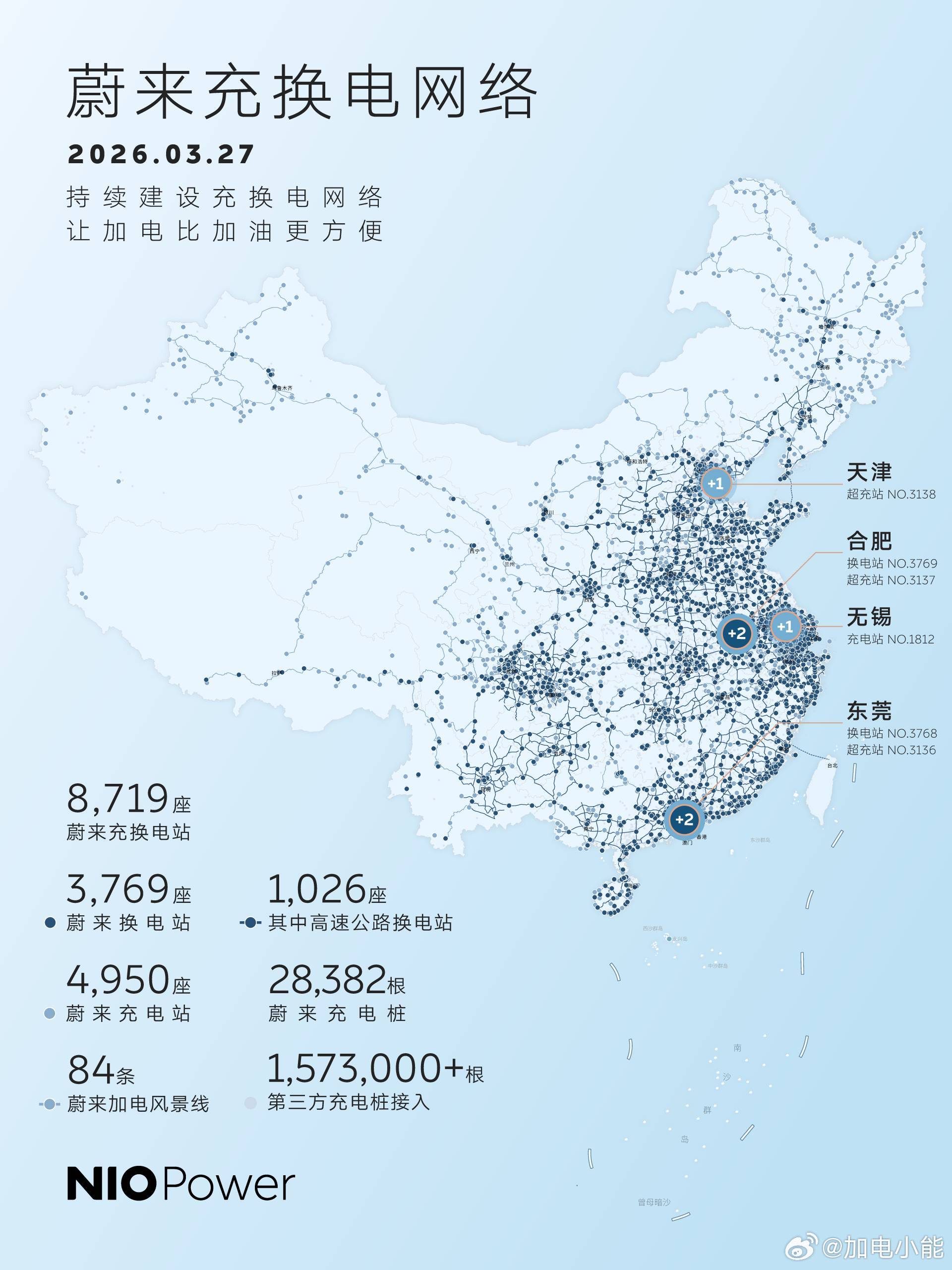 3月27日,NIO Power 6站上线NO.3768 蔚来换电站 | 东莞虎门连升路NO.3769 蔚来换电站 | 合肥包河万象汇NO.3136 蔚来超充站 | 东莞虎门连升路NO.3137 蔚来超充站 | 合肥包河万象汇NO.3138 蔚来超充站 | 天津东丽卫国道综合能源服务中心4期NO.1812 蔚来充电站 | 无锡车联天下持续布局-让加电比加油更方便