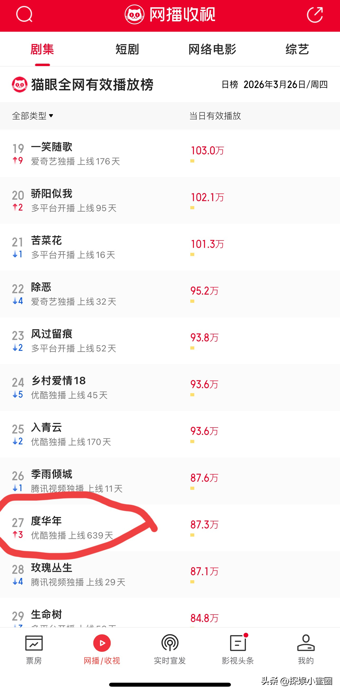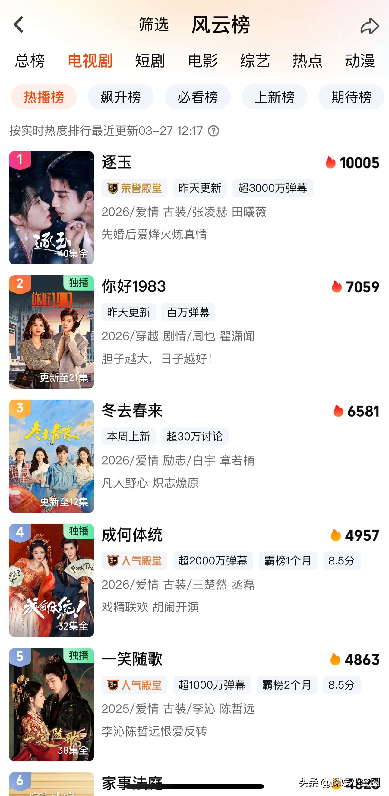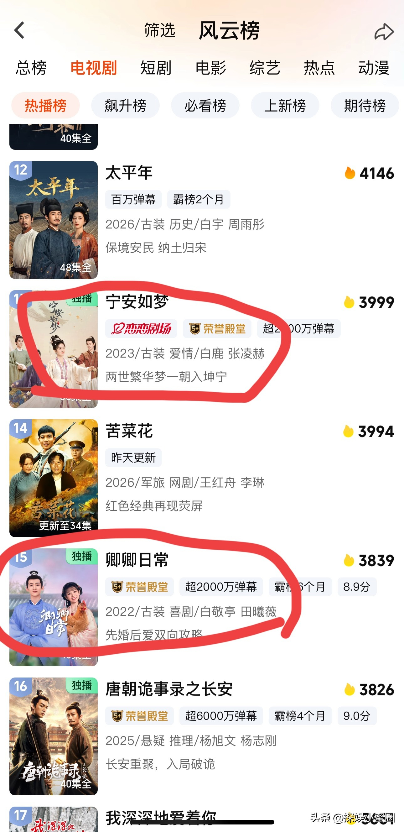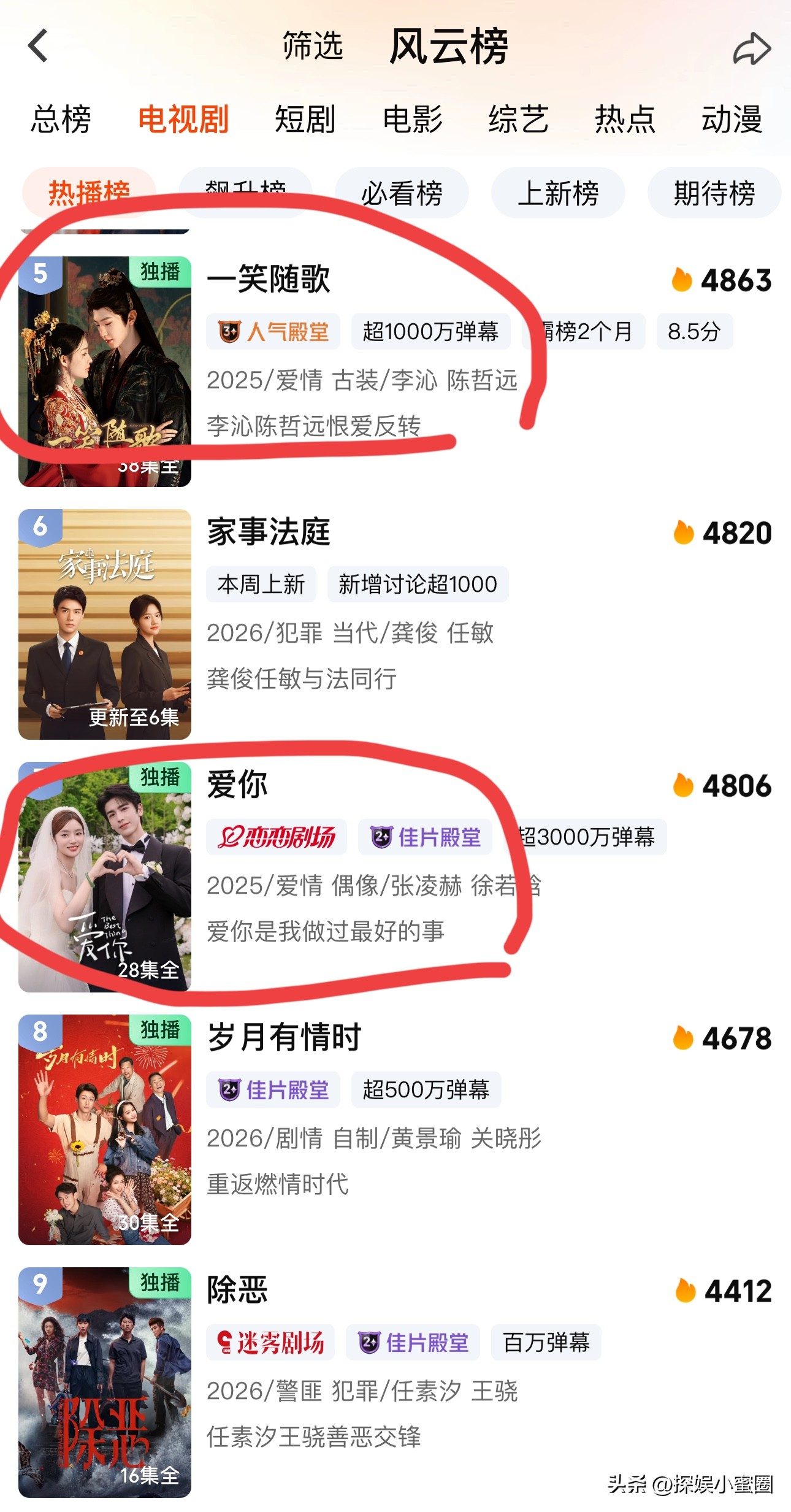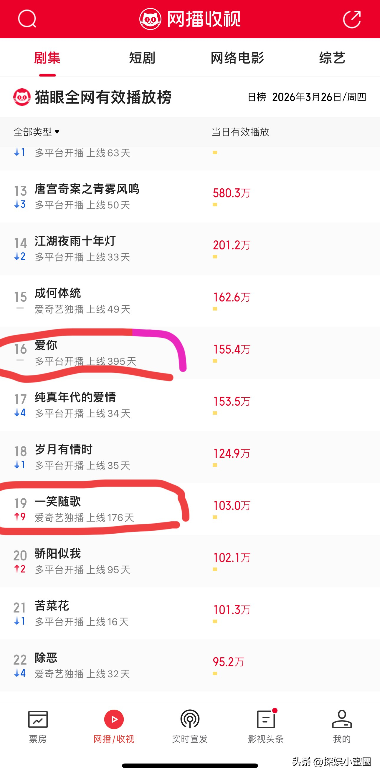 🥝站内数据看:《一笑随歌》热度杀进了热播榜第5名《爱你》热度杀进了热播榜第7名张凌赫主演的《宁安如梦》位于第12名田曦薇主演的《卿卿日常》位于第15名张凌赫主演的《云之羽》位于第26名