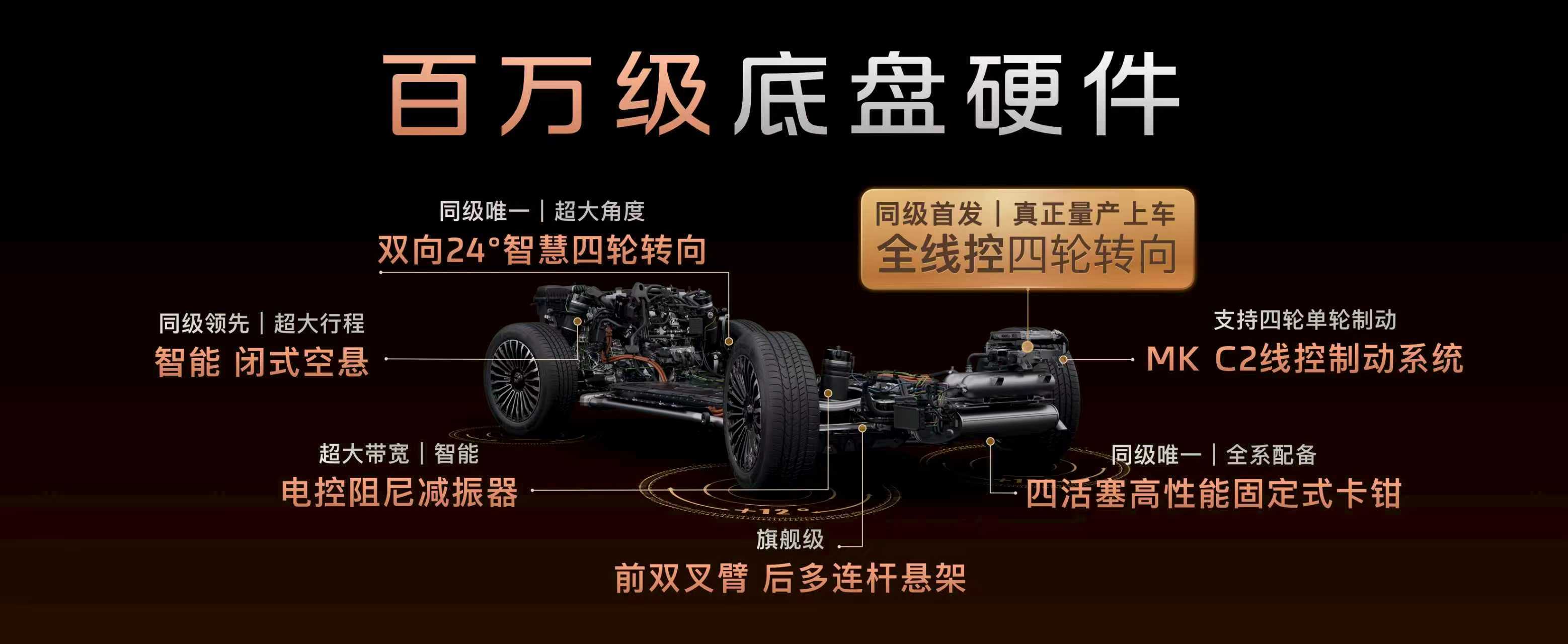 技术上,我关注两个点。一个是四轮转向+线控转向。四轮转向大家已经比较熟了,本质是解决“大车好不好开”:低速更灵活,高速更稳定。但线控转向不一样,它把机械连接变成电子控制。能带来三点变化:转向手感可以动态调节,转向比可实现4.5:1到14.2:1的超大范围无级调节;方向盘和车轮解耦,座舱更自由;更关键的是,它更容易和辅助驾驶系统打通,是实现L3/L4自动驾驶的硬件基础。