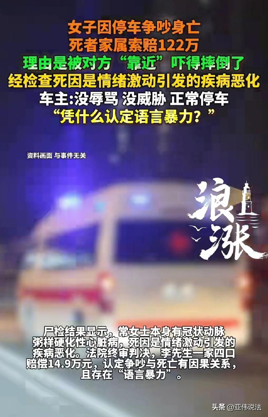 海南万宁,男子下班后,将车停到了小区公共停车位上,谁知女邻居说,他的车影响了她家进出,让男子开走。男子纳闷,自己停在停车位上,碍她啥事,双方发生争执。万万没想到,女邻居情绪激动,突然从自家玻璃门里摔了出来,送医抢救后不幸去世。女子家属一口咬定,是男子靠近把人吓倒的,要求他赔偿122万。法院的判决让男子满肚子委屈。 最近,李先生被一件事缠得焦头烂额,就因为一次停车争执,竟和邻居闹出了人命。 2024年2月5日,李先生下班回家,把车停在了小区公共区域的一片空地上。 这片地方平时就有不少业主停车,物业也没说不能停,在业主眼里,这片就是天经地义的公共车位。 可他刚把车停稳准备离开,邻居常女士就快步冲了过来,急吼吼的表示,他的车不能停在这儿,挡着她家走路了,让李先生马上开走。 李先生一就不乐意了,这明明是公共区域,大家都能停,我停这儿怎么就挡你的路了? 两人你一言我一语,针尖对麦芒地吵了起来,情绪都越来越激动。 可谁也没想到,吵着吵着,常女士突然从自家玻璃门里摔了出去,当场不省人事。 周围的邻居赶紧围过来帮忙,打了120把人送去医院,可常女士还是不幸去世。 好好的一个人,就因为一场停车争执没了,李先生站在医院走廊里,整个人都懵了,他怎么也想不到会闹到这个地步。 常女士的丈夫悲痛欲绝,他把这笔账全算在了李先生头上。 他一口咬定,说妻子肯定是被李先生靠近时的样子吓到了,心里一慌,身子歪了才摔出去出事的。 于是,他把李先生一家四口都告上了法庭,张口就要122万的赔偿。 李先生听到索赔金额时,只觉得荒谬又委屈。 他反复强调,自己当时就是停了个车,是对方先开口辱骂自己,自己既没骂脏话也没动手,是她自己本身就有基础病,凭什么要自己赔钱。 他还找来了物业作证,物业明确表示,小区公共区域业主车可以随便停,那片空地就是公共车位。 尸检结果显示∶常女士本身患有冠状动脉粥样硬化性心脏病,这次摔倒引发脑挫伤,还导致了广泛性蛛网膜下腔出血,最终因为循环和呼吸功能衰竭去世。 《民法典》第一千一百六十五条规定:行为人因过错侵害他人民事权益造成损害的,应当承担侵权责任。依照法律规定推定行为人有过错,其不能证明自己没有过错的,应当承担侵权责任。 整个过程,李先生虽然没骂人、没动手,也没碰对方,但他不该和对方一直争执吵架,导致女邻居情绪越来越激动,这才引发了后续摔倒出事的情况。 他的争吵行为和女邻居的死亡有间接的关系,而且他没做到冷静沟通、避免矛盾闹大的义务。 女邻居本身有基础病,这才是导致她死亡的主要原因,而且是她先找上来要求挪车、引发争执,自己情绪失控才摔倒的,所以她自己要承担大部分责任。 李先生只是因为吵架激化了对方的情绪,属于次要过错。 所以,法院判决,李先生承担15%的责任,赔偿常女士家属14.9万元。 对此判决李先生不服,立刻提起上诉。二审法院认定李先生存在言语暴力,维持了原判。 李先生越想越憋屈,他全程就事论事,没侮辱没威胁,语言暴力从何说起,自己不过是想停个车,怎么就成了“间接伤人”? 思来想去,他决定申请再审,无论如何也要为自己讨个公道。 因为一次停车,搭上一条人命,双方都是输家。远亲不如近邻,多点宽容克制,平安才是最大的福气。