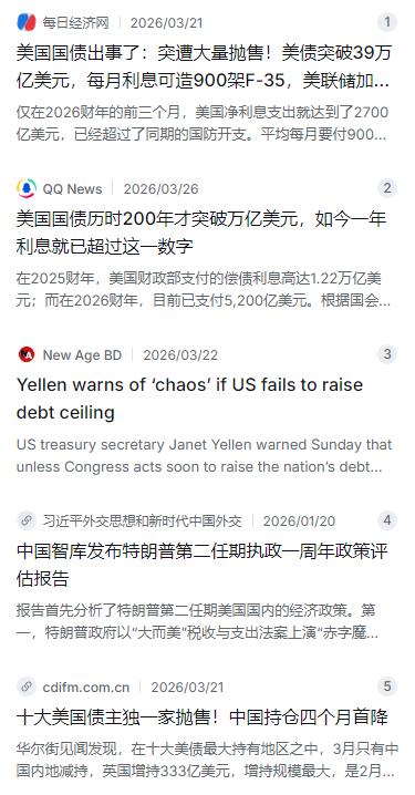 终于有人管管美国了!美国遇到大麻烦,用得上中国了,美:中美两国需要携手,数据显示美国联邦债务利息支出正式突破了9700亿美元大关,这个数字意味着什么?意味着美国建国以来破天荒的一幕发生了,美国政府还债的利息,第一次超过了国防军费的开支。 麻烦看官老爷们右上角点击一下“关注”,既方便您进行讨论和分享,又能给您带来更多优质的内容,感谢您的支持! 美国这次是真的摊上大事儿了,而且这事儿还不是外部敌人造成的,完全是自个儿家里着了大火。就在刚过去的2026年3月,美国财政部公布了一组让所有华盛顿政客都得倒吸一口凉气的数据:美国联邦政府的债务利息支出,正式突破了9700亿美元的大关。这个数字意味着什么?意味着美国建国两百多年来破天荒的一幕,终于发生了——美国政府每年为了还债而要支付的利息,头一回超过了它花在国防军费上的开支。 大家可能对这个概念没什么直观感受。这么说吧,以前美国在全球当“世界警察”,最舍得花钱的就是军队,那军费数字听着都吓人。但现在,光是把债主们的利息还上,就得花掉比军费还多的钱。有预算监督机构算过一笔账,按这个速度,2026财年全年的净利息支出铁定要超过1万亿美元,仅仅是在这个财年的前三个月,利息就已经花掉了2700多亿美元,比国防部那三个月花的钱还要多。这意味着什么?意味着美国财政部现在每天一睁眼,啥事不干,就得先想办法凑出几十亿美元去还利息。这感觉就像是每个月工资刚发下来,还没捂热乎呢,就全拿去还信用卡了,甚至连吃饭的钱都得靠借。 更麻烦的是,这个利息开支现在成了美国政府账本上最硬的“钉子户”,根本就砍不动。因为这是国债的利息,是写到合同里的,你要是不还,那就是国家信用破产,美元霸权直接完蛋。所以,甭管你是想给老百姓修路、搞基建,还是想在科技研发上投钱,甚至是给军队换装备,这些钱都得往后排。钱就这么多,大头都被利息给吃了,剩下的那点还得应付社保、医保这些刚需,留给发展、搞建设的钱自然就捉襟见肘了。现在的美国,就像一个被房贷压得喘不过气来的中产,收入虽然不低,但大部分都交给了银行,根本没钱再去提升自己、投资未来。 那这窟窿怎么补呢?老办法,借新还旧。但问题是你越借越多,利息也越来越高,这就成了一个无解的恶性循环。更要命的是,美国国会那帮政客还在为这事儿天天吵架。债务上限的问题每隔一段时间就要闹腾一次,两党为了政治利益把国家财政当儿戏,动不动就威胁要让政府关门。这种内耗不仅解决不了问题,反而让市场对美国的财政纪律越来越没信心。你看,就在2026年1月,中国人民大学重阳金融研究院发布的一份报告里就直言不讳地指出,美国这种“寅吃卯粮”的玩法,是典型的“赤字魔术”,表面看着热闹,内里早就被掏空了。 在这个火烧眉毛的节骨眼上,美国政府的算盘珠子,开始不得不往中国这边拨了。因为全世界都看得明白,美国现在最需要的两样东西,全都捏在中国手里。第一样,是钱。中国是美国国债最大的海外持有者之一,虽然这两年中国也在根据市场情况调整持仓,比如2026年3月就小幅减持了104亿美元,但手里依然握着超过1.1万亿美元的美国国债。美国现在要发新债还旧债,最大的指望就是中国能继续当这个大买家,帮它稳住国债市场。第二样,是货。美国这几年一直喊着要和中国“脱钩”,想搞制造业回流,结果发现根本行不通。最新的例子就是,因为伊朗那边的战事,国际油价一涨,美国国内的通胀压力立刻就上来了,搞得特朗普政府不得不赶紧想办法平抑油价。如果真跟中国全面脱钩,美国老百姓买什么都会更贵,通胀一高,美联储就得加息,一加息,美国的国债利息成本还得往上蹿。这就成了一个死扣,越解越紧。 其实,美国国内的有识之士也慢慢回过味儿来了。早在2026年2月,就有美国智库深刻反思,说美国最大的战略误判,就是以为能同时打赢对华的“金融战”和“工业战”。这个观点说到了根子上:美国想维持美元霸权,就必须向全球输出美元,那就得大量进口商品,这就很难把工业都搬回美国;如果硬要把工业搬回来,就得减少进口,那其他国家手里的美元就少了,谁来买美国的国债呢?这三个目标根本就是矛盾的,美国想“鱼和熊掌兼得”,结果很可能是鸡飞蛋打。 所以,咱们现在看到的现象就很有意思了。美国这边,虽然嘴上还是各种强硬,但在行动上,已经开始变得务实了。他们越来越意识到,在这个节骨眼上,跟中国搞对抗的成本太高了,高到它根本承受不起。单边脱钩这种“杀敌一千,自损八百”的蠢事,它快玩不下去了。因为现在的美国,真的“穷”得快要揭不开锅了,它急需一个稳定的大后方来帮它分担压力,而不是再给自己树敌。