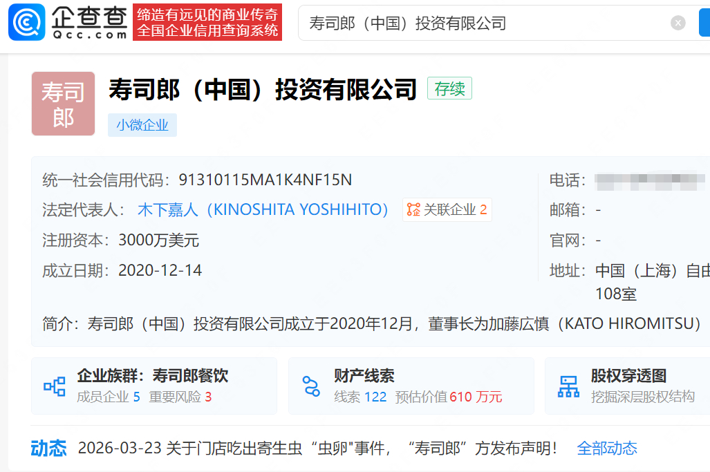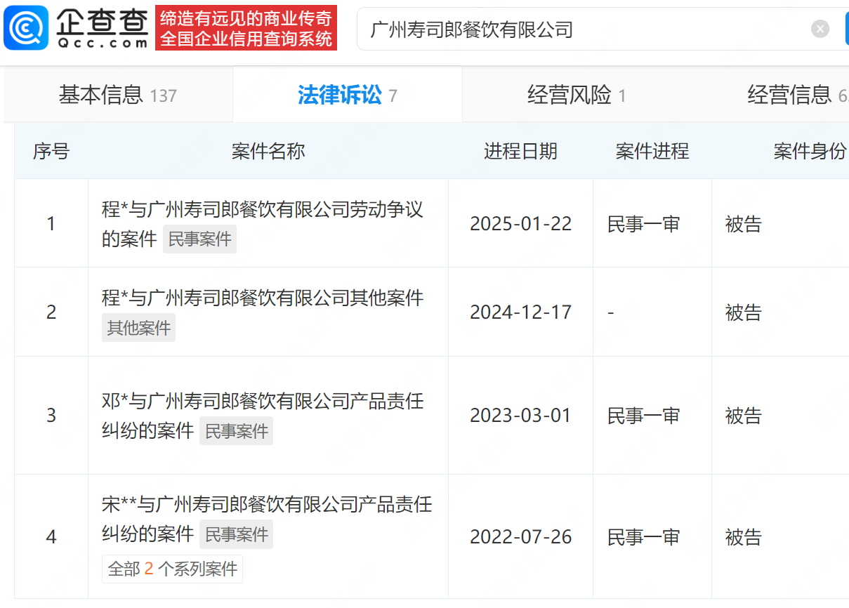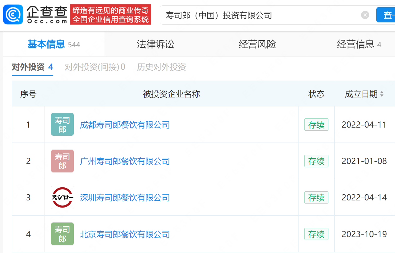 根据企查查APP显示,寿司郎关联的寿司郎(中国)投资有限公司成立于2020年12月,注册资本3000万美元,法定代表人木下嘉人(KINOSHITA YOSHIHITO),经营范围包含餐饮管理、食品经营、酒类经营、协助所投资企业寻求贷款及提供担保等,由株式会社FOOD&LIFE COMPANIES全资持股。对外投资信息显示,该公司在广州、深圳、北京、成都投资4家寿司郎餐饮企业,4家餐饮公司共下设70多家分支机构,分布于厦门、武汉、东莞等地。值得注意的是,今年1月,深圳寿司郎餐饮有限公司曾因产品问题被罚3.5万。此外,广州寿司郎餐饮有限公司曾因产品责任纠纷、劳动争议案件被起诉。