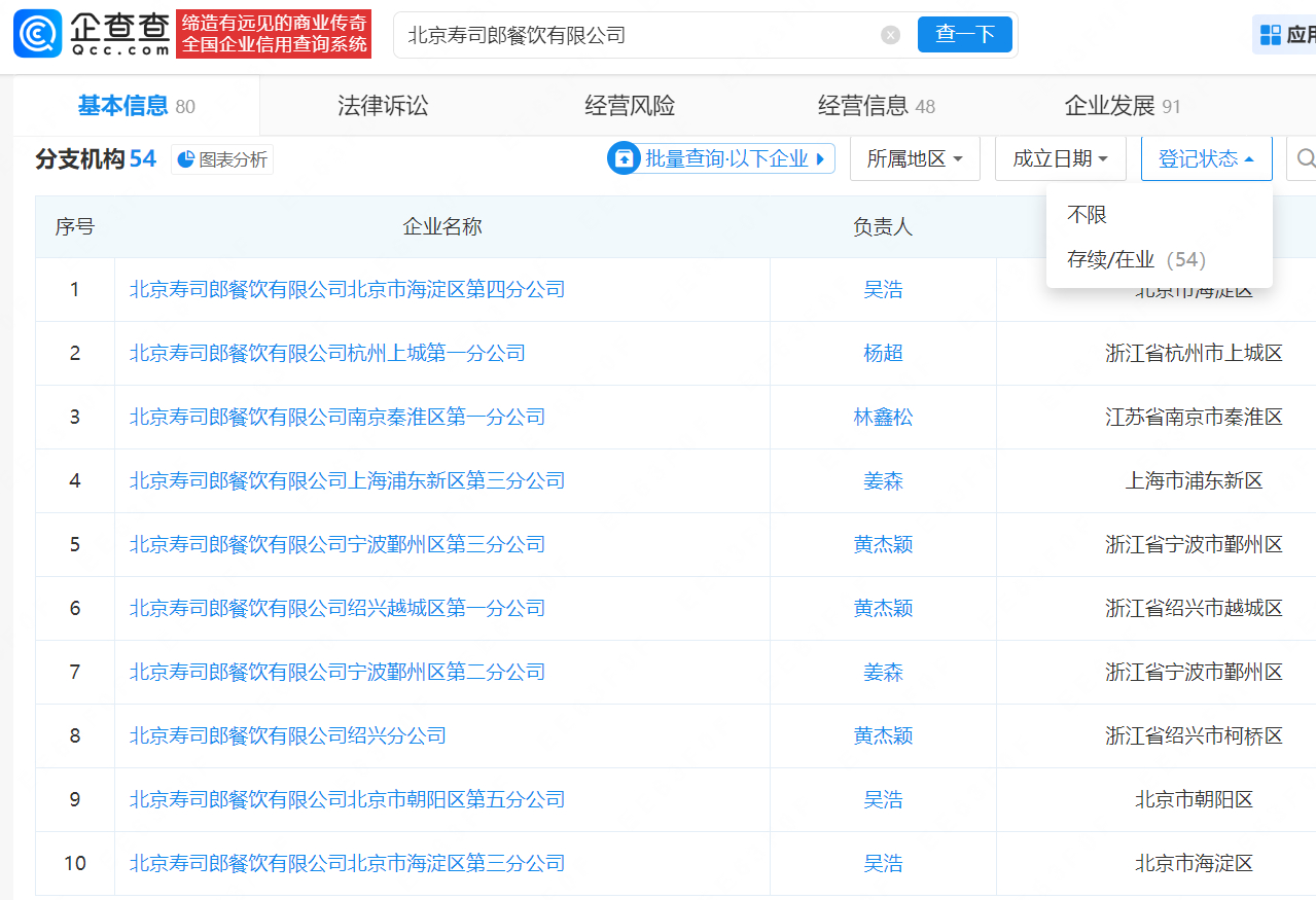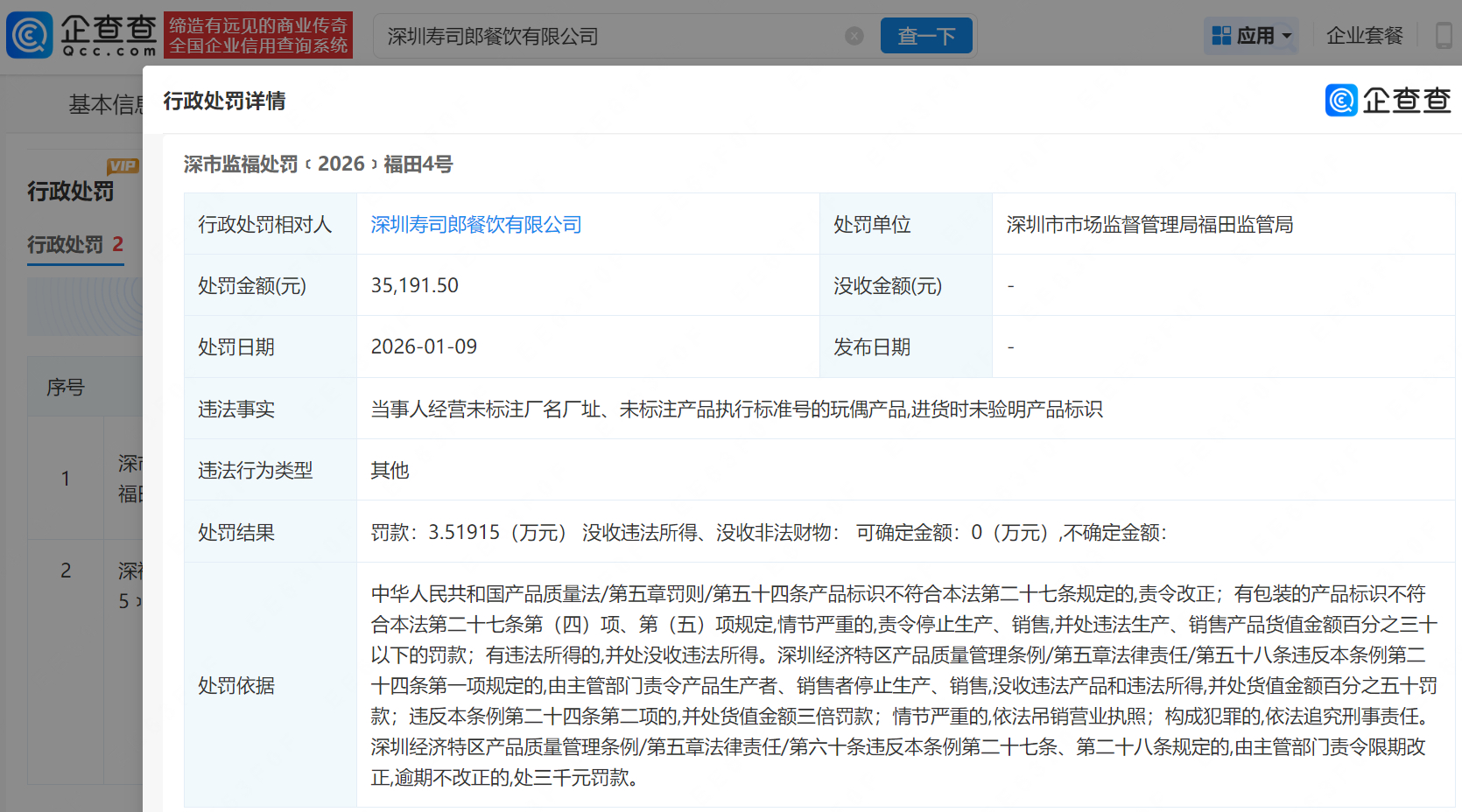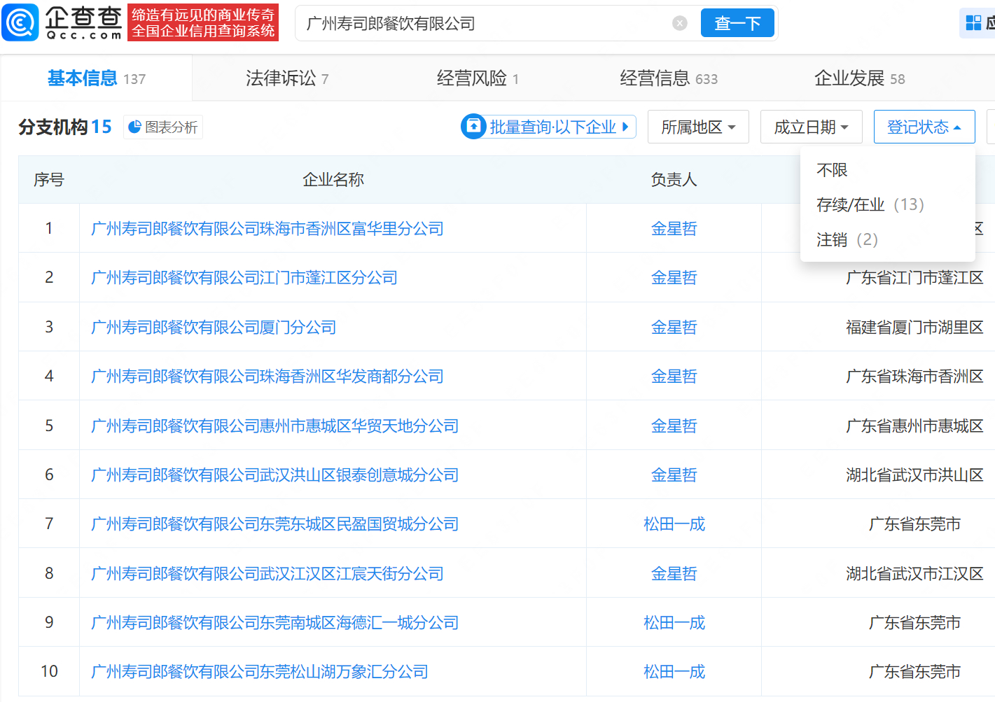根据企查查APP显示,寿司郎关联的寿司郎(中国)投资有限公司成立于2020年12月,注册资本3000万美元,法定代表人木下嘉人(KINOSHITA YOSHIHITO),经营范围包含餐饮管理、食品经营、酒类经营、协助所投资企业寻求贷款及提供担保等,由株式会社FOOD&LIFE COMPANIES全资持股。对外投资信息显示,该公司在广州、深圳、北京、成都投资4家寿司郎餐饮企业,4家餐饮公司共下设70多家分支机构,分布于厦门、武汉、东莞等地。值得注意的是,今年1月,深圳寿司郎餐饮有限公司曾因产品问题被罚3.5万。此外,广州寿司郎餐饮有限公司曾因产品责任纠纷、劳动争议案件被起诉。