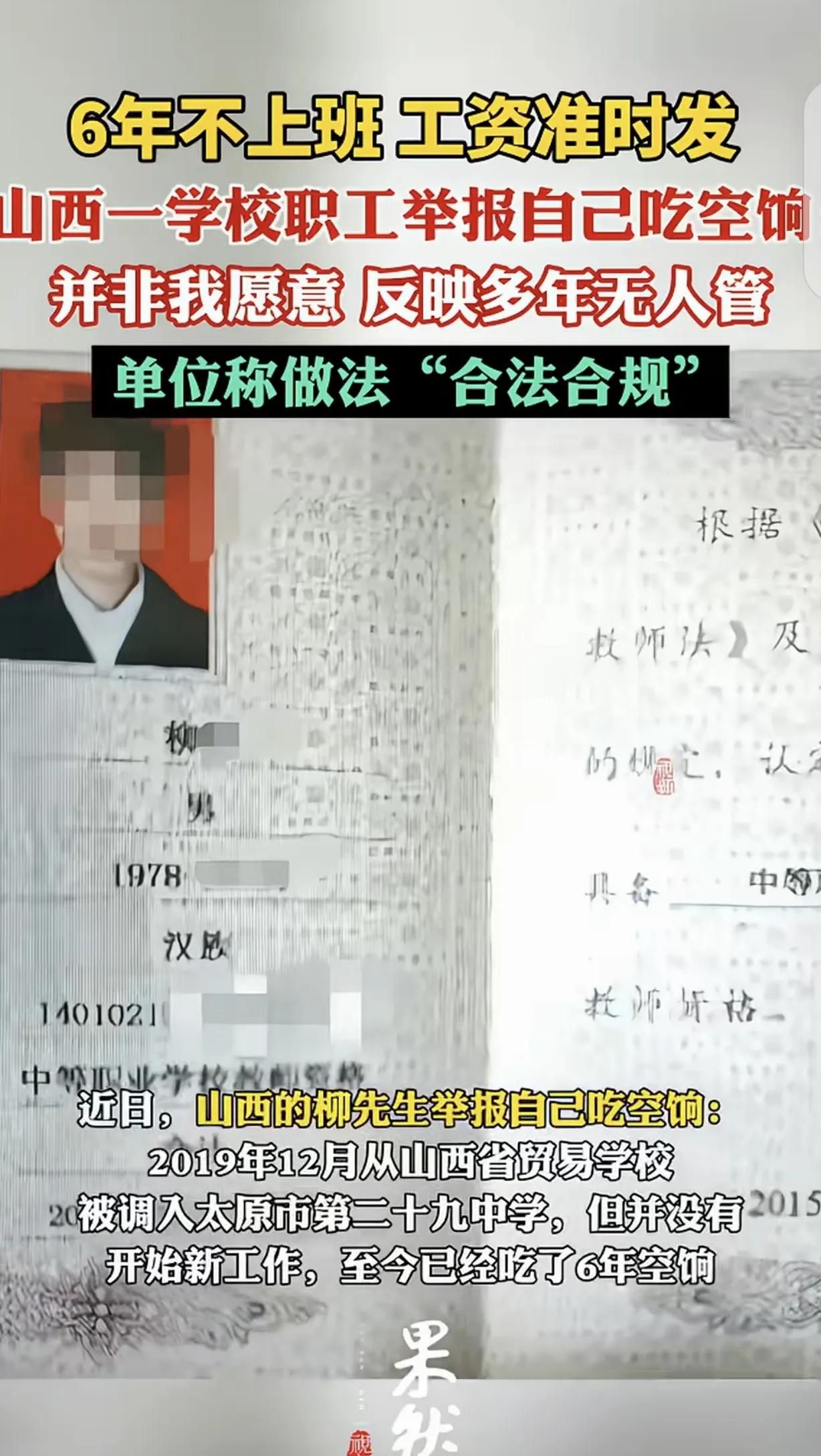 自己举报自己吃空饷?山西一男子6年没上班,工资照发,他急了! 山西太原的柳先生,干了一件让人看不懂的事——他主动举报自己“吃空饷”。 2019年底,他从贸易学校调到太原二十九中。本以为是正常调动,结果手续漏洞百出。 他的《调动登记表》上,人社部门的章竟然是空白的。更离谱的是,批准日期比申请日期还早15天! 原本是专业技术10级,介绍信却写成科员9级。身份、待遇全乱套了。 发现问题后,他只上了1个月班,就坚决不干了,要求调回原单位。 可这一请求,6年都没人理。教育局、人社局来回踢皮球,法院也告过,纪委也反映过,就是没结果。 最诡异的是:他6年没打卡、没干活,工资却月月到账,从3000涨到8415元。 这笔钱他拿得心慌。怕时间久了,被当成贪污或职务侵占,要坐牢。 于是,他干脆自曝:我吃空饷了!求你们快查我,把工资停了,把我调回去! 学校对外说“一切合法合规”,可内部文件却承认“工作不够细致”。前后矛盾,令人费解。 按国家规定,事业单位员工连续旷工15天,单位就能解聘。可他6年不在岗,学校既不开除也不停薪。 这哪是疏忽?分明是监管集体“睡着了”。财政的钱,就这样白白流进一个空岗位。 小编结语: 柳先生不是贪心,而是被逼到墙角的老实人。他不怕丢钱,就怕背黑锅。 这件事最可怕的,不是有人吃空饷,而是六年无人问、无人管。 制度若只靠百姓“自爆”才能运转,那才是真正的漏洞。希望这次,别再“正在处理”了。