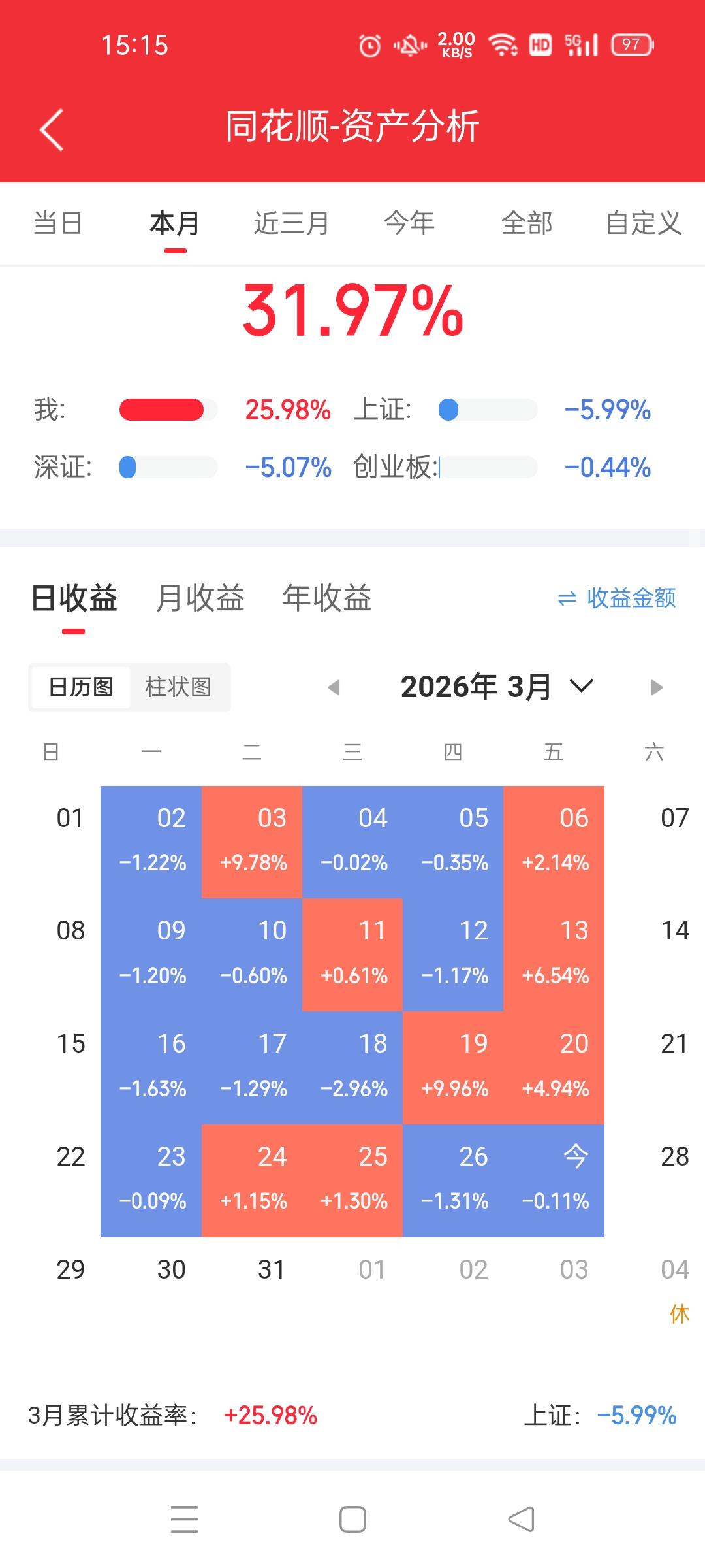 大盘今天反弹还不错,而我却在亏钱,真是邪门! 大盘前两天瀑布式下跌的时候,而我手里的票却是挣钱的,邪门吧! 看来我就不适合买两只股票,原来买一只的时候,不管等几天出来都是赚钱的,今天出掉的一只还是大前天买的,还赚了八九个点,可是前天手欠尾盘买了一只,昨天掉下来了,今天又掉下来,掉下来这只如果昨天我不补仓的话,都快亏十个点,这只票不涨上去我是不会卖的! 这么算下来,等于这一天白忙了,还亏了几十块钱,妈的,这叫什么事呀?看来以后打死都不能买两只了! 不说了,得歇会儿了,今天心情不好,同样的话送给大家:祝大家都心想事成,天天发财!