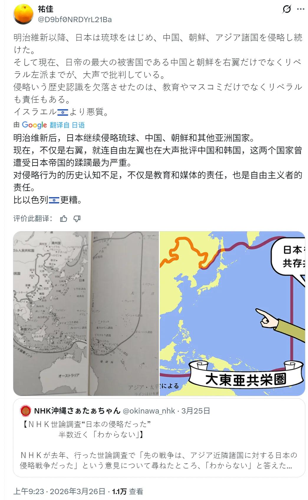 一位清醒的日本网友在网上发出了振聋发聩的拷问,直接撕开了日本社会虚伪的遮羞布。 他直言不讳地指出:“自明治维新以来,日本持续侵略了琉球、中国、半岛及亚洲各国。然而现在,作为日本帝国主义最大受害者的中国和韩国,却遭到了日本右翼甚至自由左派的猛烈抨击。” 评几句: 这话听着刺耳吗?刺耳就对了。 一边是靖国神社里供奉着甲级战犯,一边是首相年年"拜鬼"装失忆;一边在教科书里把"侵略"改成"进出",一边却要求受害者"放下历史包袱"。这种精神分裂式的表演,演给谁看? 戳破这层窗户纸:所谓"自由左派"跟着右翼一起咬中韩,本质上是日本政坛的"历史失忆症"集体发作。他们不是忘了,是假装忘了。忘了什么?忘了冲绳岛上美军的基地,忘了广岛长崎的蘑菇云是谁种下的,更忘了今天是谁在太平洋对岸攥着日本的脖子。 为什么现在跳得欢? 剧本老套得很。经济三十年爬不动,政客们急需一个"外部敌人"来转移视线。中韩成了现成的靶子——一个经济体量碾压,一个半导体产业紧追,不抹黑你们,怎么向选民交代"不是我无能,是外敌太凶"? 真正目的是什么? 说白了,就是给"修宪扩军"铺路。把中韩渲染成"威胁",自卫队才能名正言顺变军队,军费才能冲破GDP1%的紧箍咒,军工复合体才能开香槟。这套"贼喊捉贼"的把戏,华盛顿看得懂,东京装糊涂,受害国看得清清楚楚。 后果是什么? 地区安全在燃烧。你今天配合美国搞"印太战略"围堵,明天导弹基地就修到离台海几百公里的地方。产业链在断裂,半导体材料一卡脖子,全球电子产业都跟着打喷嚏。最惨的是日本老百姓,物价飞涨、日元贬值,还要为政客们的"大国梦"买单。 他们嘴上喊"自由开放",现实却紧抱冷战僵尸不放;一边享受中国市场的红利,一边配合美国搞技术封锁;一边要求中韩"正视历史",一边把自己的战争罪行扫进地毯底下。 这种双标,还要演到什么时候? 历史账没算清,现实戏又开锣。一个连过去都不敢正视的国家,凭什么让人相信它能把握未来? 你怎么看?评论区聊聊。