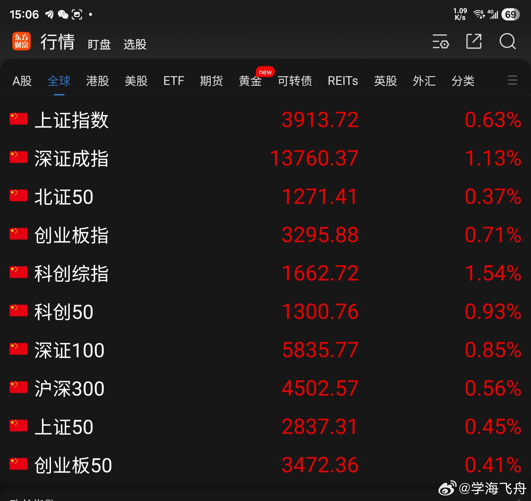 今天A 股大盘修复性反弹:东方财富App 显示的 10 项指数全体上涨收红,上证指数涨 0.63%,涨 24.64 点至 3913.72 点,再上 3900 点关口。 个股亦涨多趺少: 沪深京三交易所中,上涨的股票有 4210 支,比昨天多 3360 支, 其中涨幅在 7% 以上的有 164 支,比昨天多 96 支; 持平的股票有 61 支,比昨天少 9 支;下跌的股票有 1032 支,比昨天少 3350 支, 其中跌幅在7%以上的有 15 支,比昨天少51 支。三个市场全天的成交量为 18640 亿元,比昨天缩量 932 亿元,再创本月以来成交量新低。今天的A 股价升量降,再创地量,既与中东战事胶着有关,又与周末控仓变现相系,本月仅余2 个交易日,看来 80% 股民亏损已成定局
