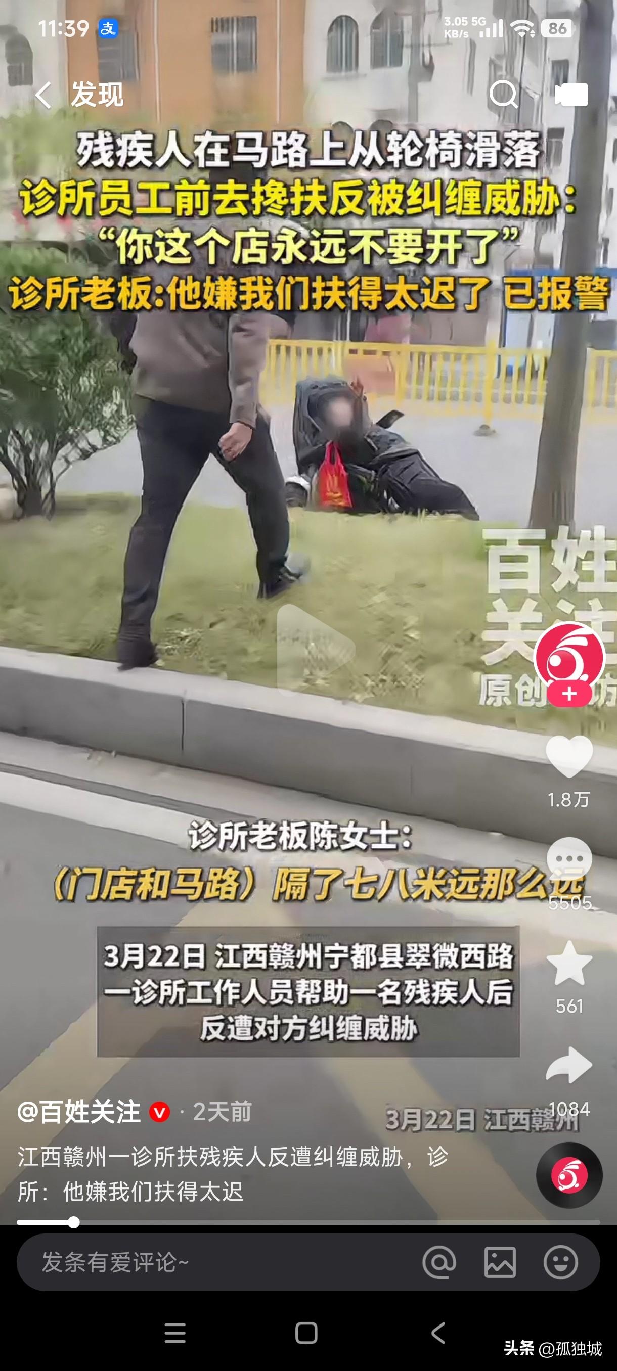 江西赣州一残疾人在马路上从轮椅上面滑落,马路对面一诊所工作人员前去搀扶反遭纠缠威胁,残疾人居然嫌他们扶的迟了…… 这年头当个好人简直比上天还难,以后遇到这种情况到底该怎么办?不去扶吧,显得我们冷血没有良心,去扶吧,反而遭到对方的纠缠和威胁,还声称我们扶他扶的晚了,这到底是好人难做,还是被扶的那些人压根就没有人性和良知? 如果遇到被扶的人都这样做,那谁还敢做好人好事,万一遇到这种情况,不严重的人他自己会起来,严重的去扶他可能会造成二次伤害,凉透了的根本就不用扶是不是?