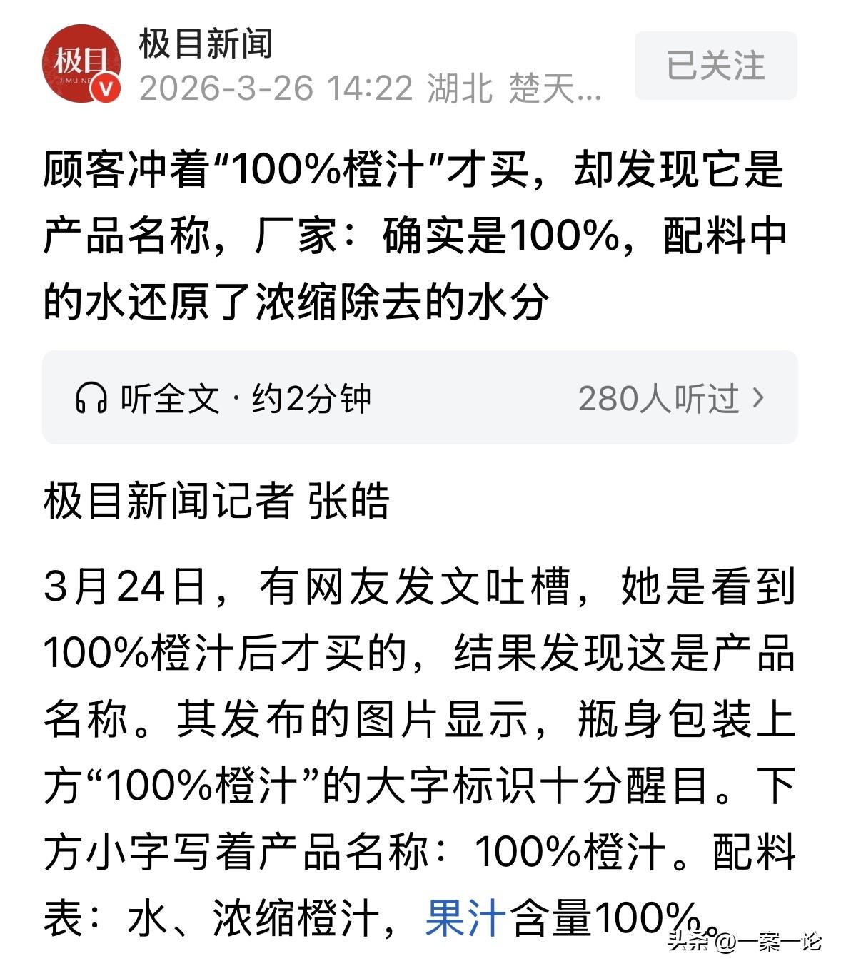 “吃相太难看!”女子买了瓶号称“100%橙汁”的饮料,结果买完才发现,这只是产品名称,配料表写着:水、浓缩橙汁,果汁含量100%,女子认为这就是厂家玩文字游戏,欺骗消费者。网友:浓缩果汁加水,也是100%,没毛病。 女子在超市买饮料时,一眼就瞅见这个果汁瓶身上印着硕大的“100%橙汁”。 买东西嘛,尤其果汁,谁不想喝个纯的?一看“100%”,那肯定是没加水、没加糖的原浆啊,于是她放心地掏钱买了。 结果回到家,女子细一看瓶身背面的配料表,这才发现自己被骗了。 配料表里写着:水、浓缩橙汁,最后还跟了个括号写着果汁含量100%。 女子非常生气。这正面看着像是纯得不能再纯的原榨,背面一看原来是“水兑浓缩汁”。 她觉得厂家这就是在玩文字游戏,利用大字误导消费者,就曝光到了网上。 网上的讨论倒是挺热闹,有一拨人站厂家,说这女子少见多怪。 他们的理由是,浓缩汁加水还原,在数学上确实是100%的果汁含量,只要没额外加糖、加色素,就不算造假。 还有人调侃说厂家这是“聪明”,懂得利用规则,既省了运输成本,又没违反规定。 当然,也有不少人支持这位女子,觉得普通消费者哪懂什么浓缩还原,大字标识就是为了让人产生误解,这属于典型的挂羊头卖狗肉式营销。 为了搞清楚这里面的门道,记者直接联系了涉事厂家。 厂家工作人员说,这瓶里的水不是额外加的“杂质”,而是为了运输方便,把橙子榨成汁后浓缩,去掉了水分,运到工厂后再把之前去掉的等量水加回来。 这就好比把干木耳泡发,最后还是木耳。至于瓶身上的大字,人家说了,“100%橙汁”是这款产品的通用名称,不是商标,而且是有国家标准撑腰的。 记者特意去翻了那个所谓的国标,文件号是GB/T 31121。里面写得明明白白,只要是把浓缩果汁里除去的水分加回来复原的制品,就可以声称自己是“100%果汁”。 这标准里分得很细,有“原榨果汁”和“复原果汁”。 厂家生产的这种,属于后者,虽然工艺上是先浓缩再加水,但只要果汁含量达标,叫“100%橙汁”完全合法合规。 厂家还透露,国内做果汁的企业基本都这么干,因为橙子产地和工厂往往不在一起,运浓缩汁能省下大笔运费,谁也不会傻到拉着一车水满世界跑。 记者随后去各大电商平台逛了一圈,发现还真如厂家所说,市面上类似的“100%橙汁”一抓一大把。 不管是大品牌还是杂牌子,瓶身上大多都印着醒目的“100%”或者“纯果汁”,但只要你翻到背面看配料表,十有八九都有“水”和“浓缩果汁”的身影。 有些甚至把“复原果汁”四个字印得特别小,不拿放大镜都找不到。 这样看来,厂家确实没撒谎,每一滴都是橙子变的,也没乱加东西,符合国家标准。 但问题在于,他们太懂得利用消费者的心理了。大家潜意识里觉得“100%”就是“现榨”,厂家却用行业标准把“复原”也包装成了“100%”。 这种做法虽然合法,但确实有点“鸡贼”,容易让那些不看配料表的人上当。 以后买果汁真得长个心眼,别光看正面吹得天花乱坠,翻过来看看背后的配料表才是硬道理。眼睛看到的不一定是真的,小字里藏着的才是真相。 《消费者权益保护法》第20条第1款规定:经营者向消费者提供有关商品或者服务的质量、性能、用途、有效期限等信息,应当真实、全面,不得作虚假或者引人误解的宣传。 虽然厂家拿出国标说“复原果汁”也能叫100%橙汁,但这不代表能随意“忽悠”。 法律要求商家必须真实、全面告知商品信息。瓶身正面用特大号字印“100%橙汁”,刻意隐去“复原”或“水+浓缩汁”的关键信息,利用消费者对“100%”等于“现榨”的普遍认知误差进行诱导,这就属于典型的“引人误解的宣传”。 哪怕配料表有小字,但正面视觉误导在先,实际上已经侵犯了消费者的知情权,涉嫌虚假宣传,不能因为符合行业标准就免除误导大众的责任。 对于这件事,你怎么看? 欢迎关注@一案一论