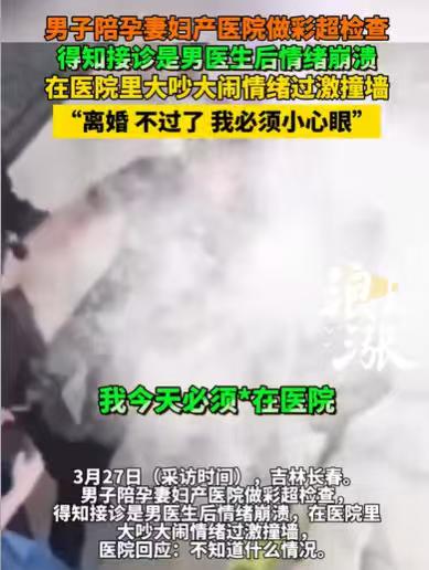 吉林长春,男子陪着妻子去做孕检,妻子出来,告诉他,给她做检查的是一个男医生,结果让人意想不到的事情发生了,男子居然骂妻子,要和妻子离婚,随后情绪激动,跑去撞墙,说要死在医院。 只见视频里,男子情绪非常激动,在医院的大厅,大喊道:“离婚,不过了。” 旁边有人在劝男子不要那么小心眼,男子反而情绪过激了,大喊道:“必须小心眼儿!” 说着不顾旁人劝说,就冲了过去,往墙上撞,男子又被阻拦之后,他还崩溃地说道:“我必须死在医院!” 一个检查而已,医生面前,无男女,这个男子的举动,也太让人不可理喻了。 他陪妻子来检查的时候,妻子觉得自己的丈夫还是挺贴心的,在检查的时候,妻子看到男医生,给她做胎儿彩超,也是有点惊讶。 所以出来之后,她才会将自己的事情说出来,“给我做检查的是个男医生。” 这本是是无心之语,纯粹就是分享自己的经历而已,却没想到,男子为此情绪激动了。 他的妻子做的是孕检,或许在他的意识里,做孕检的医生或者接生的医生,都应该是女医生。 毕竟孕妇都是女的,产检,生孩子这种事情,有男医生在场,实属不妥,所以男子听到妻子说,给她做检查的是一名男医生,他才会承受不住,才会情绪激动,才会在过激的情况下撞墙,才说要死在医院。 男子有如此过激的情绪,难道真的是因为男医生给他妻子做检查。 很多网友纷纷摇头,猜测男子要离婚,并非是因为是男医生给他妻子做检查,而是他终于找到离婚的理由了。 他们说,一定是他的妻子太好了,好到他根本找不到理由要离婚,正好妻子来检查,遇到男医生给她检查,男医生看了那些不该看的地方,所以男子要离婚,他不过了。 若是真是这个理由,欲加之罪,何患无辞,这个离婚的理由,简单,直接,还能把责任推给男医生。 若真是如此,这只能让人无语,想要离婚,这也是理由。 不过更多的人猜测,男子在意的,可能是男医生给他妻子做检查。 在很多人的眼里,女子生孩子,在孕检的过程中,在生产的过程中,不但是男子,还有很多女子,其实都希望由女医生来接诊。 女子在面对女医生的同时,可以放松心情,没有面对男医生的尴尬,事情可能会顺利很多,也避免了很多的尴尬。 如果是这个理由,很多人就觉得,这就是小题大做。 不少女子表示,在孕检的过程中,在生产的过程中,她们都面对过男医生,虽然会有些尴尬,但这都很正常的,都可以接受。 在很多女子眼里,即使做隐私的检查,或者生产,面对男医生,他们相信在男医生的眼里,没有男女之分的,男医生见多不怪,这是他们的职责,面对他们,无需尴尬。 事实确实如此,即使妇产科面对的是女子生孩子的问题,就算是做孕检,会有比较隐私的部位检查,不应排斥男医生。 如果因为这些原因,拒绝男医生,这不利于医学的发展,作为孕妇产妇,作为他们的家属,应当接纳这种现象,应当认清这是正常的。 至于这个男子,为何如此情绪激动,到底是因为男医生给他妻子做检查,要离婚,还是因为有别的原因,要离婚,这恐怕只有男子才知道。 不管是哪一种情况,男子现在都不可以离婚,因为他妻子在孕期,他是不可以提出离婚的。 《民法典》第1082条规定:在女方怀孕期间、分娩后一年内或者终止妊娠后六个月内,男方不得提出离婚。 如果仅仅因为妻子检查时是个男医生,就要离婚,这个男子不但是小心眼,还很不负责任。 其次,妻子在孕期,以及生完孩子之后,她都是比较虚弱的,是需要照顾的,男子应当照顾妻子。 《民法典》第1059条规定:夫妻有相互扶养的义务。需要扶养的一方,在另一方不履行扶养义务时,有要求其给付扶养费的权利。 夫妻之间,重要的就是相互关怀,相互照顾,在这个时候,男子对妻子有扶养义务,不管出于什么原因,都不能提出离婚。 那么你认为男子是为何要提出离婚呢?