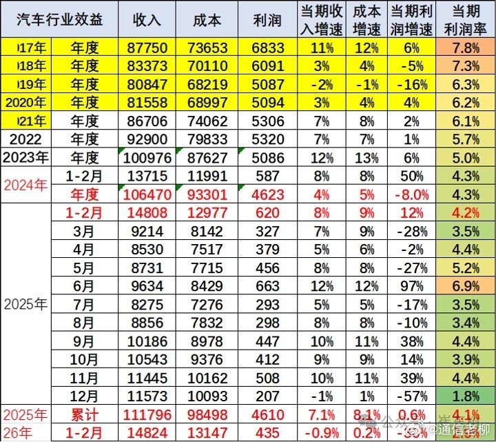 【形势不妙,新能源车竞争要加剧了,哪家会掉队?】据崔东树发布的信息,2026年1-2月我国汽车生产402万台,同比降10%。汽车行业收入14824亿元,同比降0.9%;成本13147亿元,增0.2%;利润435亿元,同比降30%;汽车行业利润率2.9%,今年一二月份汽车销量出现下滑,新能源车占比竟然出现下降: