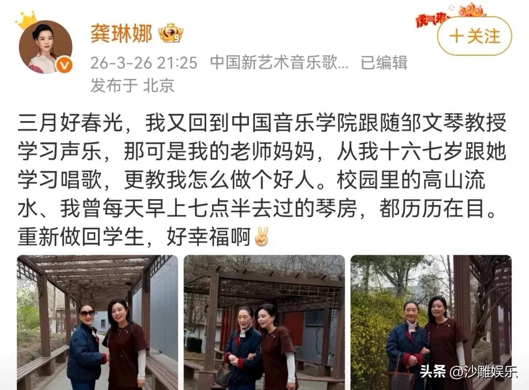 龚琳娜,深夜激动发文! 3月26日晚,当大多数人还在为琐事烦忧时,歌手龚琳娜却用一条动态,给无数网友的心里下了一场温暖的“春日雨”。 她突然在社交平台晒出一组照片,配文看得人心里软乎乎的。原来,在这三月春光正好的时节,她没有奔波于各大舞台,而是悄悄回到了梦想开始的地方——中国音乐学院,重新坐到了恩师邹文琴教授的面前。 镜头里,龚琳娜挽着年迈的邹老师,在校园的木长廊里牵手笑,在木栈道上并肩走,两人站在迎春花旁,脸上的笑容比春光还要暖。她亲昵地称邹老师为“老师妈妈”,并动情地写道:“从十六七岁就跟着老师学唱歌,她不仅教我唱好歌,更教我做好人。” 这一刻,哪还有什么“神曲天后”的影子?分明就是一个回到母亲身边、满眼依恋的小姑娘。 这组照片,龚琳娜“炫”的不是名牌包包,不是豪华派对,而是那份历经岁月沉淀依然滚烫的师生情。她特意提到校园里的“高山流水”,提到每天早上七点半必去的琴房,这些细节太有画面感了。对于我们这些旁观者而言,这哪里是回忆,分明是我们每个人都曾拥有却渐渐模糊的青春啊! 原来,即便是站在行业顶端的歌唱家,在恩师面前,记忆也会瞬间闪回到那个练声的清晨。这种“重新做回学生”的幸福感,比任何舞台上的掌声都来得更沉、更真。 很多网友看完感慨:“原来龚琳娜的底气,是这位‘老师妈妈’给的。” 这话一点不假。邹文琴教授是国内顶尖的声乐教育家,桃李满天下。我们总以为龚琳娜的“神曲”是剑走偏锋,是她大胆的艺术实验。但今天大家才恍然大悟:她那足以驾驭任何高难度作品的扎实功底,那份无论外界如何喧嚣都能稳住内核的“定力”,根源就在这里。 如果说龚琳娜是舞台上那只自由翱翔的风筝,那邹文琴教授,就是那条永远系着她、让她不会迷失方向的线。 在这个“速食”时代,我们见惯了太多“人走茶凉”的师徒反目,也看腻了“流量至上”的塑料情谊。龚琳娜这波“回忆杀”之所以能精准戳中网友的泪腺,是因为它太“真”了。 这声“老师妈妈”,喊出的是人品,更是传承。它让我们看到,真正的艺术家,永远保持着一份对初心的敬畏。哪怕龚琳娜已经成了“神曲天后”,在教她长大的人面前,她依然可以卸下所有光环,变回那个乖乖学唱歌的孩子。 龚琳娜的这条动态,就像一剂温柔的“时光胶囊”。她让我们明白,无论一个人走得多远、飞得多高,在赋予你翅膀的人面前,你永远可以卸下铠甲,变回那个眼里有光、心里有梦的少年。 或许,这就是为什么网友们会如此动容。因为我们每个人心中,都有一个想回去的“琴房”,和一位想再叫一声“老师妈妈”的人。 这个春天,谢谢你,龚琳娜,让我们看到了最美好的“反哺”。