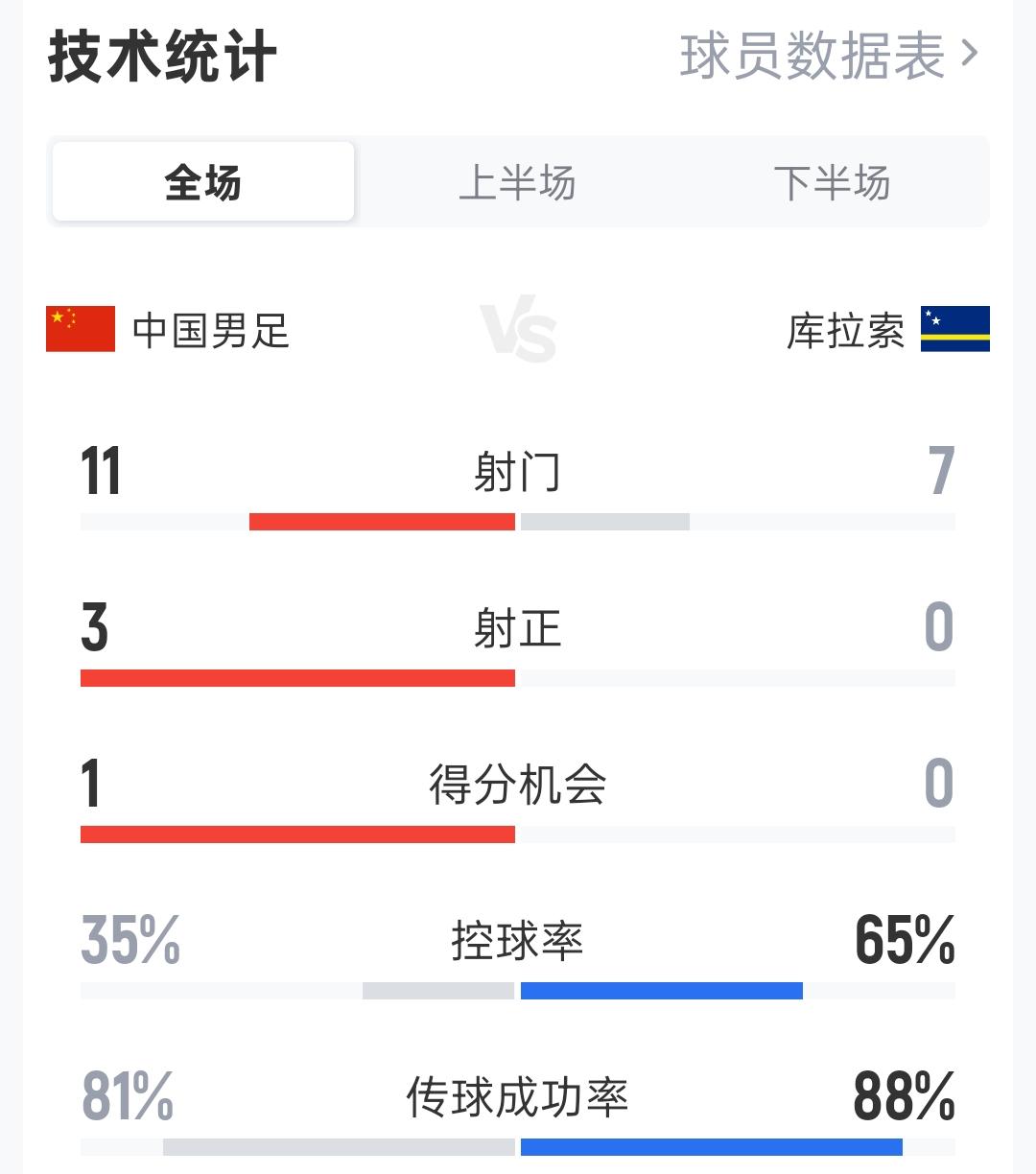 2:0击败世界杯参赛队库拉索,邵佳一其实还是延用了前任主帅伊万的战术,阵型变了核心打法没变,仍然是死守打反击,前场一高(张玉宁)一快(王钰栋)组合的老一套。 中国队基本放弃了控球,全场控球率就只有35%,这个控球率在之前的世预赛比赛中是中国队最常见的控球率。 但是与伊万在任时不同的是,中国队的防守稳固了许多,把握机会能力也变强了,变得更加高效一些,全场比赛3次射正就打进了2球。 就目前来看,邵佳一选择这样的战术也可以理解,中国队的实力摆在那里,想打传控没有那个能力,老老实实的练好防守反击也许是中国足球唯一的出路!