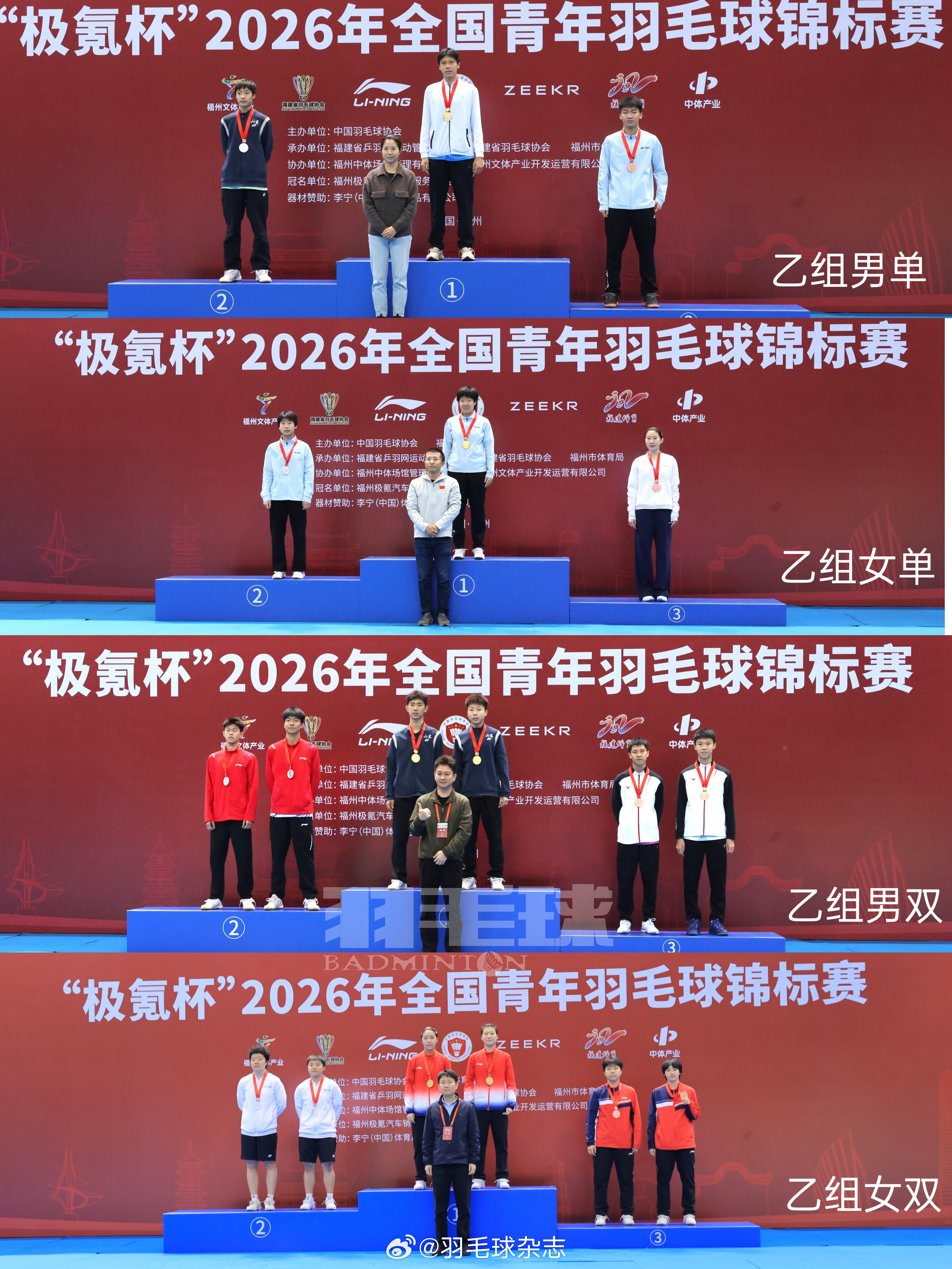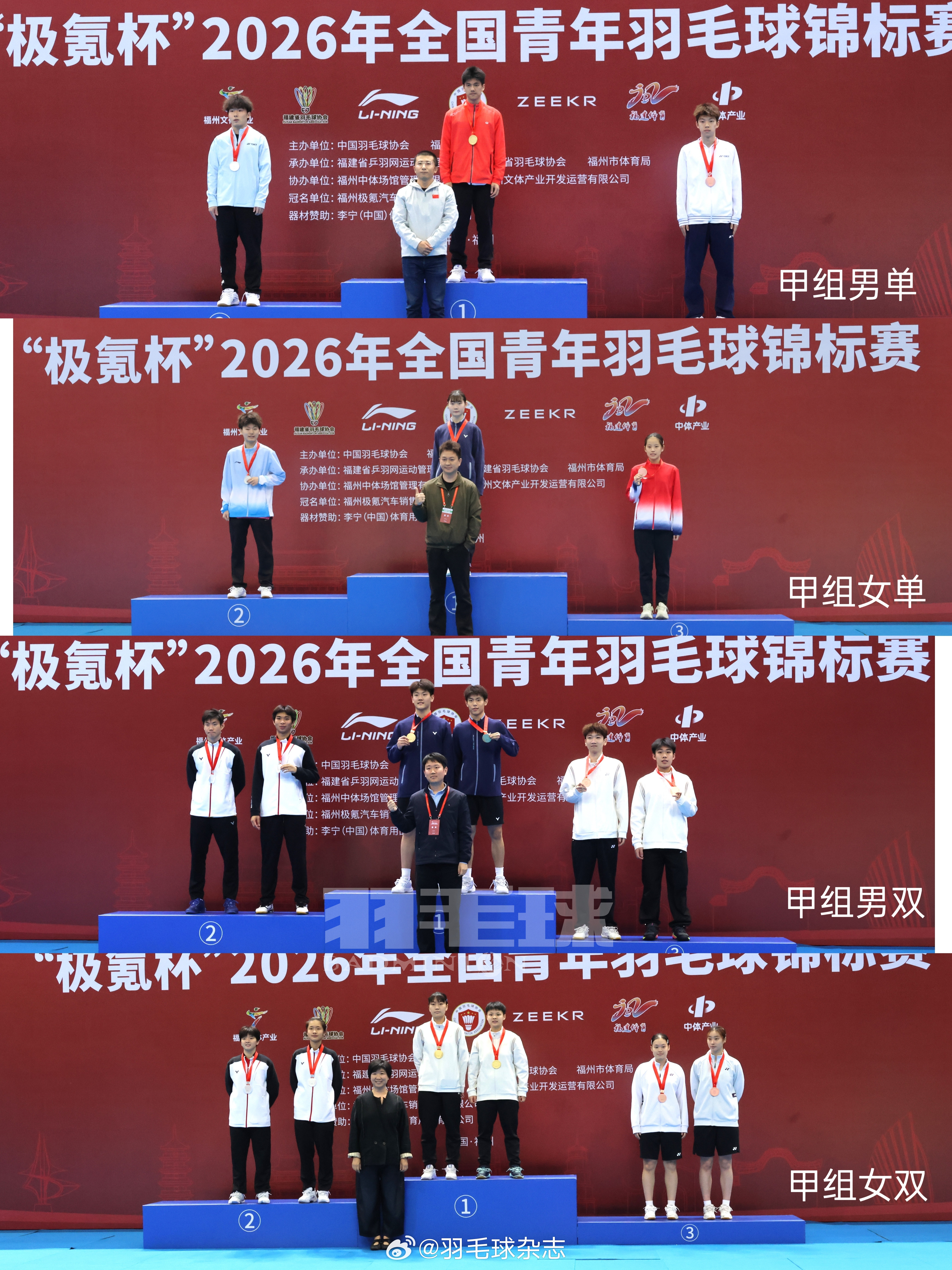 2026年全国青年羽毛球锦标赛昨天下午在福州海峡奥体中心体育馆落下帷幕,为期八天的单项赛决出各项目名次。其中,九个单项冠军由七支队伍分别夺得,江苏队和重庆队分别夺得两冠,重庆队包揽甲组和乙组两个组别的男单冠军。