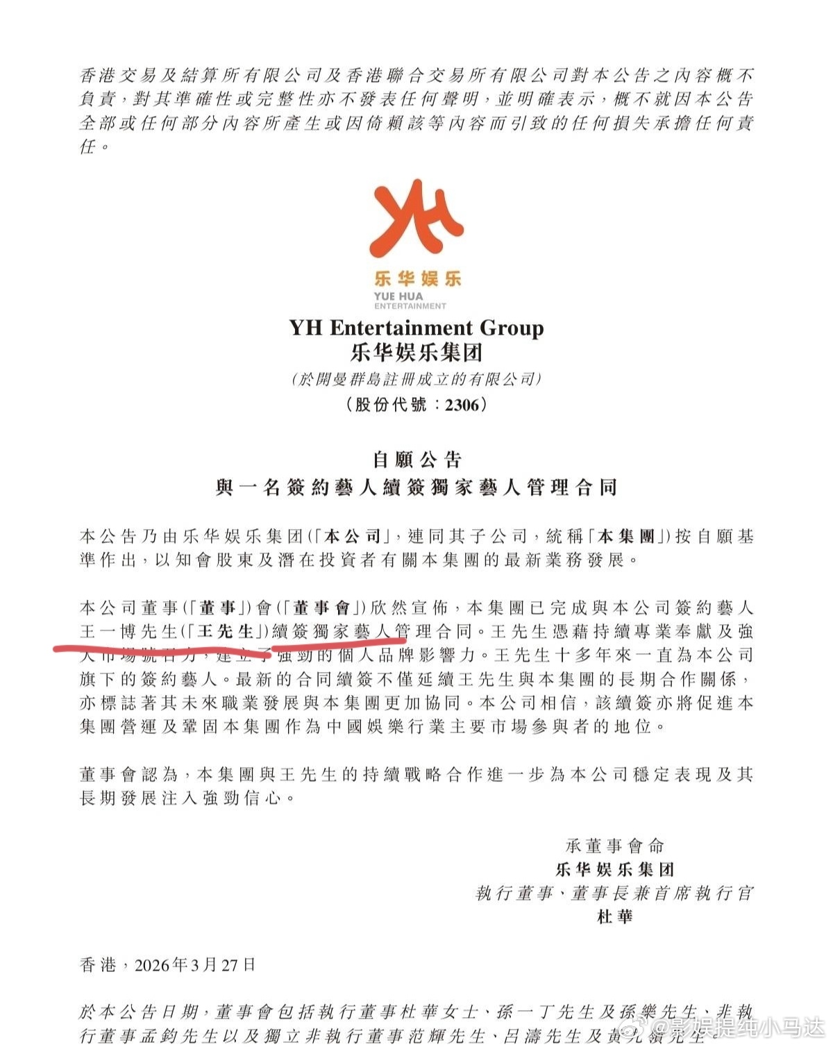 王一博乐华续约乐华娱乐发布公告,已与王一博续约,续签了独家艺人管理合同。