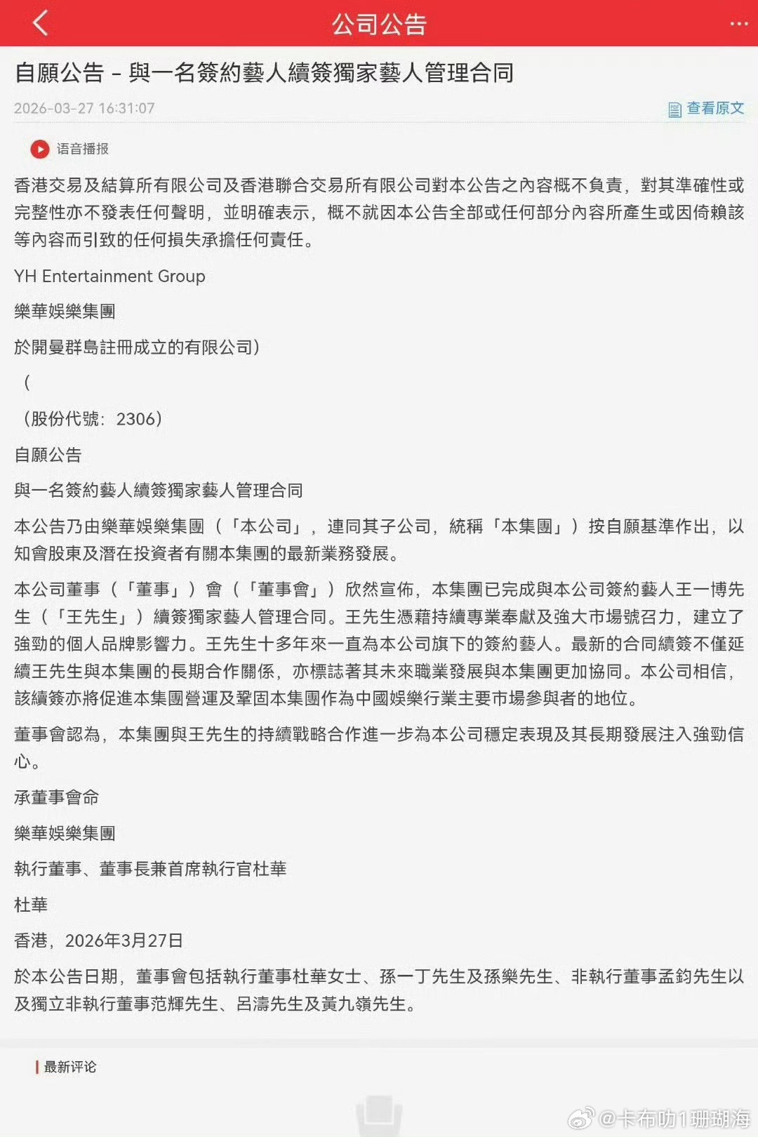 网上看到王一博已经继续和乐华续签了么?