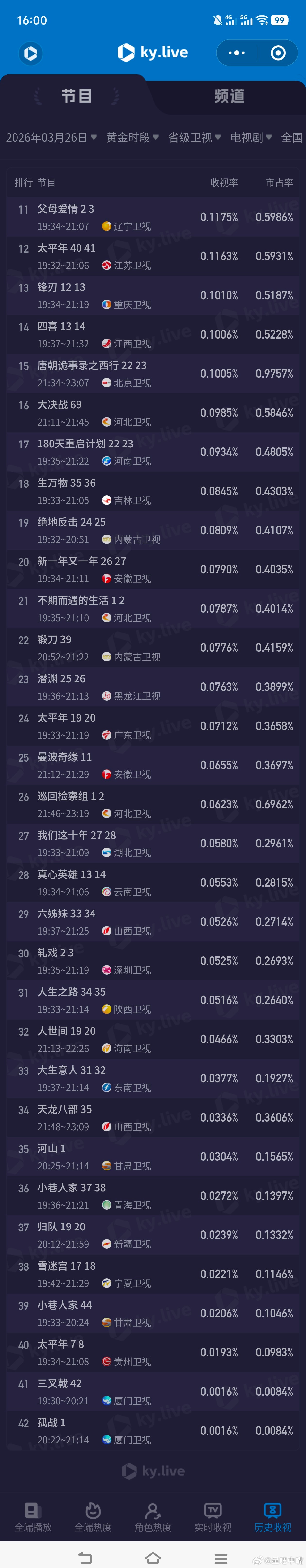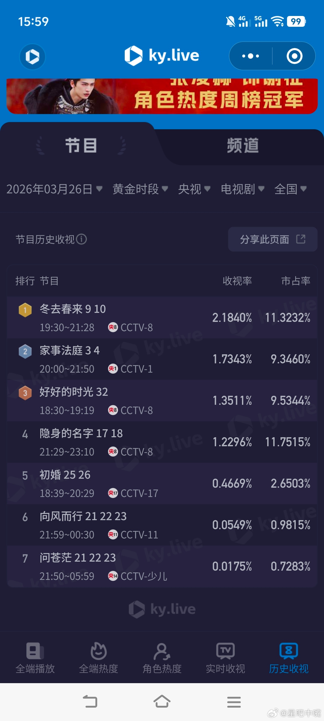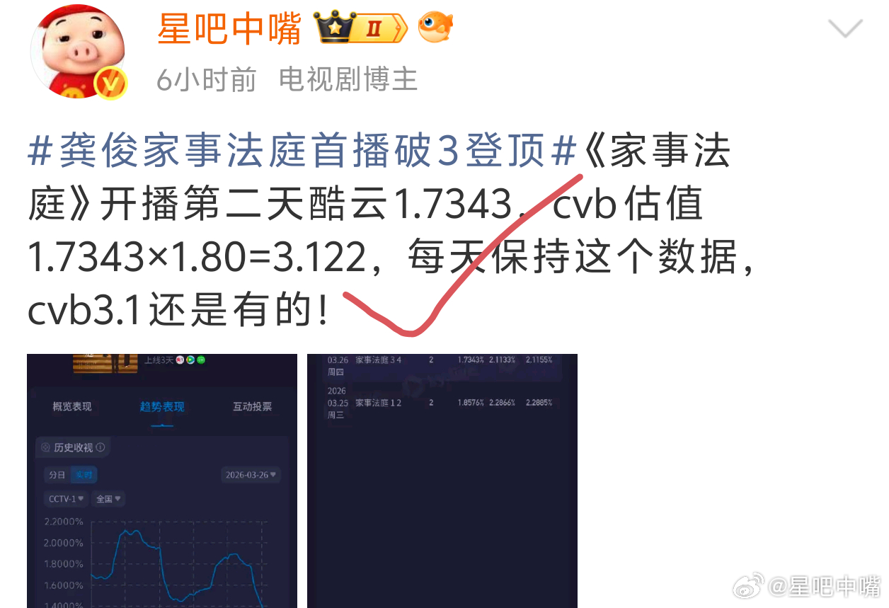 家事法庭3月26日cvb收视日报!家事法庭3.129,酷云1.7343,系数1.804冬去春来1.940,酷云2.1840,系数0.888逐玉 0.498,酷云0.4699,系数1.060