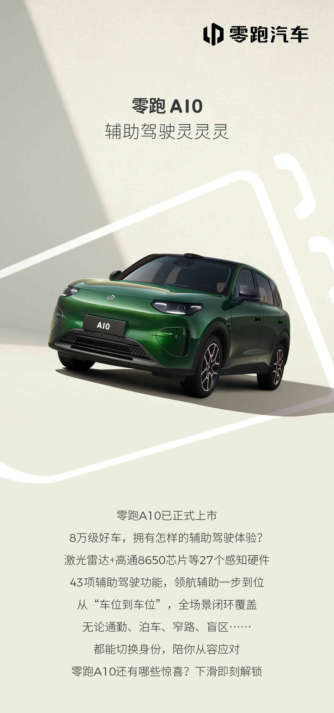 8万级好车,辅助驾驶能做到什么程度?零跑A10搭载激光雷达+高通8650芯片,27个感知硬件加持43项辅助驾驶功能,覆盖从车位到车位的出行场景就像有个老司机在身边,一路更安心还有哪些惊喜?戳图看看👀零跑A10开启激光雷达8万时代陈都灵代言零跑A103月26日零跑A10上市