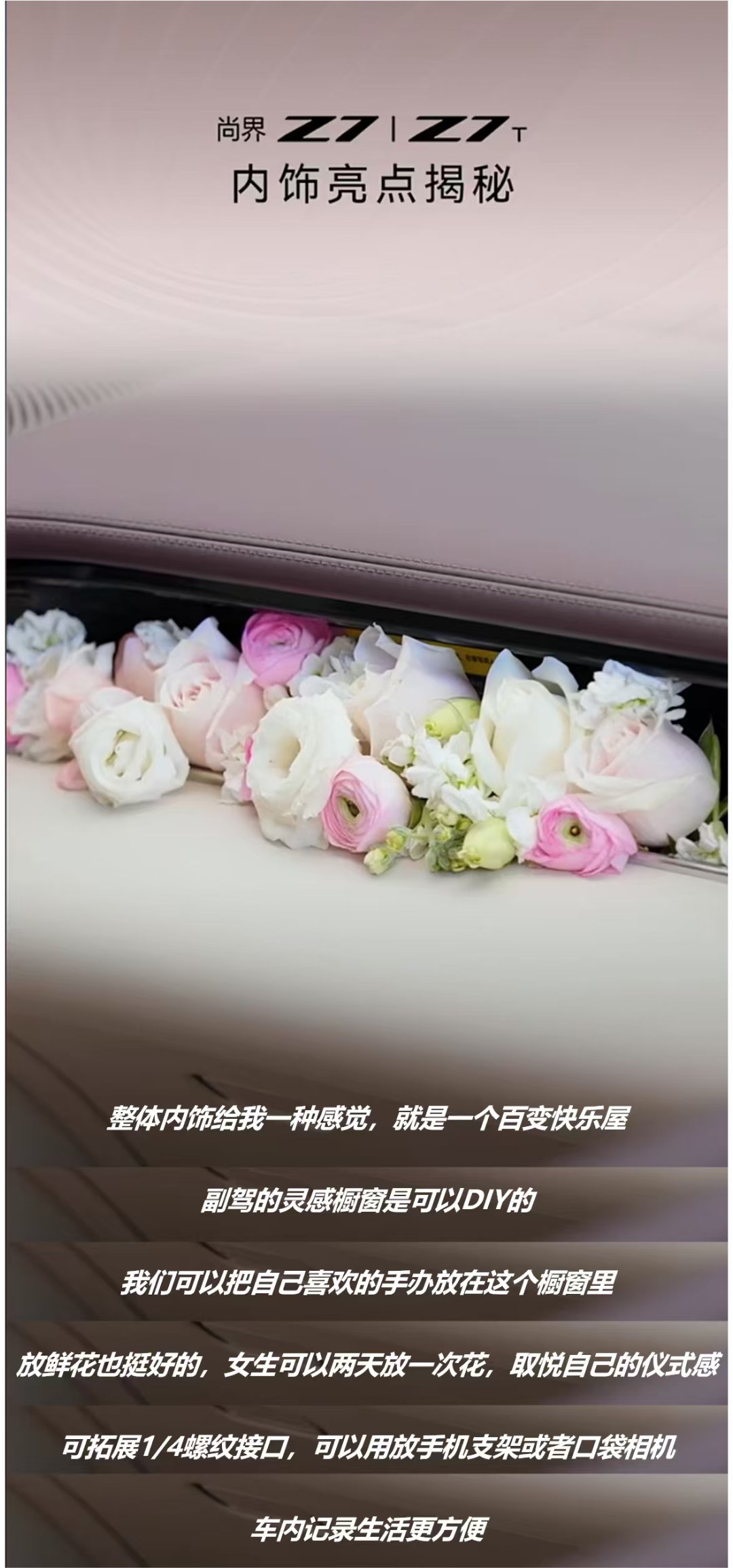 尚界Z7内饰亮点揭秘 尚界Z7、Z7T今天更多的内饰设计亮出来了,为年轻用户打造百变快乐屋。灵感橱窗,随动屏,前后排共20处储物空间,PUSH-PUSH充电台则让折叠手机在展开状态下也能享受充电自由。多色氛围灯提供柔和光线,实现“见光不见灯”的视觉效果。可玩性、精致感、仪式感,都给足了😍