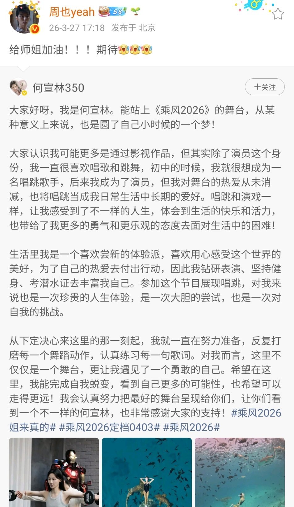周也给何宣林打call周也来给何宣林打call啦!何宣林竟然是周也师姐!难怪都这