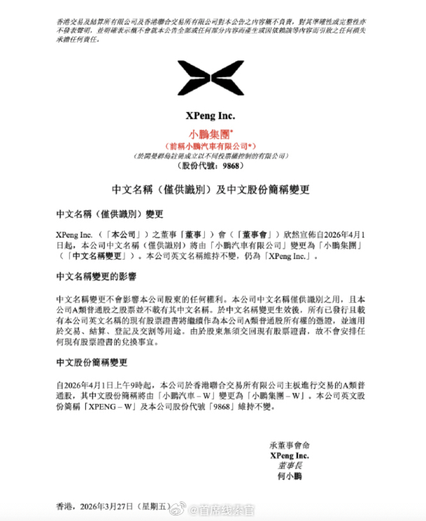 - 「小鹏汽车有限公司」更名为「小鹏集团」。