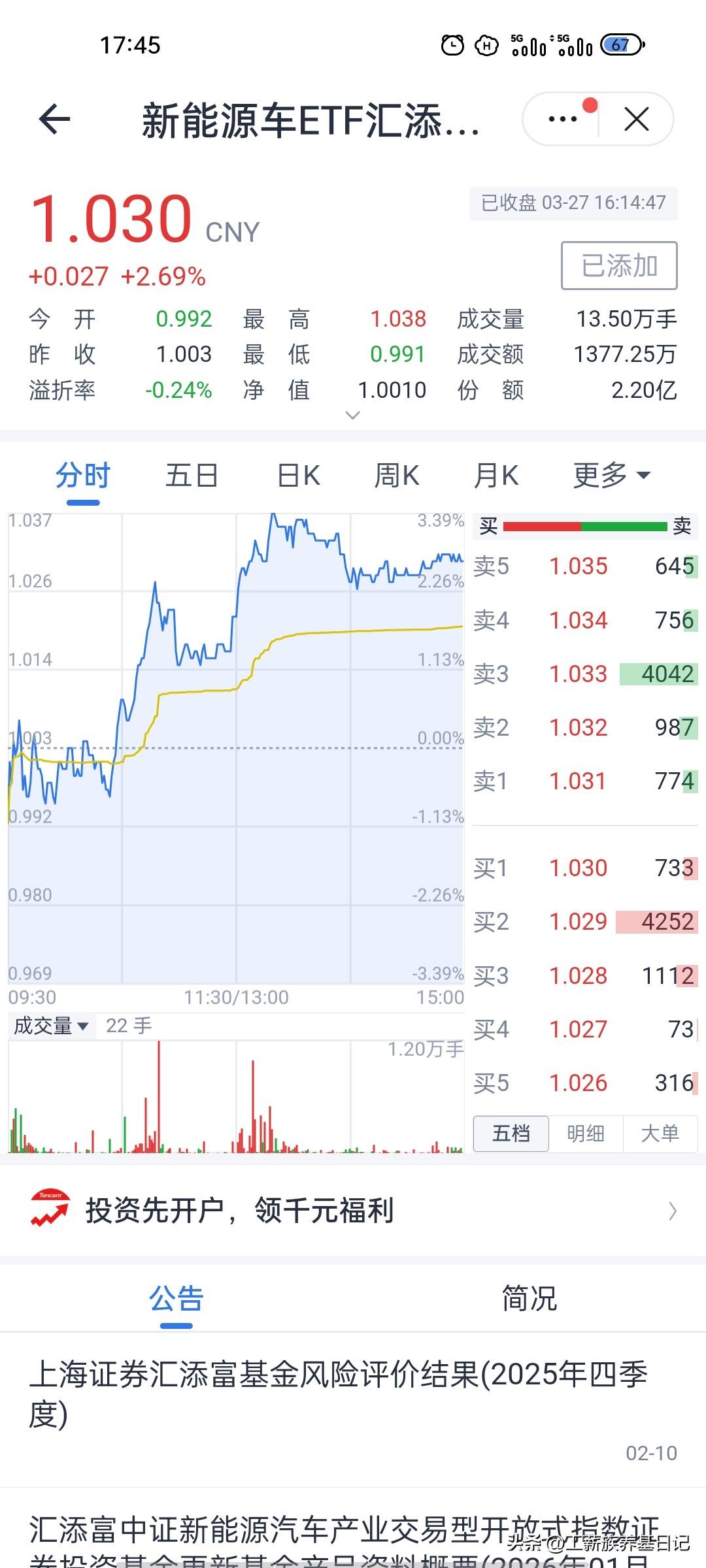强势反弹!新能源车ETF企稳反攻,短期剑指1.05元压力位 汇添富新能源车ETF在今天走出了十分亮眼的修复行情,不仅低开后一路震荡走高,午后更是牢牢维持在高位运行,整体表现相当强势。截至收盘,价格定格在1.030元,单日涨幅达到2.69%,全天开盘0.992元,最低下探至0.991元,最高冲高到1.038元,成交额也来到1377.25万,整根K线就是一根典型的强势修复阳线。 随着这根阳线的出现,技术面上也释放出了积极信号,它不仅成功收盘站上EMA12均线1.003元的位置,正式确立了短期的多头趋势,而且距离EMA50均线1.006元也仅有一步之遥,眼看就要完成关键均线的突破。与此同时,今日的量能相比前几日也出现了温和放大,能够明显看出资金进场的意愿在持续增强,为这波反弹提供了实实在在的支撑。 从日线结构来看,这只ETF已经连续两天收出阳线,从前期低点0.944元算起,反弹幅度已经超过9%,底部反转的形态也初步形成。在顺利突破短期均线的压制之后,向上的运行空间也随之被打开,接下来将要面对的就是1.05-1.07元区间的压力位置。而且这波反弹还呈现出量价齐升的健康状态,并非单纯的市场情绪炒作,这也意味着反弹的持续性会更有保障,只不过中期趋势上,它依旧处于2026年以来的震荡区间之内,暂时还没有走出真正的趋势性行情,只是短期反弹的动能十分充足。 基于当前的走势,我认为接下来一到两周它大概率会延续目前的强势格局,继续向1.05-1.07元的区间发起冲击。如果后续能够稳稳站稳EMA50均线,甚至还有机会去挑战前期高点1.079元,只要周末没有出现利空消息,下周继续收红的可能性是非常大的。 不过风险点也同样需要留意,毕竟上方积累的套牢盘数量较多,冲高之后很容易引发获利回吐的抛压。再加上新能源车本身属于成长板块,一旦大盘走弱,它的回调幅度往往会大于指数,所以在看好反弹的同时,也不能忽略潜在的波动风险。 你们觉得呢?以上纯属个人愚见,欢迎探讨!