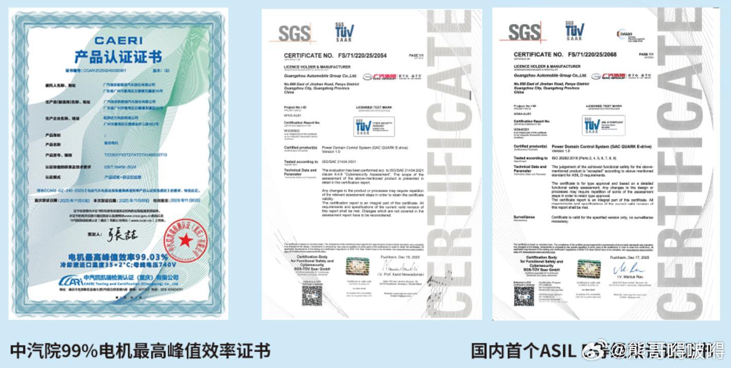 广汽率先将航天级非晶合金材料应用于电驱领域,实现规模化量产。其夸克电驱2.0电机效率高达99%(全球最高),功率密度突破17.29kW/kg,荣获2025年全球新能源汽车创新技术奖。该电驱还获ASIL D功能安全与信息安全双认证,树立效率与安全双重标杆。广汽埃安即将在15万元级车型N60上搭载该技术,让普通用户享受更长续航、更低能耗的普惠科技,引领电驱技术从材料突破走向全民普及。夸克电驱2.0广汽埃安夸克电驱2.0