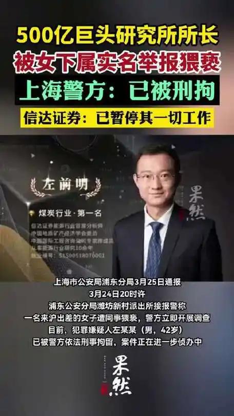 博士所长酒后露原形 职场性骚扰被当场抓包 “打一针就好了”,这句粗鄙言论竟出自信达证券研究所所长左前明之口,瞬间引爆全网。 这位顶着博士光环的精英,在上海出差期间,于深夜饭局后彻底撕下伪装。酒店大堂众目睽睽之下,他对女下属动手动脚,强行拖拽拉扯,态度嚣张跋扈,毫无道德底线。平日里西装革履谈投资,私下里却把职场权力当耍流氓的工具,反差大到令人震惊。 万幸保安及时出手制止,受害女性未再受辱。她不卑不亢,果断逃离现场,在火锅店第一时间报警并实名举报,全程保留证据,没给恶人留任何喘息余地。 事件曝光后,信达证券迅速响应,直接暂停左前明所有工作。法律也绝不姑息,其已被依法刑拘,昔日风光无限的行业大拿,瞬间沦为人人唾弃的阶下囚。 学历从不是恶行的“遮羞布”,职位更不是越界的“通行证”。这场闹剧狠狠打了某些“伪精英”的脸,看似光鲜的身份,掩盖不了骨子里的卑劣。 职场从来不是法外之地,无论头衔多高、学历多硬,触碰底线必遭严惩。 大家怎么看这件事?你觉得该如何杜绝职场性骚扰这种恶行?
