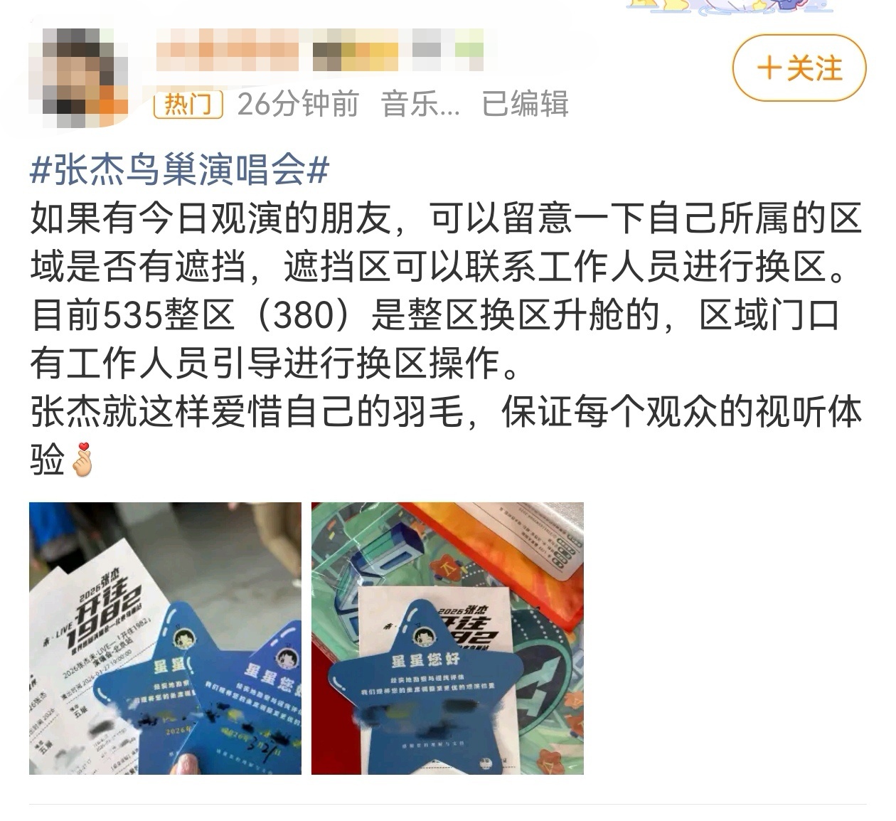 张杰鸟巢演唱会主动更换视线遮挡区 谁懂啊真的被张杰暖到!粉丝座位视线被挡,进场前就主动帮忙调换,超级贴心周到!处处为粉丝着想,用心给大家最好的现场体验,这种双向奔赴太好哭了,人品和格局真的没话说!张杰主动给视线遮挡观众换座位