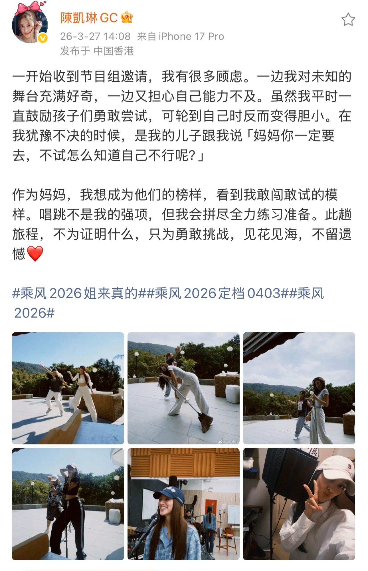 乘风2026官宣阵容 香港:陈凯琳