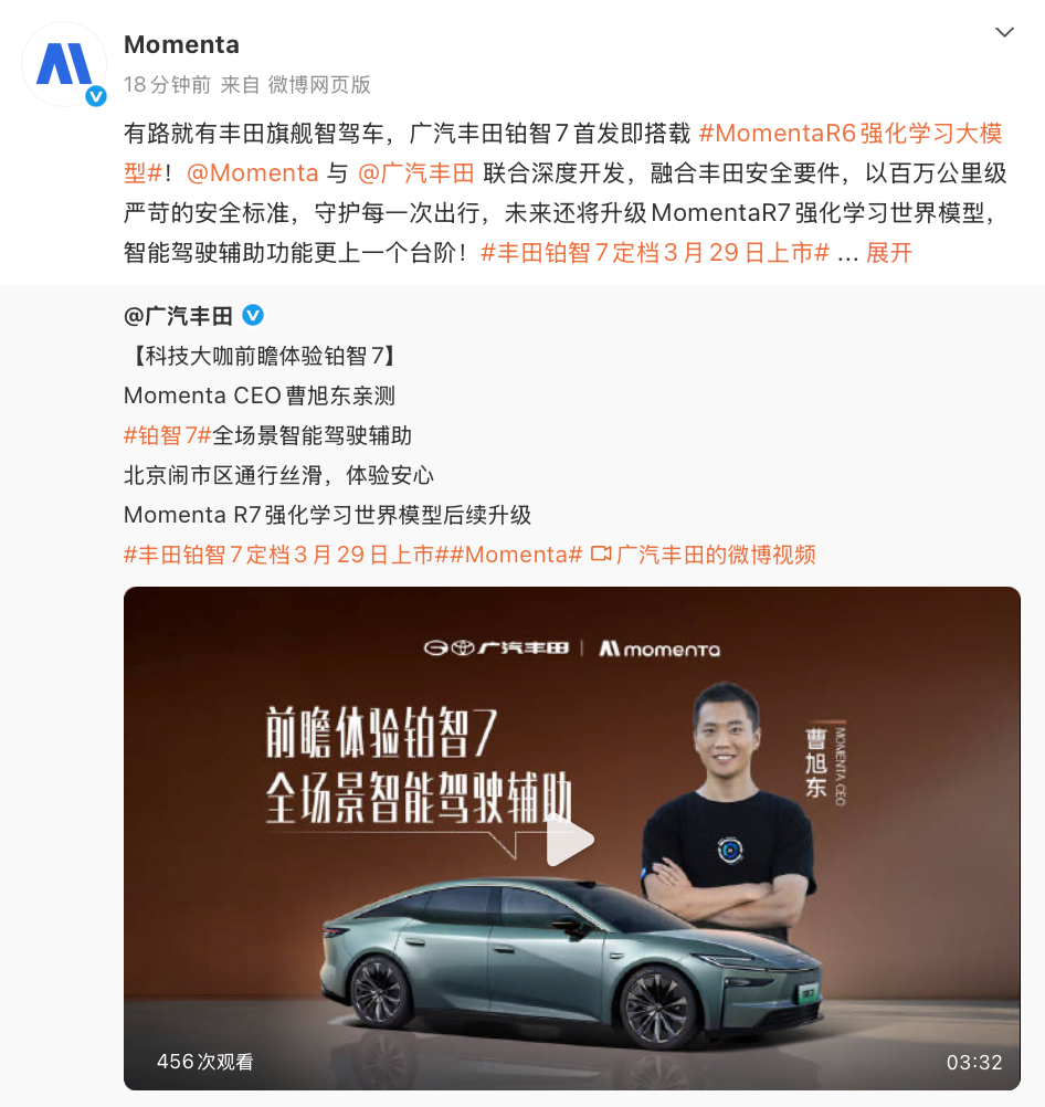 【曹旭东说丰田铂智7将上R7大模型】 铂智7发布前科技大咖先验货 铂智7新车上市在即,Momenta CEO曹旭东提前实测,这场来自智驾领域核心人物的专业体验,并非普通试驾,更像是一次行业级技术检验。