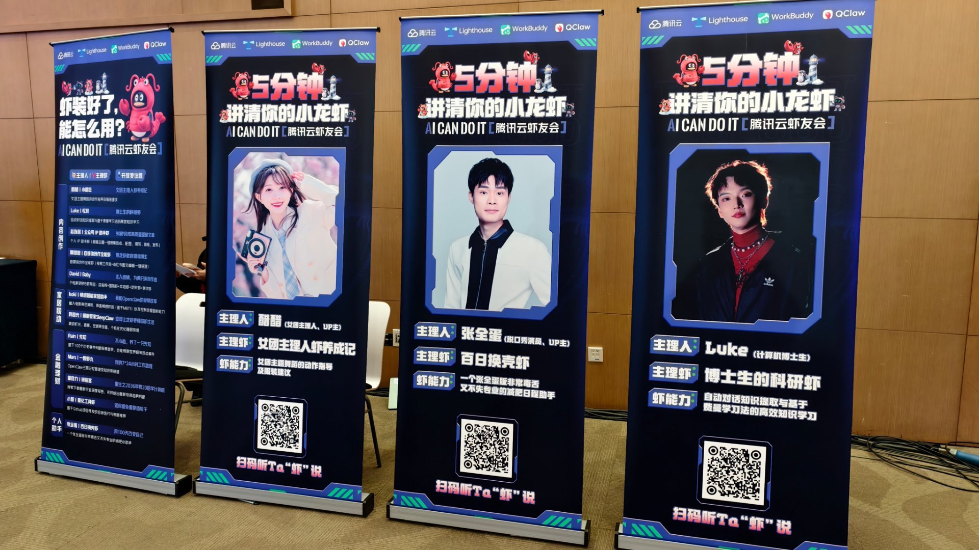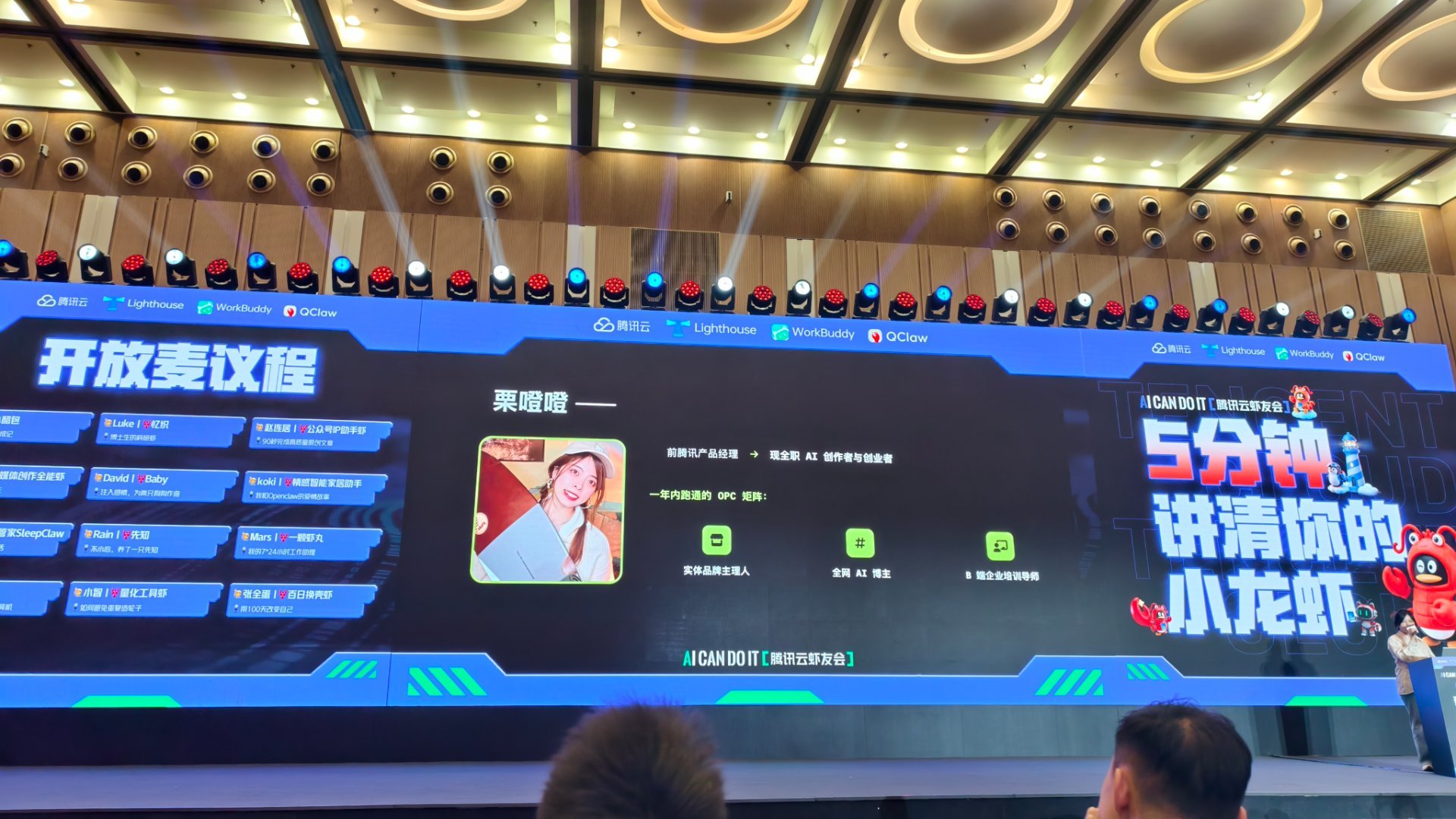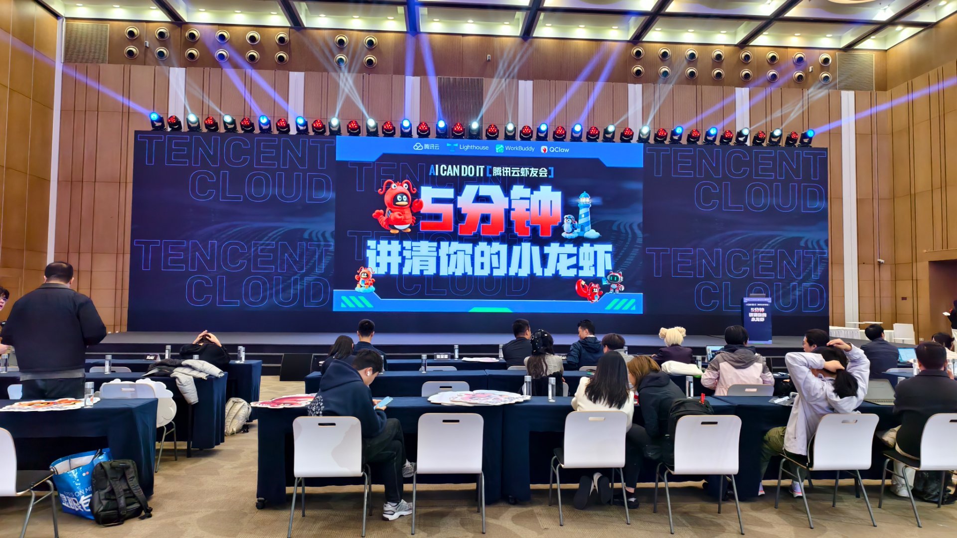 今晚来参加腾讯开FUN夜AI派对了,现场有一个5分钟讲清你的小龙虾的舞台,使用腾讯WorkBuddy,大家分享了各自养的小龙虾,有女团虾,微信公众号自动虾,还有自动做视频虾,自动做音乐虾,大家很有想法。