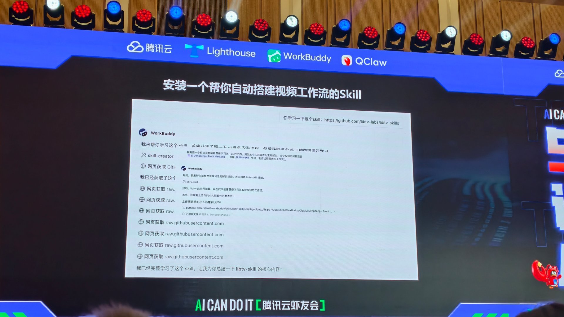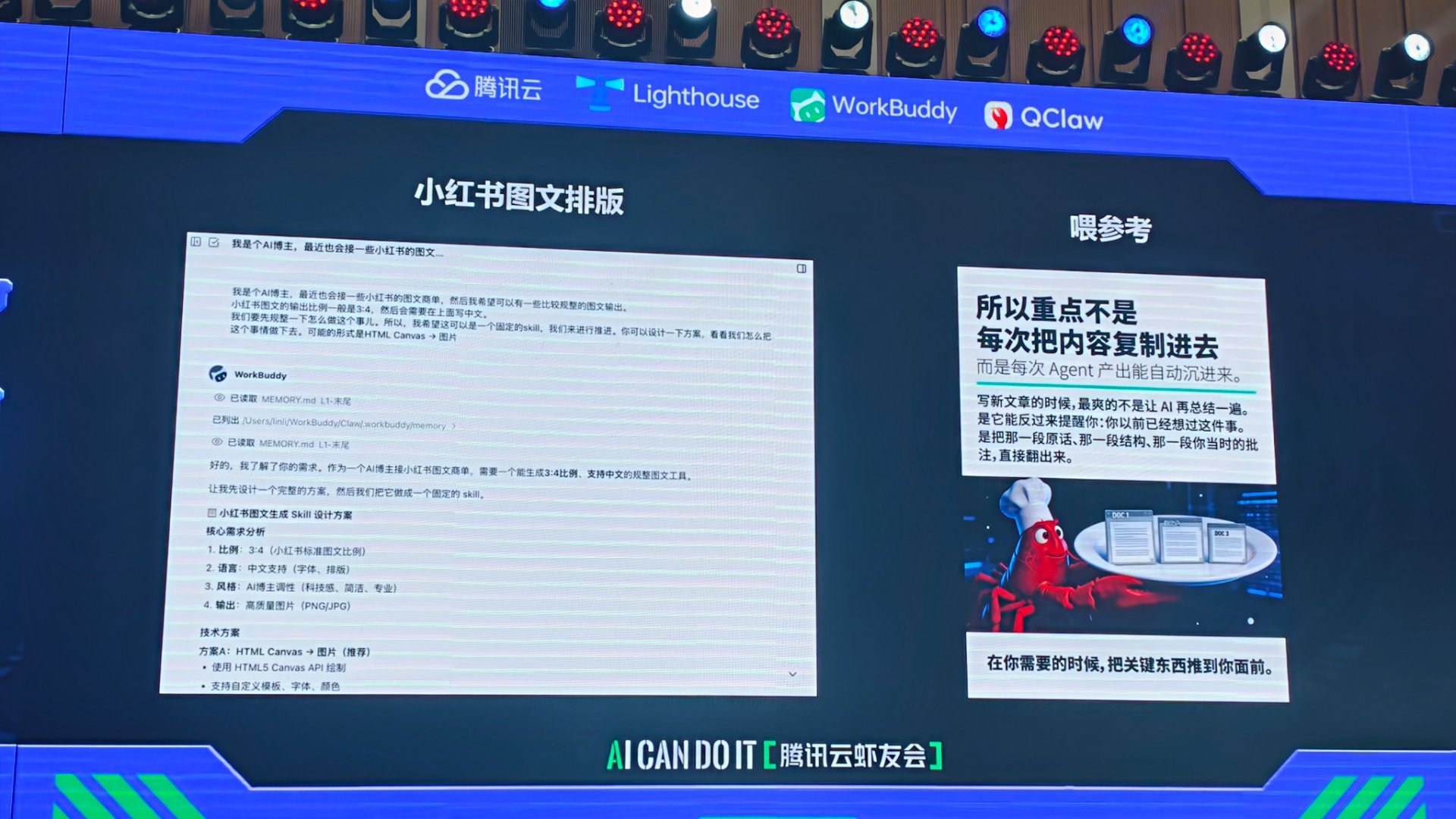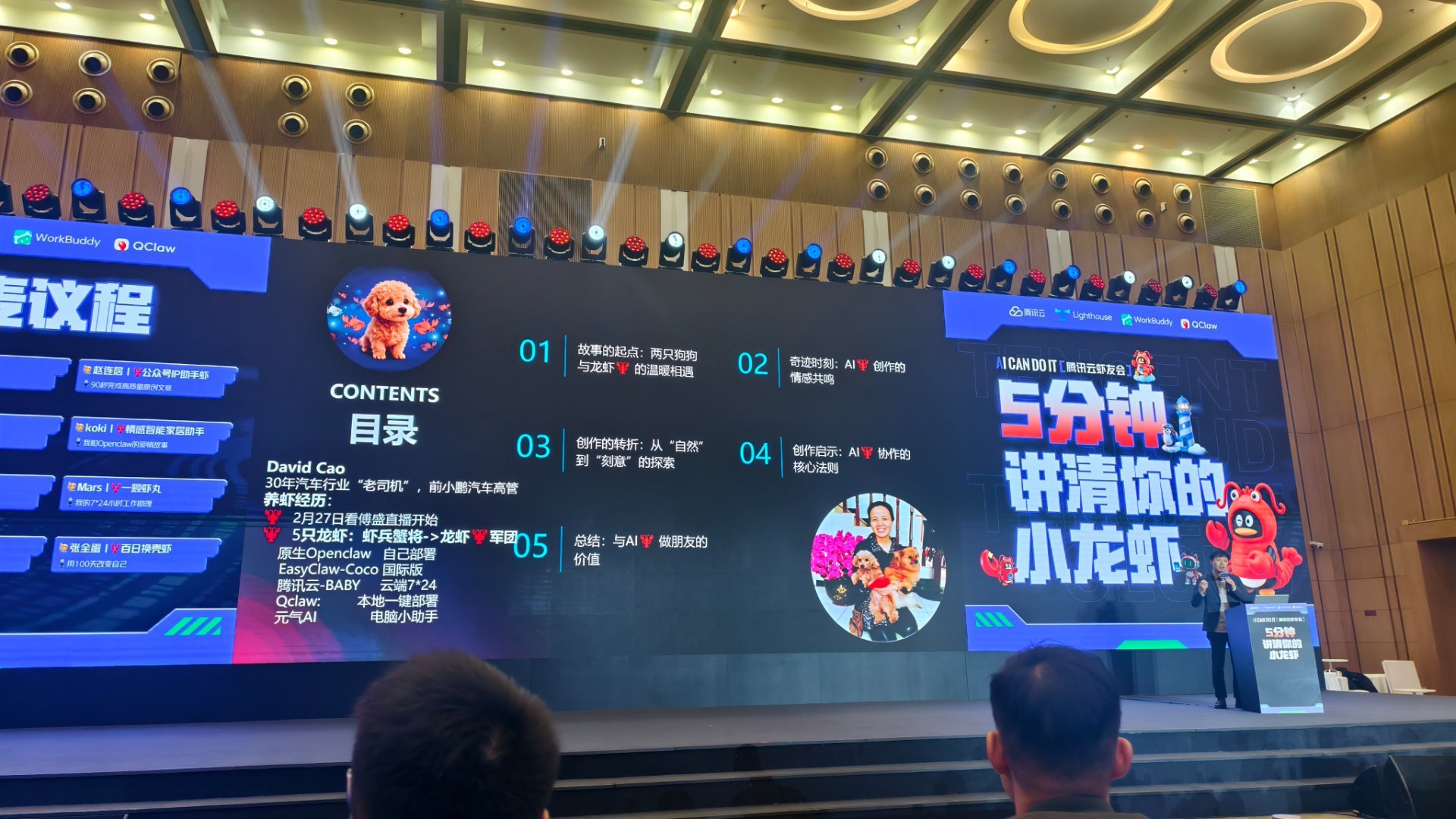 今晚来参加腾讯开FUN夜AI派对了,现场有一个5分钟讲清你的小龙虾的舞台,使用腾讯WorkBuddy,大家分享了各自养的小龙虾,有女团虾,微信公众号自动虾,还有自动做视频虾,自动做音乐虾,大家很有想法。
