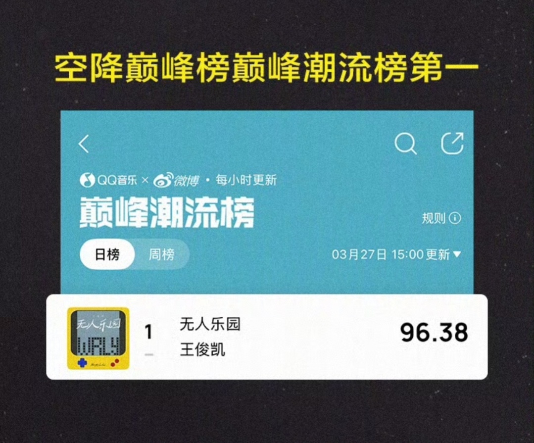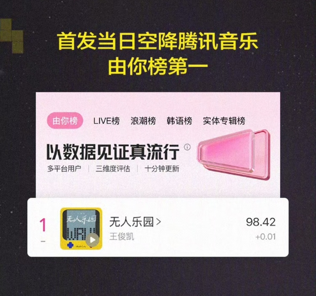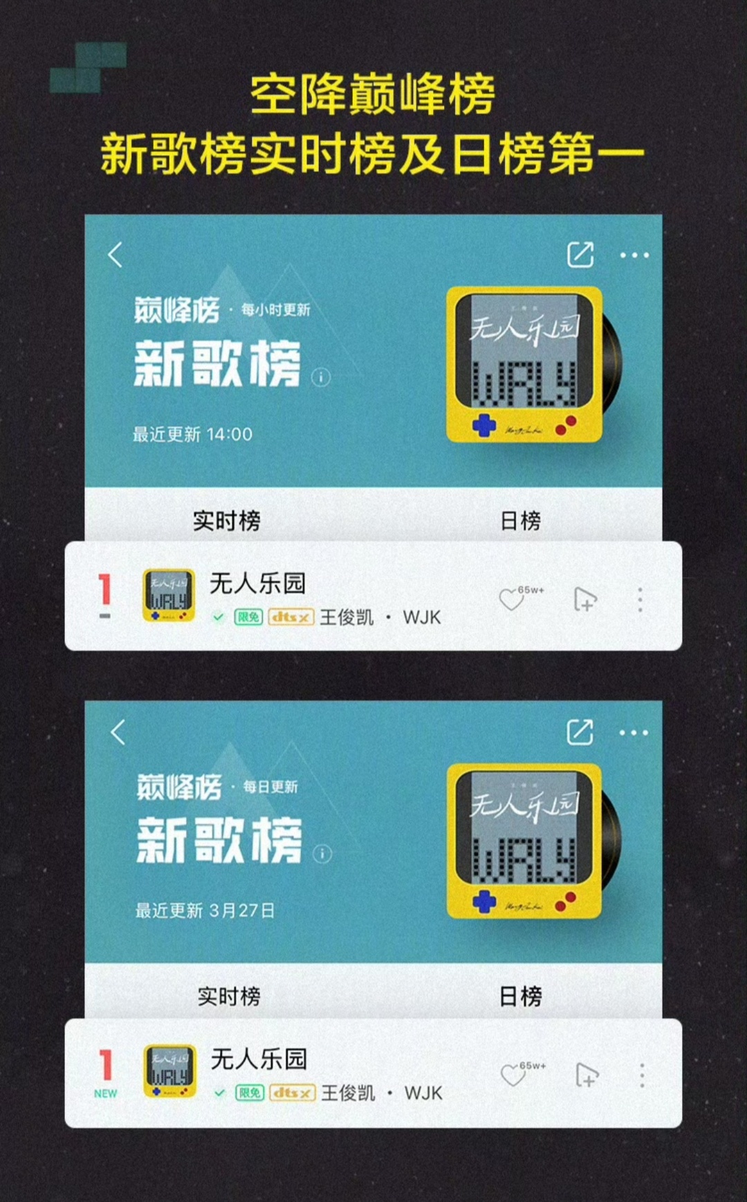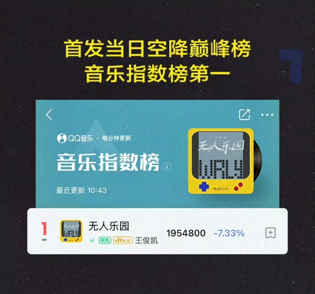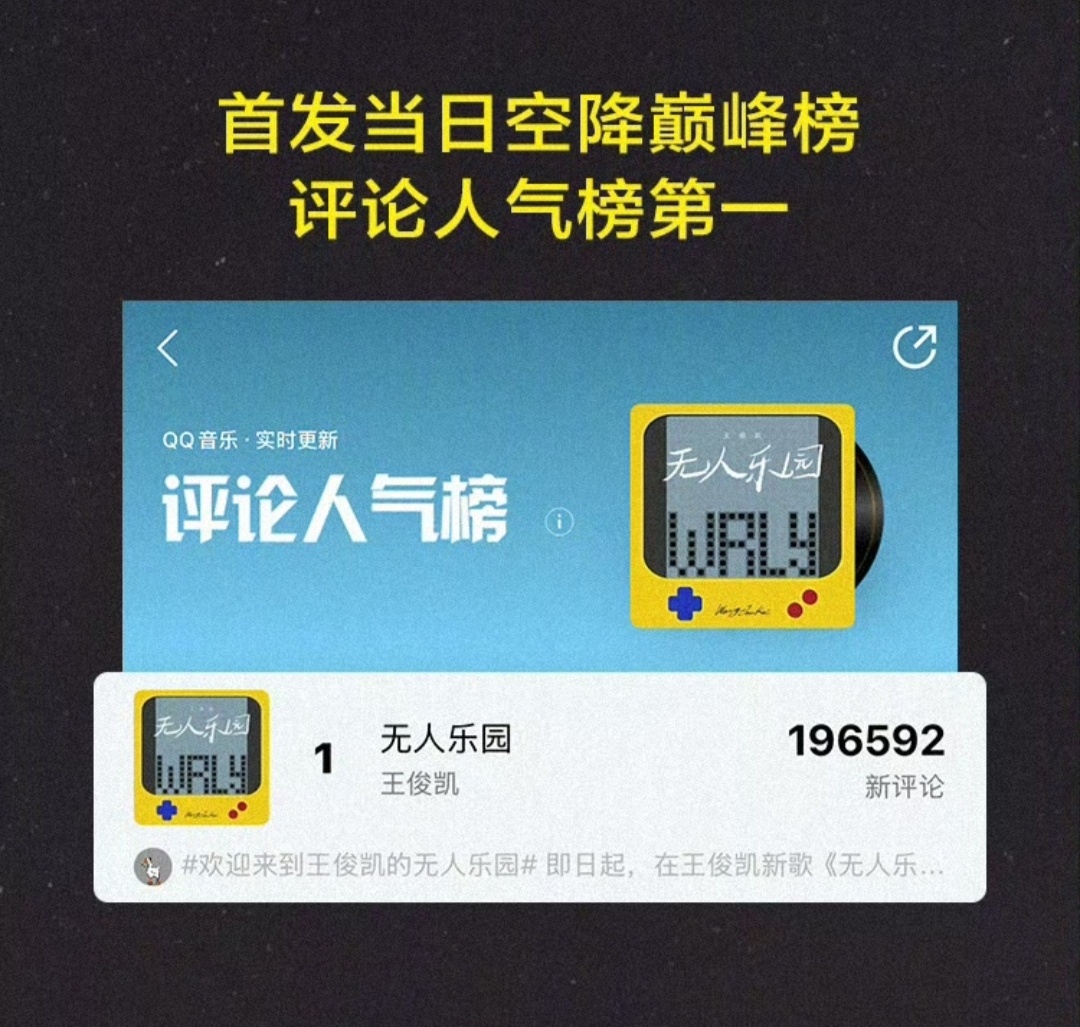 王俊凯新歌无人乐园战报王俊凯新歌《无人乐园》战报出炉💙上线56秒评论破999+ 33分53秒破100000+空降巅峰榜飙升榜+新歌榜实时榜及日榜+巅峰潮流榜第一!首发当日空降巅峰榜音乐指数榜+评论人气榜+在听热度榜+腾讯音乐由你榜第一!期待新专辑 王俊凯无人乐园七榜第一