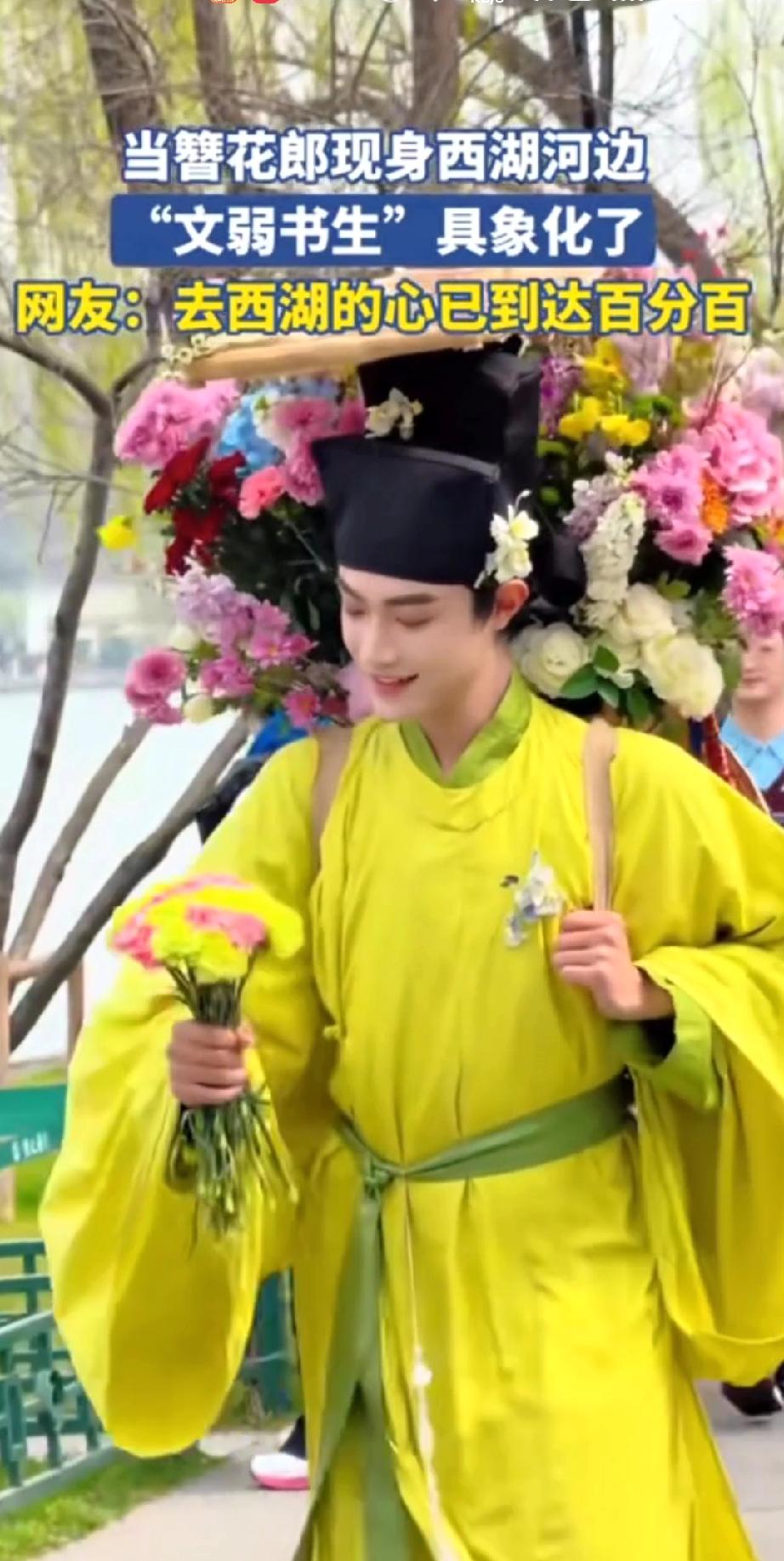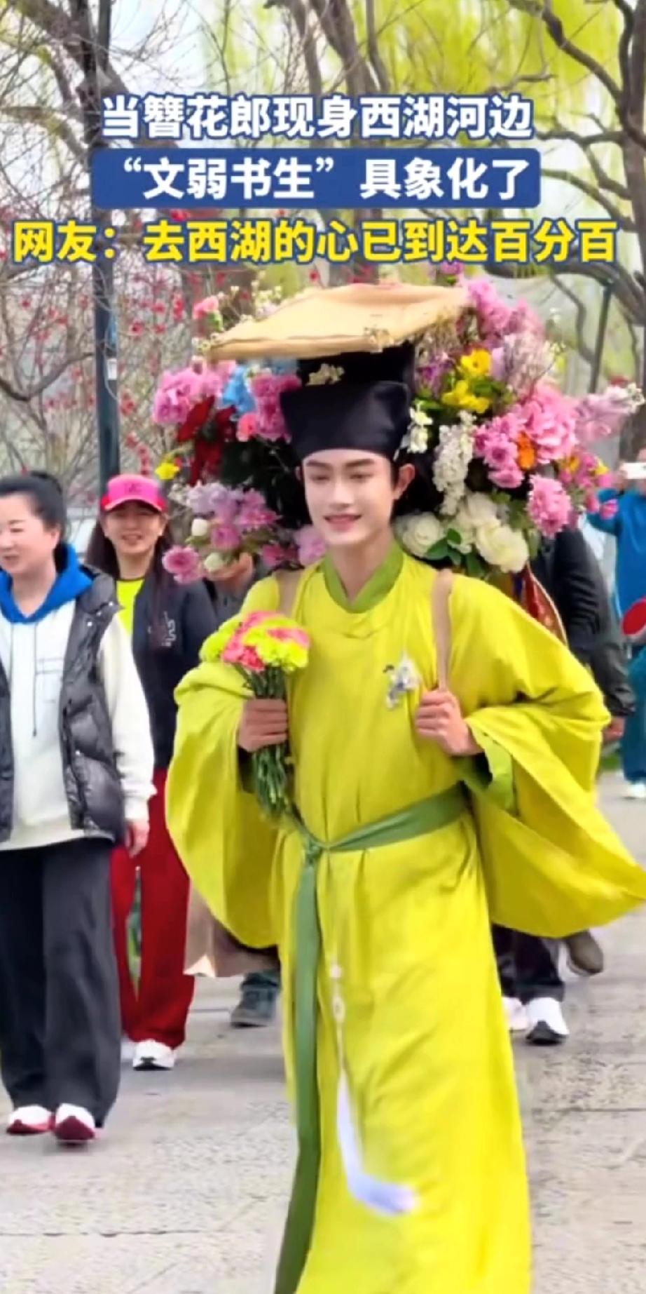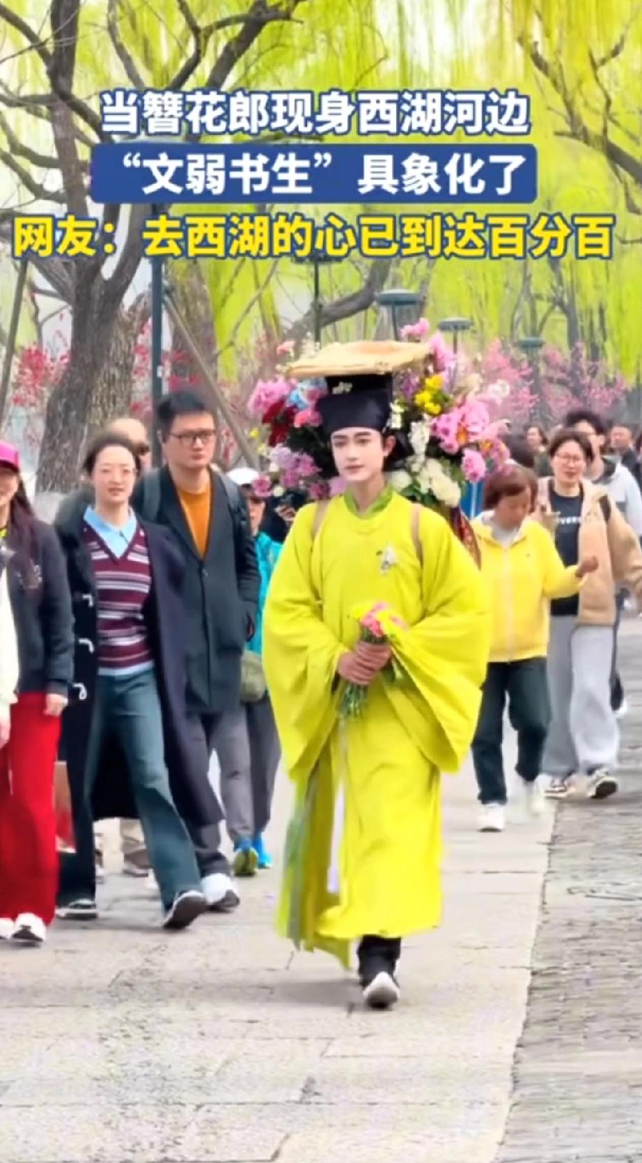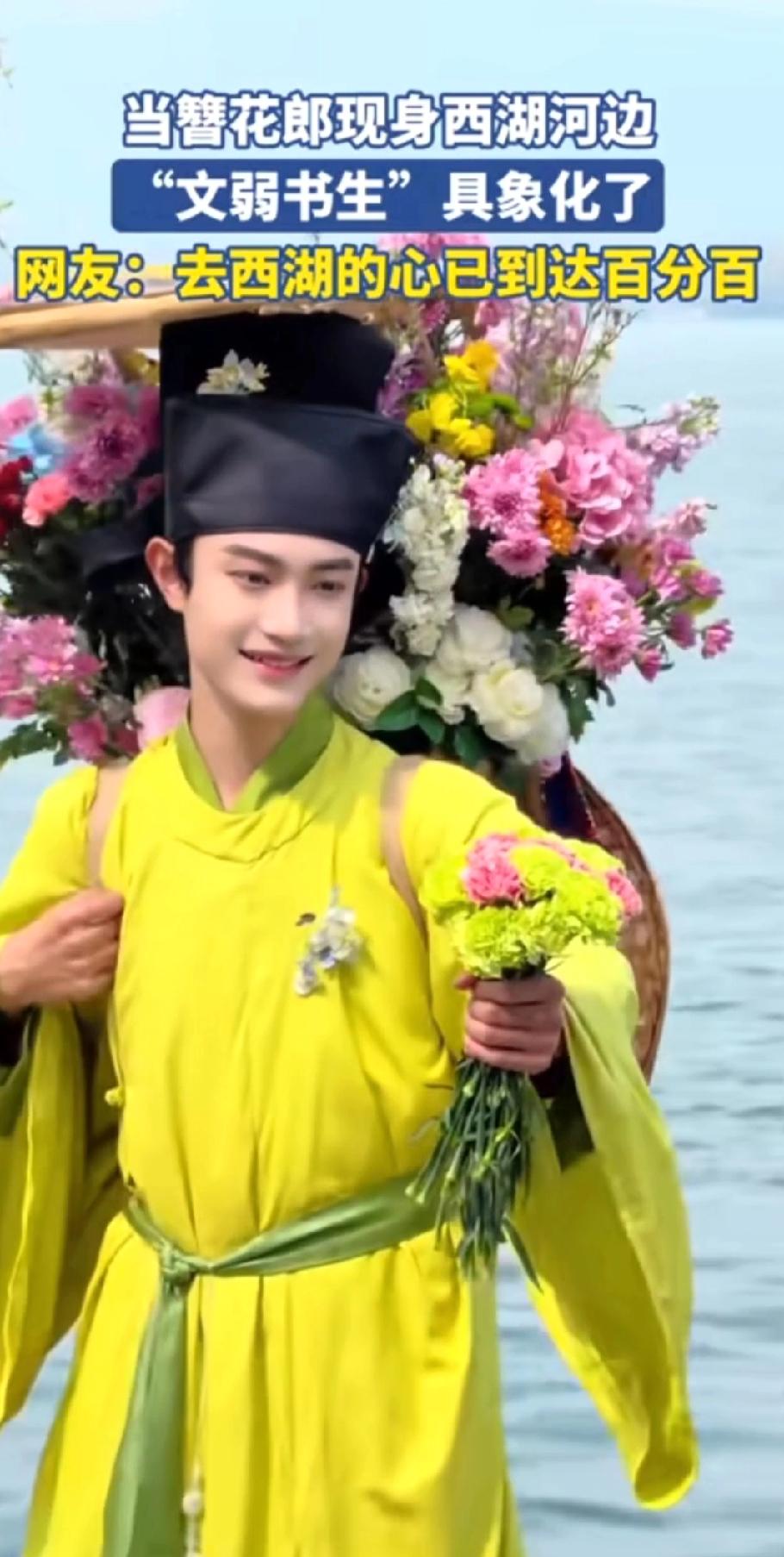 西湖竟有这般美景,还等什么呢?约起来吧! 三月春风拂过杭州西湖,苏堤桃红柳绿,碧波漾着柔光,烟柳画桥,处处是江南温柔。 一位身着素雅古装的书生缓步而来,身形文弱,眉眼温润。身后竹筐盛满鲜艳繁花,樱粉桃白,清香浮动。 他步履潇洒,笑意清朗,遇着游人便递上一枝鲜花,不问姓名,只赠春日欢喜。 路人接过花枝,眉眼舒展,欢声笑语融进湖风里。 这般光景,恍若穿越千年,仿佛置身南宋临安的盛景。 花影,人影,湖光相映,分不清是画中景,还是人间春。 只愿循着花香,奔赴这场西湖之约,把江南的温柔与浪漫,妥帖收藏于心间!