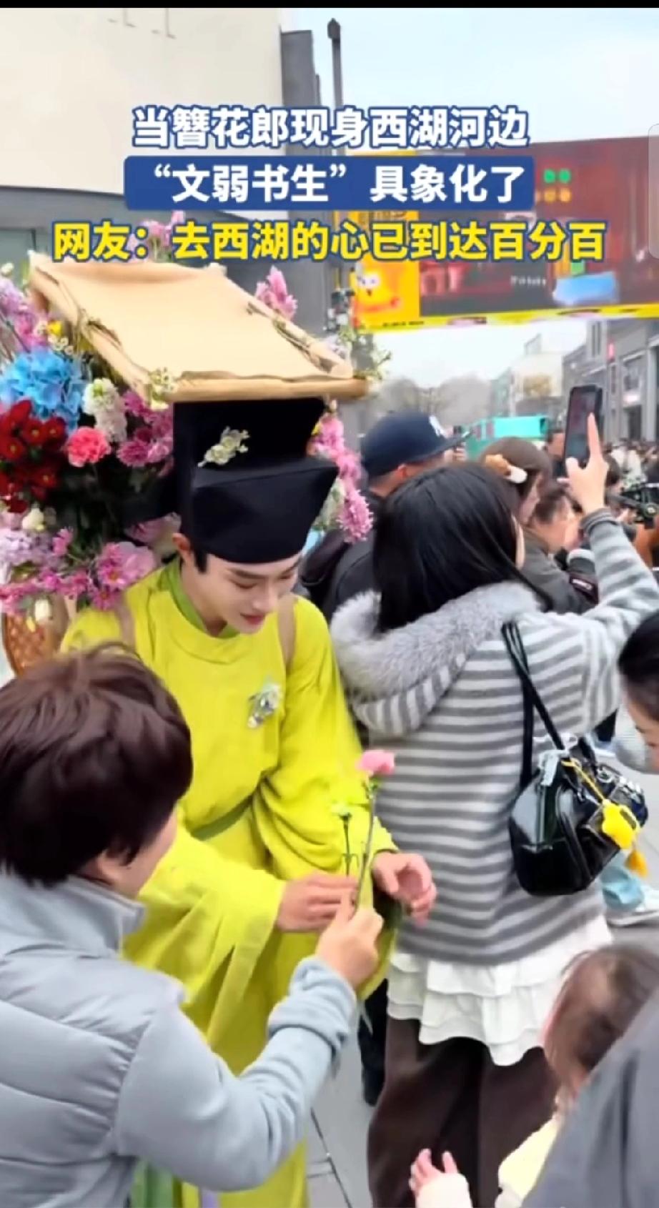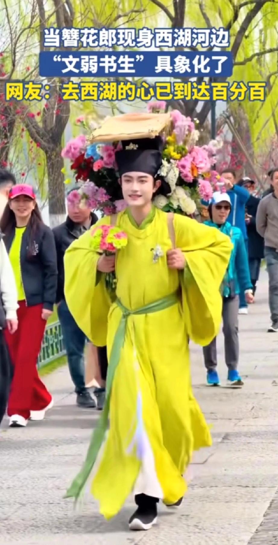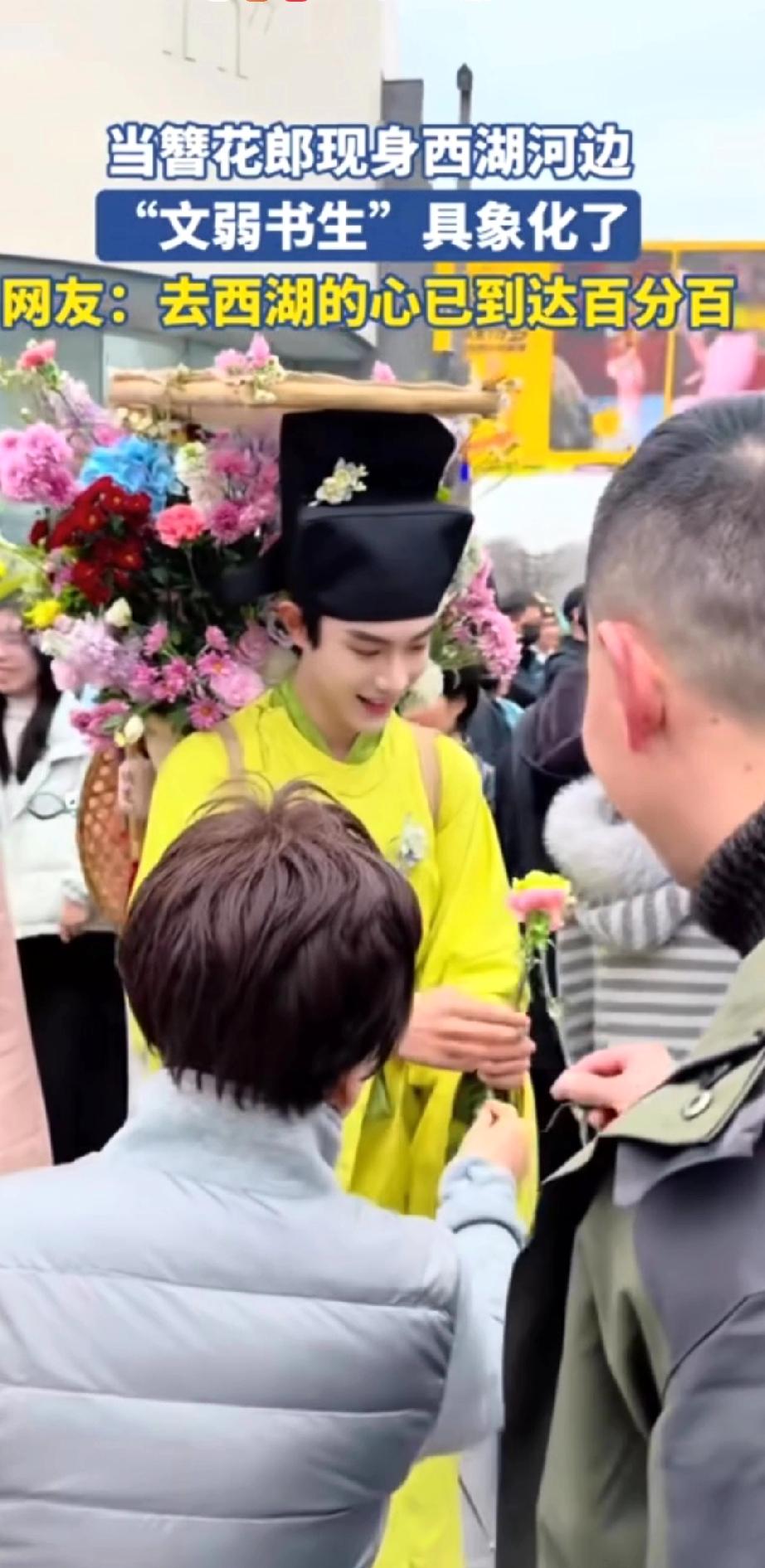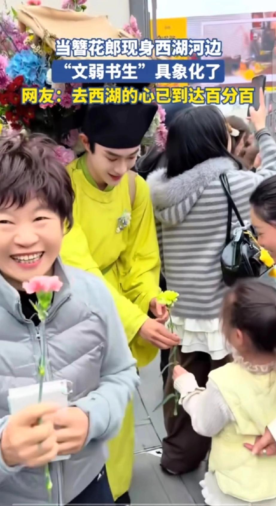 西湖竟有这般美景,还等什么呢?约起来吧! 三月春风拂过杭州西湖,苏堤桃红柳绿,碧波漾着柔光,烟柳画桥,处处是江南温柔。 一位身着素雅古装的书生缓步而来,身形文弱,眉眼温润。身后竹筐盛满鲜艳繁花,樱粉桃白,清香浮动。 他步履潇洒,笑意清朗,遇着游人便递上一枝鲜花,不问姓名,只赠春日欢喜。 路人接过花枝,眉眼舒展,欢声笑语融进湖风里。 这般光景,恍若穿越千年,仿佛置身南宋临安的盛景。 花影,人影,湖光相映,分不清是画中景,还是人间春。 只愿循着花香,奔赴这场西湖之约,把江南的温柔与浪漫,妥帖收藏于心间!
