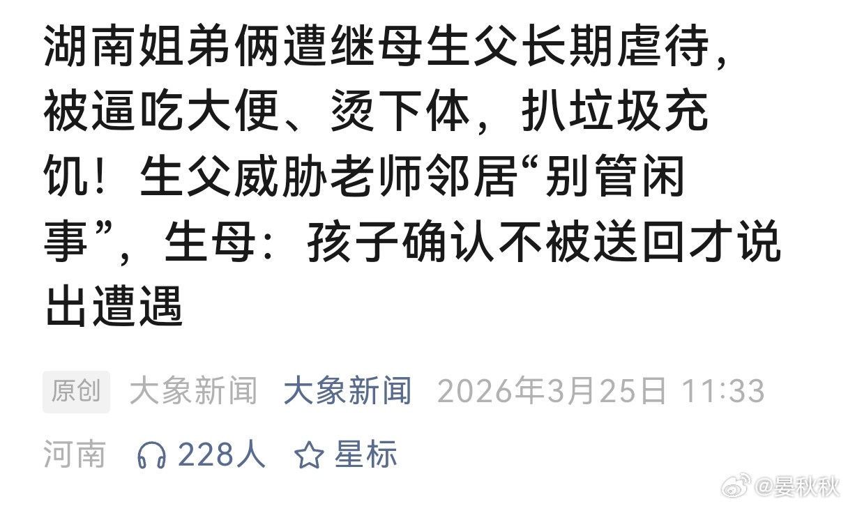弟弟被逼吃大便、被用开水烫下体、全身淤青面积超过体表47%,姐弟两人常饿到去扒垃圾箱……湖南武冈姐弟,被生父和继母虐待五年,这件事令人发指,让人看得心都揪紧了。根据“大象新闻”,起诉书上列举的犯罪事实包括:1、受害人长期处于邋遢、饥饿状态,冬日衣着单薄,多次在垃圾桶翻找食物;2、生父和继母使用扇耳光、用扫把手柄打、用吹风机砸等方式多次殴打、辱骂;3、姐姐头部被打出血到医院缝针;4、故意用70℃左右的热水严重烫伤还在上幼儿园的孩子的下体;5、要求将房间里的屎处理掉,孩子将屎往自己脸部嘴部涂抹等。而相比较虐待本身,更让人无法接受的,是这场持续五年的噩梦,学校老师知道、妇联知道、邻居也知道,却硬是没人能把它停下来。直到千里之外的生母,拼死见到孩子才报警。不是法律不够严(施暴者面临重罚)——而是我们保护孩子的整个“报警”系统,在关键时刻完全失灵了。首先,学校老师多次发现孩子身上有伤,也联系了家长,但被孩子父亲一句“我想怎么管就怎么管”给顶了回来,之后就不敢再深究。其次,周围的邻居们虽然心疼孩子,会给口饭吃,但普遍觉得“别人家的事不好插手”,在施暴家长上门吵闹后,就更不敢出声了。最后,也是最根本的,孩子被判给父亲抚养后,就像进入了一个“黑箱”。生母的探视权被百般阻挠,社区和相关部门也没有定期的回访监督机制,导致虐待可以长期隐藏。所以呢,保护孩子,不能只着眼于“严惩虐待者”,更要解决“系统失灵”的问题。国家法律早就规定了,学校、医院、居委会等发现孩子受侵害必须报告,对知情不报的单位和个人,要依法追究责任。此外,相关部门也要建立便捷的匿名举报平台,以降低“做好人”的成本。说到底,我们不能总在悲剧发生后,才痛心疾首。姐弟被虐数年为何未被阻止姐弟被虐数年监管漏洞在哪晏秋秋