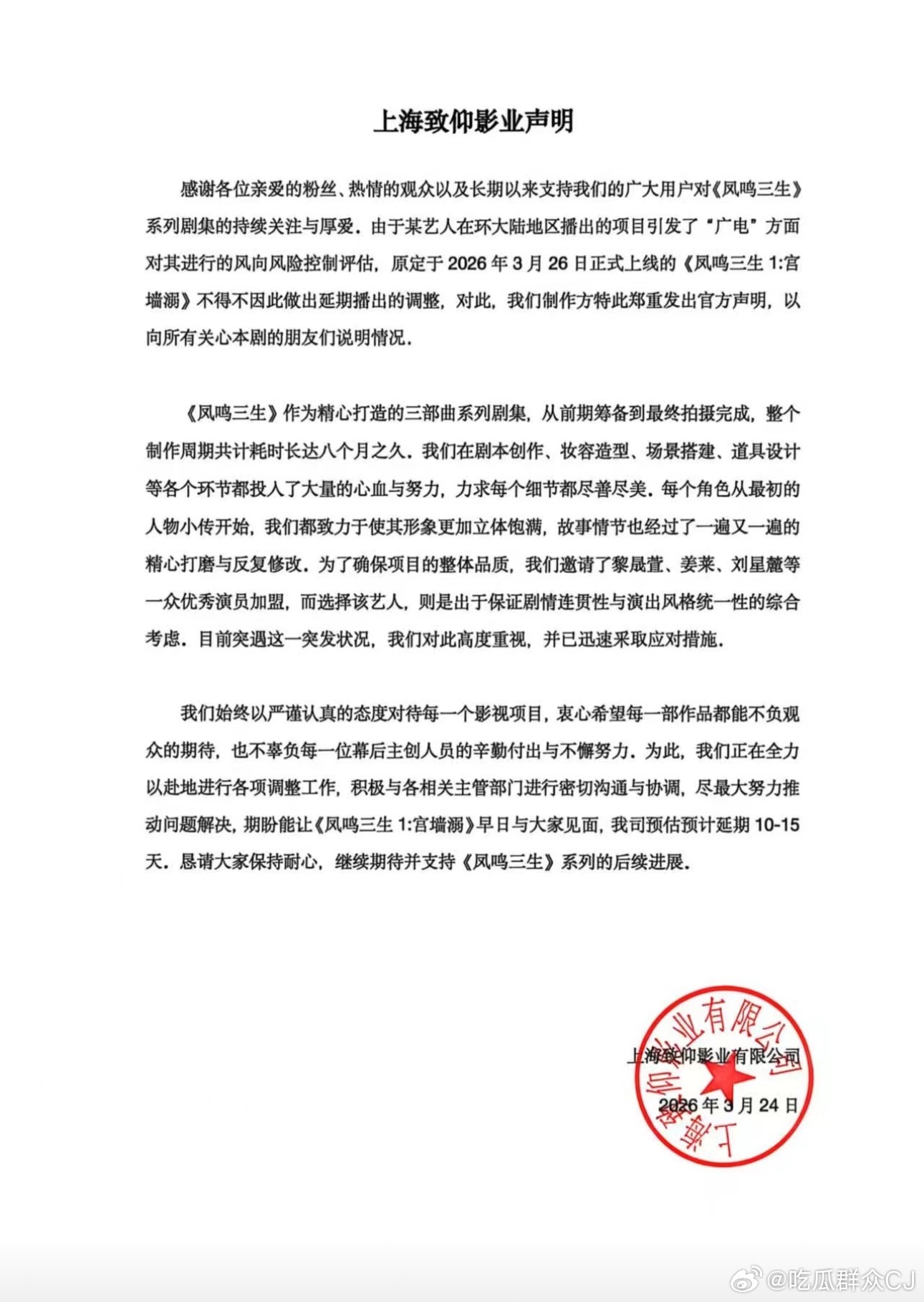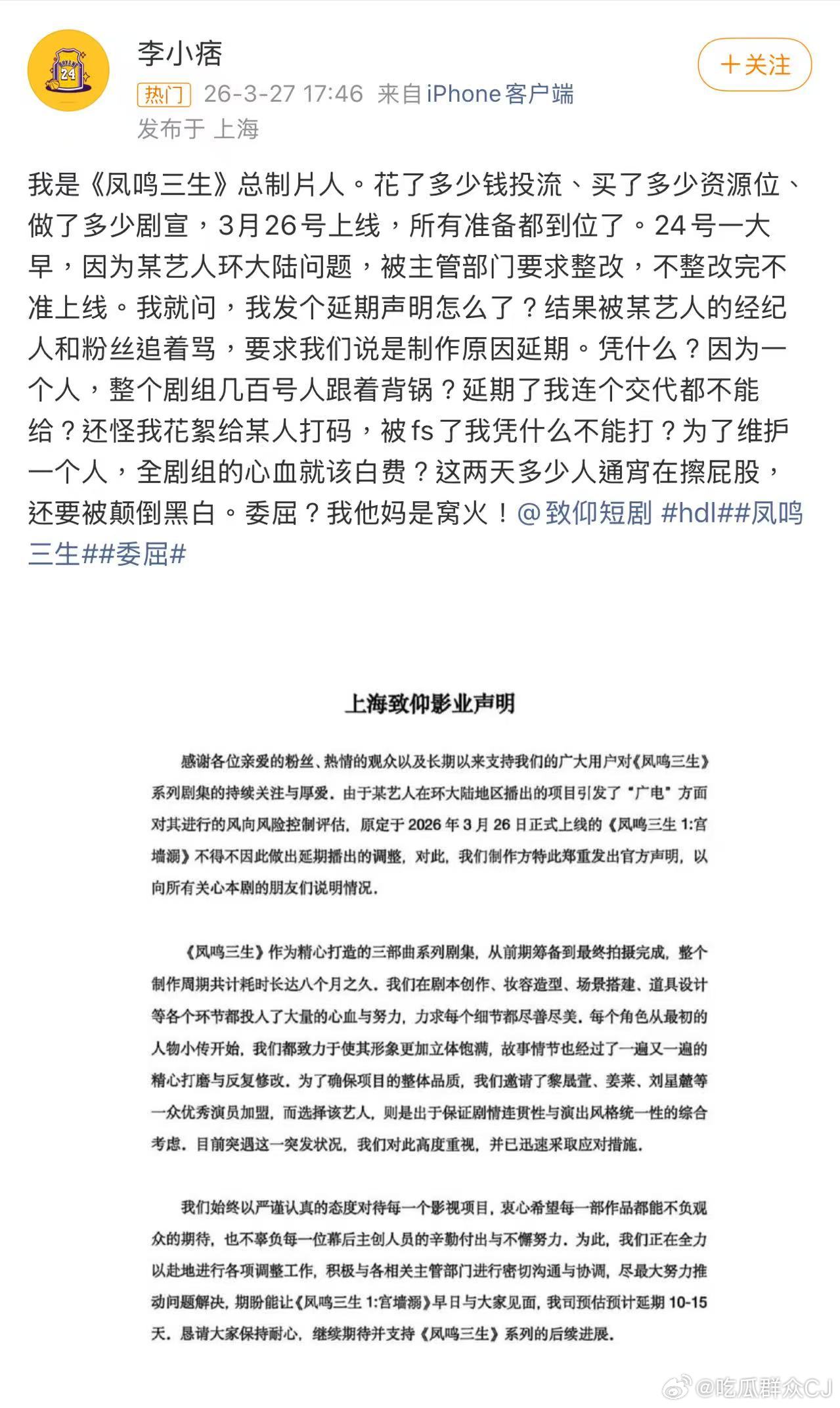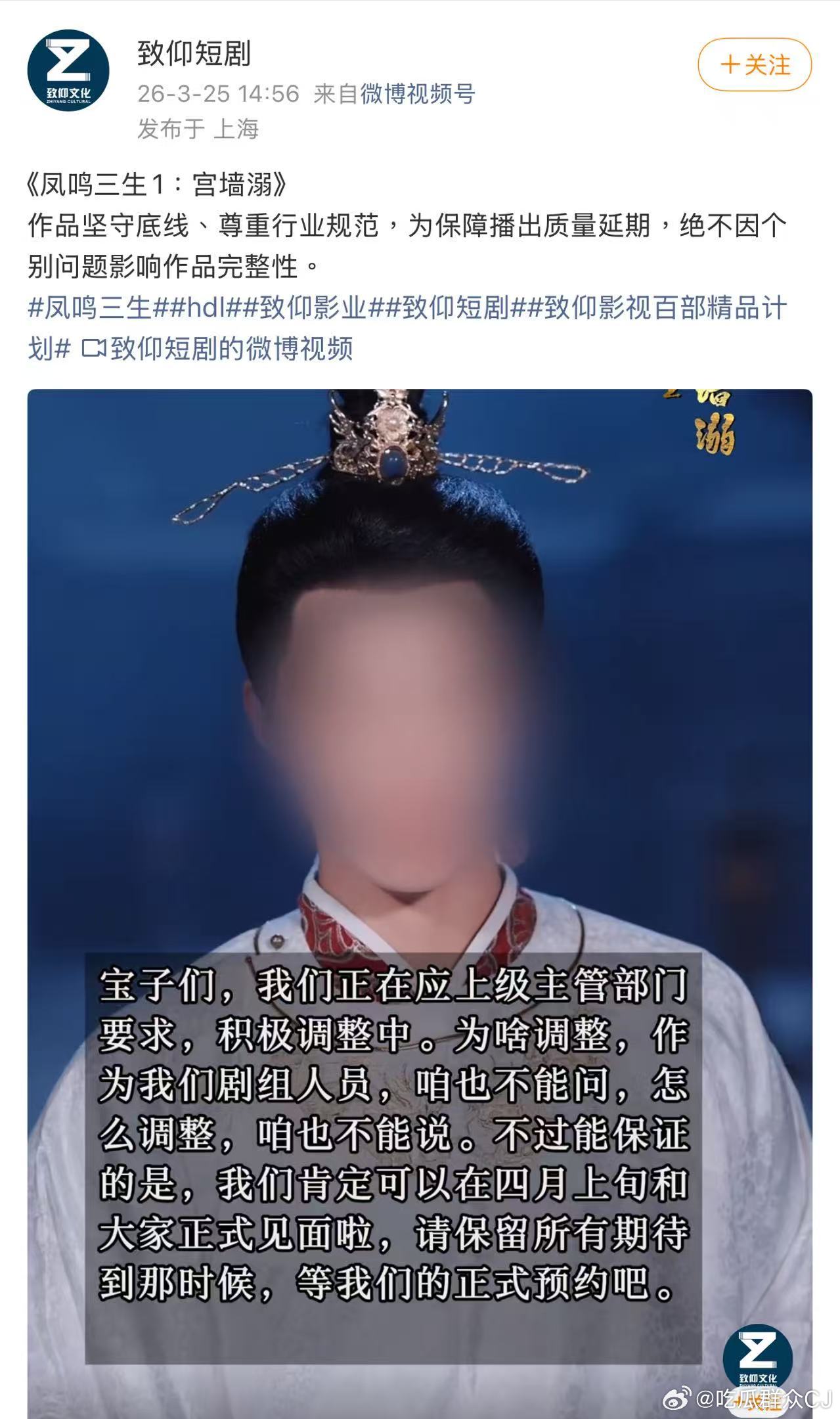 短剧《凤鸣三生》发声明,说用的男演员章明伯环大陆被重点关注了,作品受到波及,要延期播出。