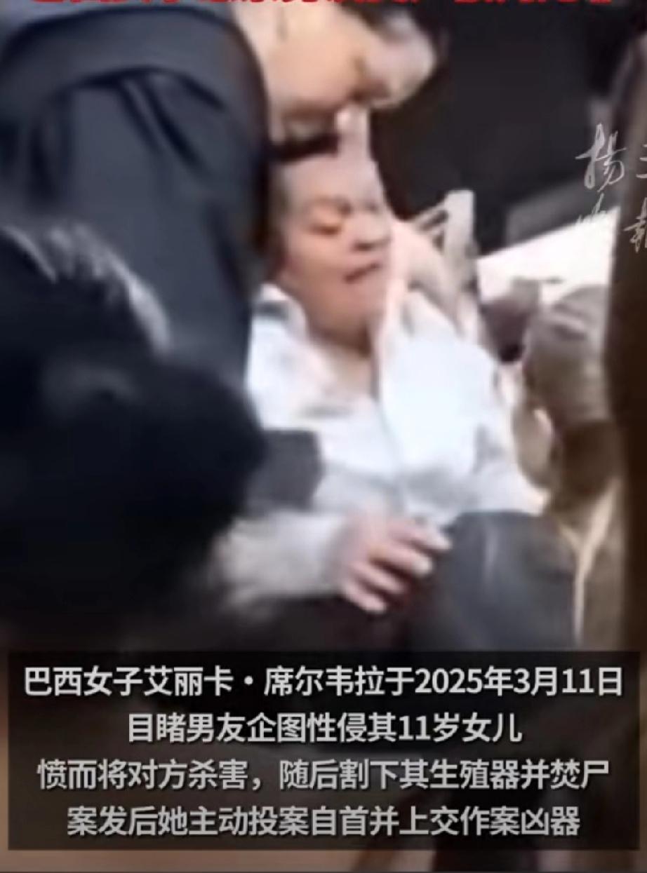 巴西米纳斯吉拉斯州42岁的女子艾丽卡•席尔韦拉是个单亲妈妈,女儿11岁。艾丽卡与自幼相识的47岁的男子埃维顿•席尔瓦发展成为了情人。 埃维顿是个色魔,又把眼光盯上了艾丽卡未成年的女儿,向其发送性骚扰的信息。2025年3月11日凌晨,埃维顿喝醉了,趁着酒劲,闯入了艾丽卡女儿的房间,欲强行性侵。女儿发出尖叫。 艾丽卡被惊醒,冲到女儿的房间看到的一幕,让她怒不可遏。埃维顿对女儿动手动脚,欲实施强暴。她把埃维顿拖至客厅,用刀连续捅刺,又用木棍殴打,致其死亡。邻居少年听到动静来查看,艾丽卡叫其帮忙,移到附近荒地焚烧。 案发后,艾丽卡向警方自首。检方指控她构成加重杀人罪、毁尸罪及教唆未成年人犯罪等多项罪名。 案件开庭审理,陪审团栽定她无罪。认定她属于正当防卫及情绪失控下的保护性举动。3月25日,法官据此宣告,指控不成立,艾丽卡当庭获释。 女儿险遭性侵 巴西母亲怒杀男子获释